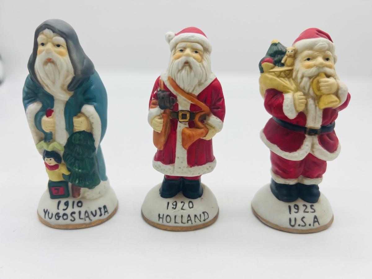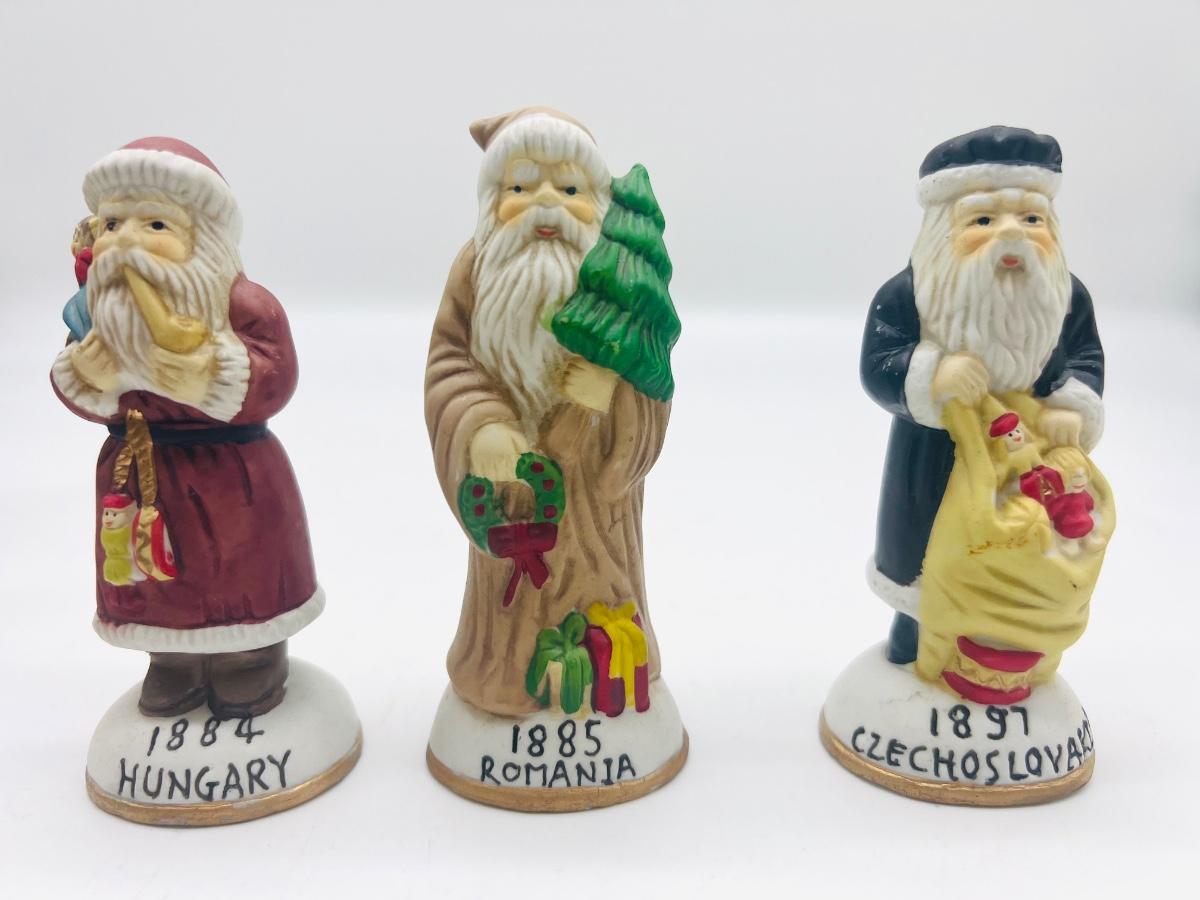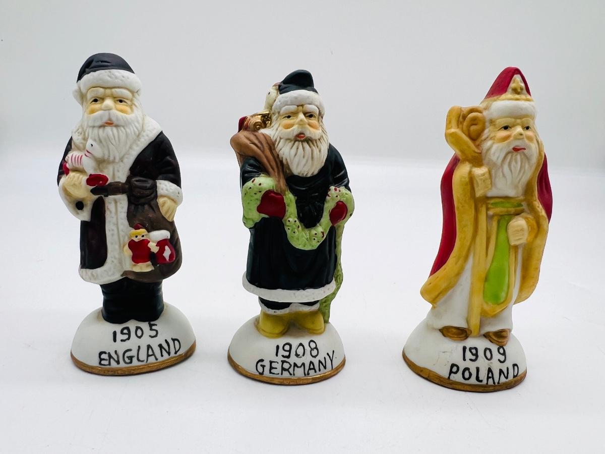 Santas From Around the World Germany Christmas Figurine. 12 total. And painted porcelain. Each Santa measures approximately 5 inches tall. One Santa looks as though it has been repaired, see picture.
