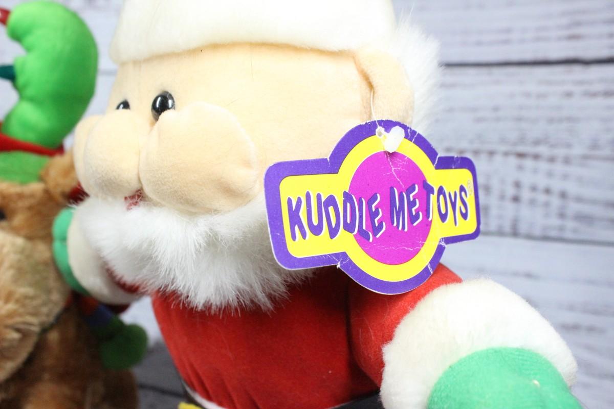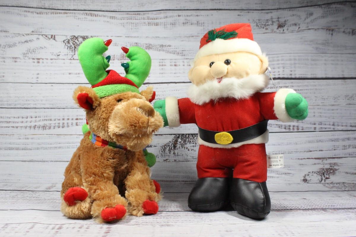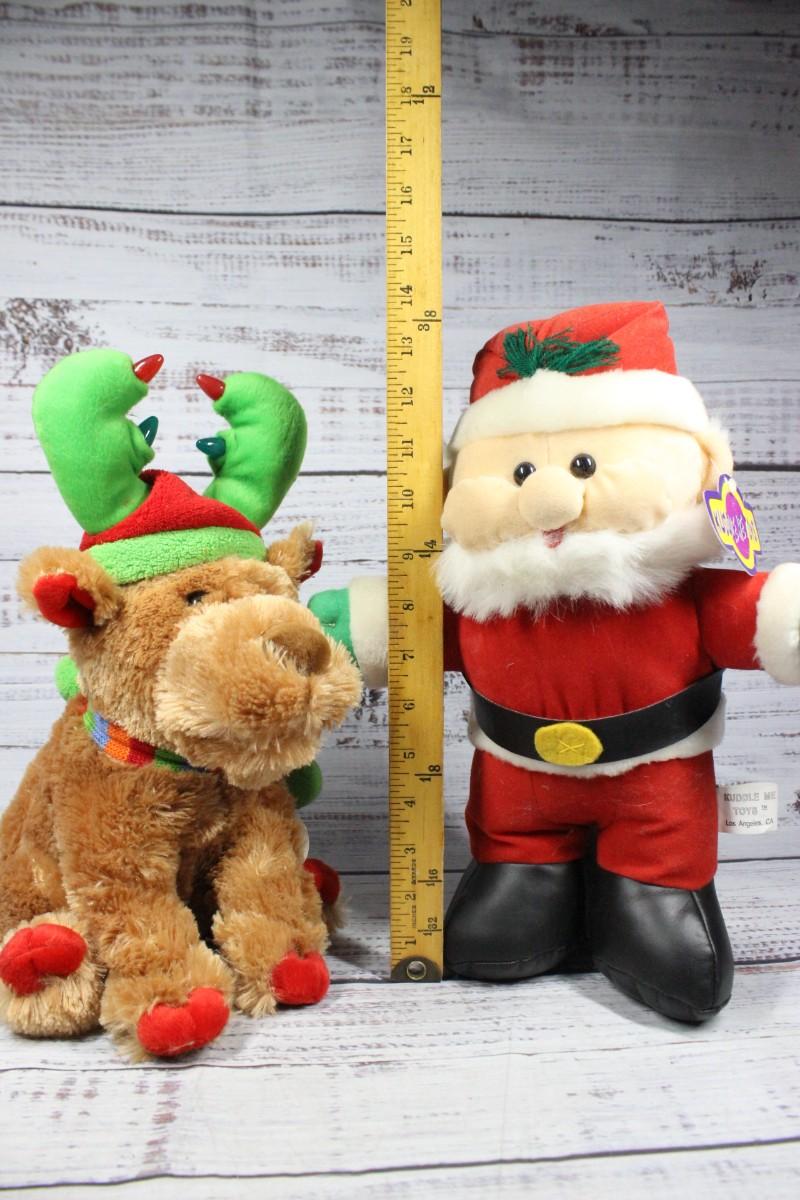 Santa and Reindeer Christmas Plushies, there's no significant rips or tears to any of the plushies and is in good condition. The reindeer has an electronic music box that does not work and in need of new batteries. Check pictures for more details.