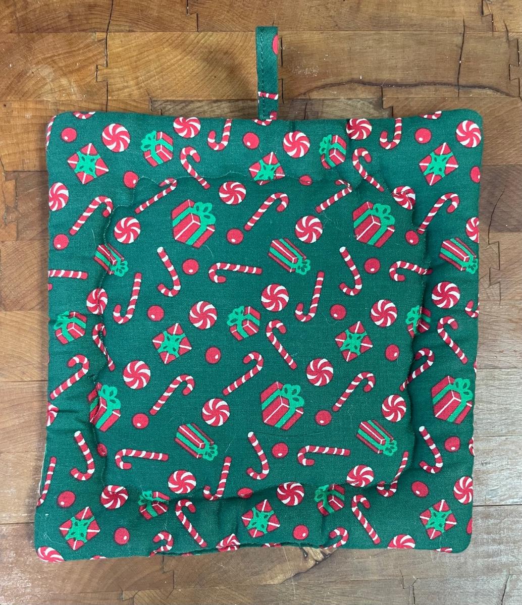 7" x 7" square. Has a loop for hanging. Great as Christmas decor or could be used as an actual hot pad.