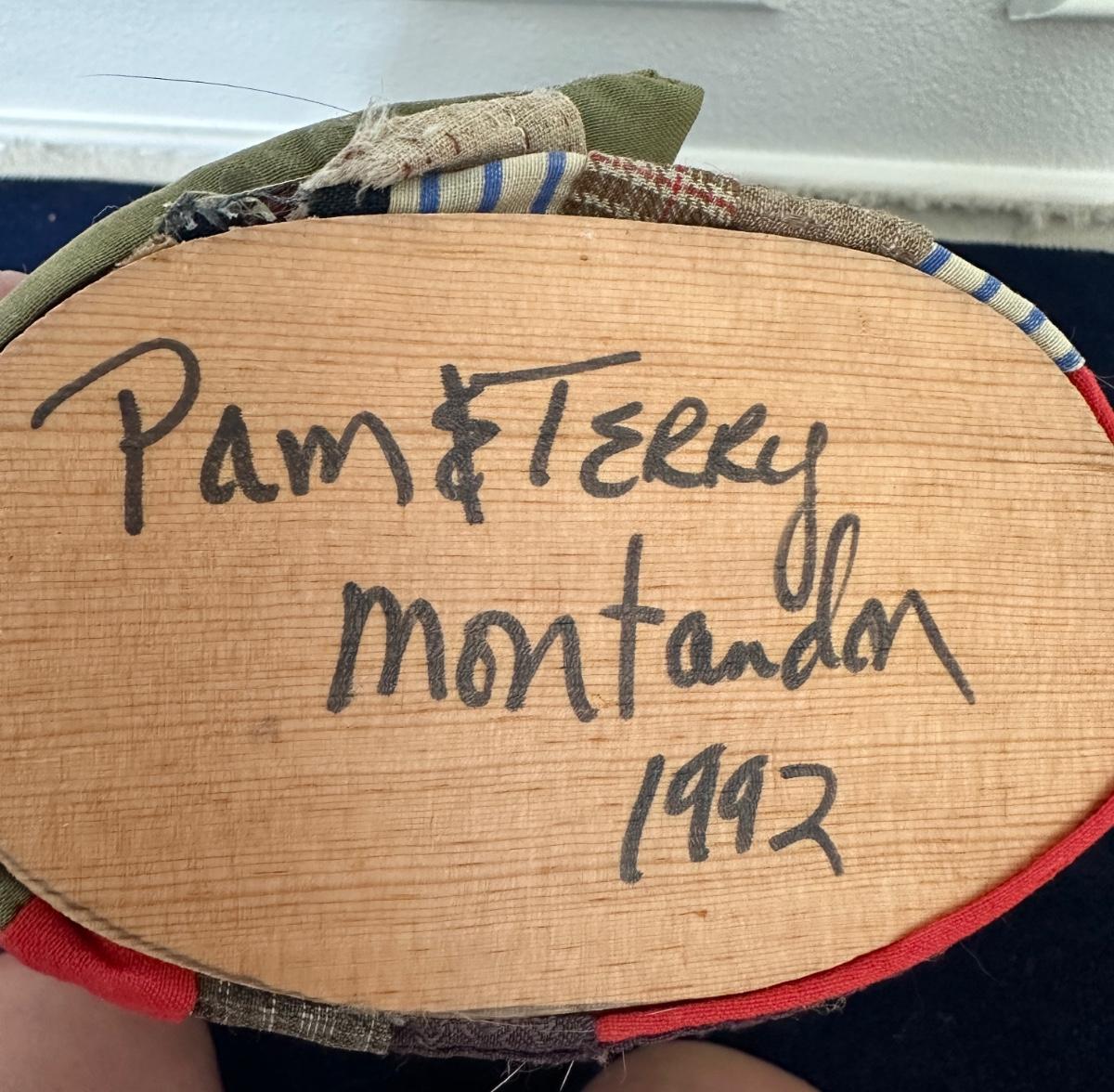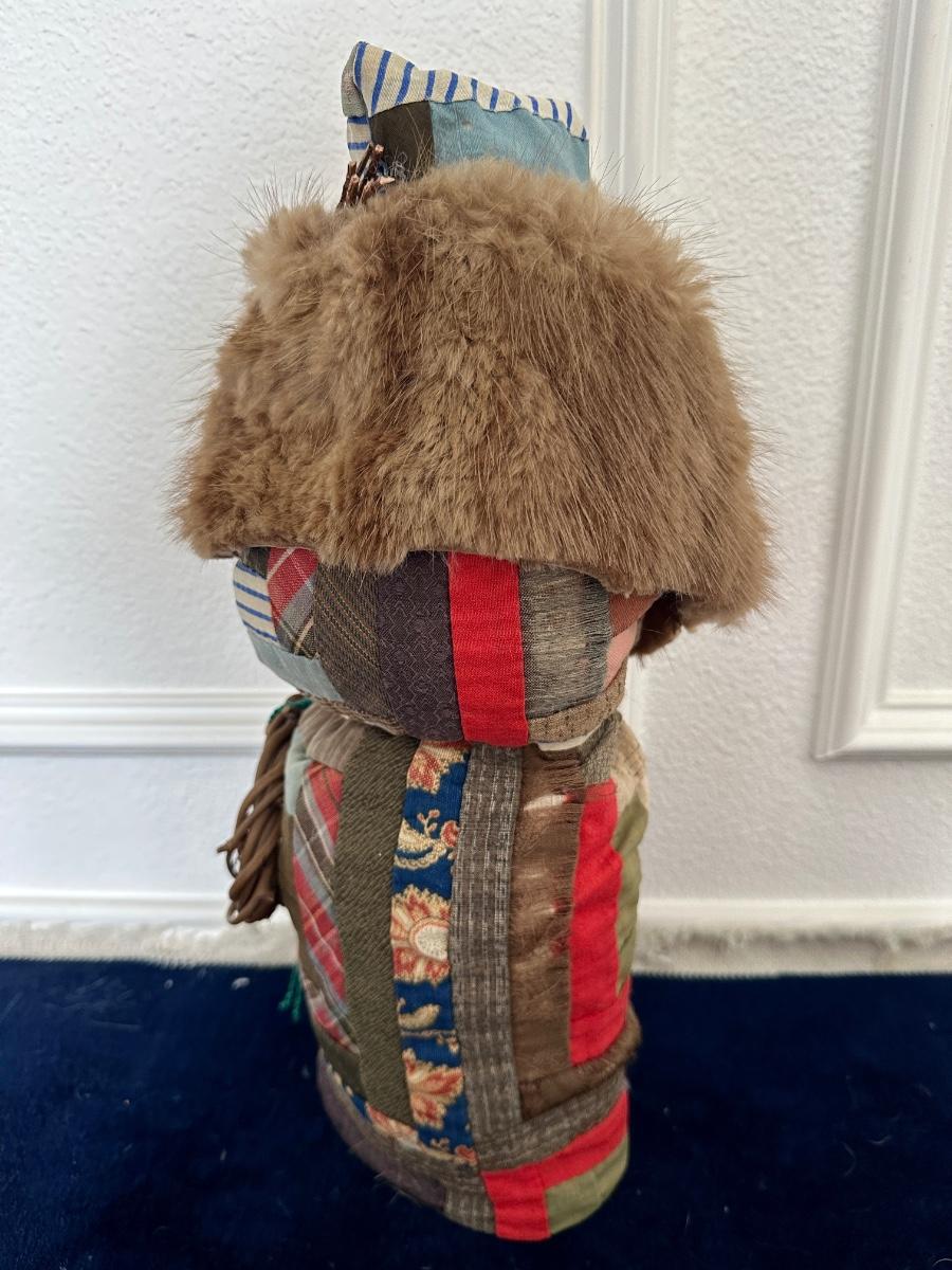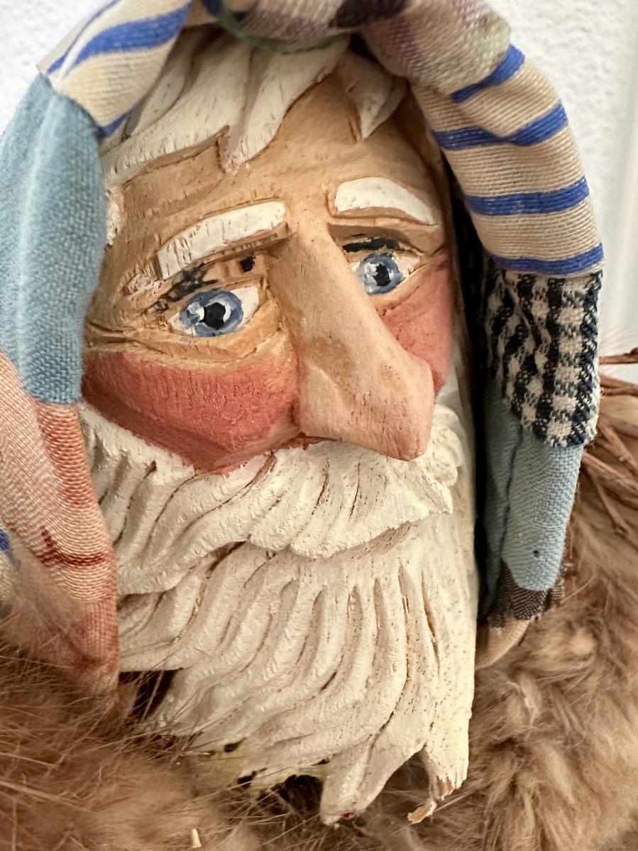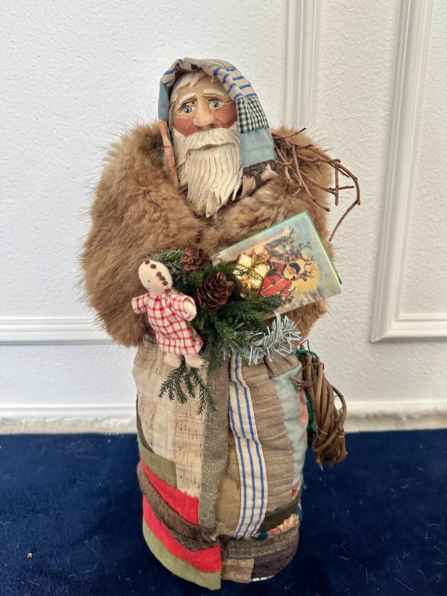 Santa is dressed in quilted calico robe, trimmed in real fur.