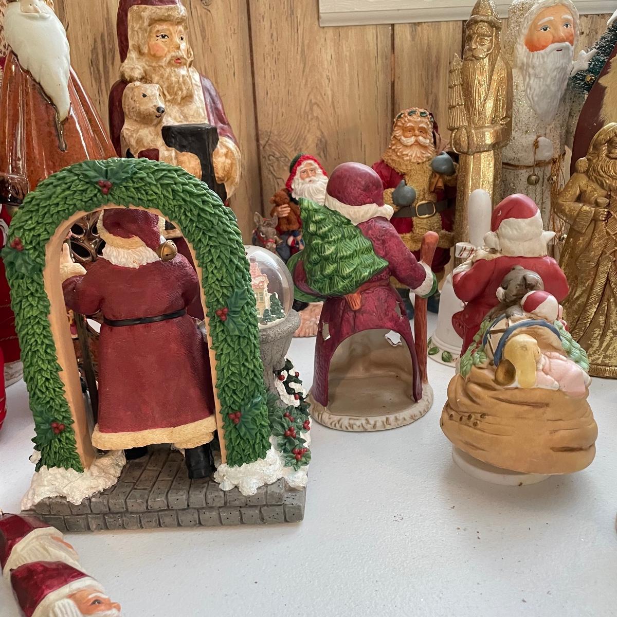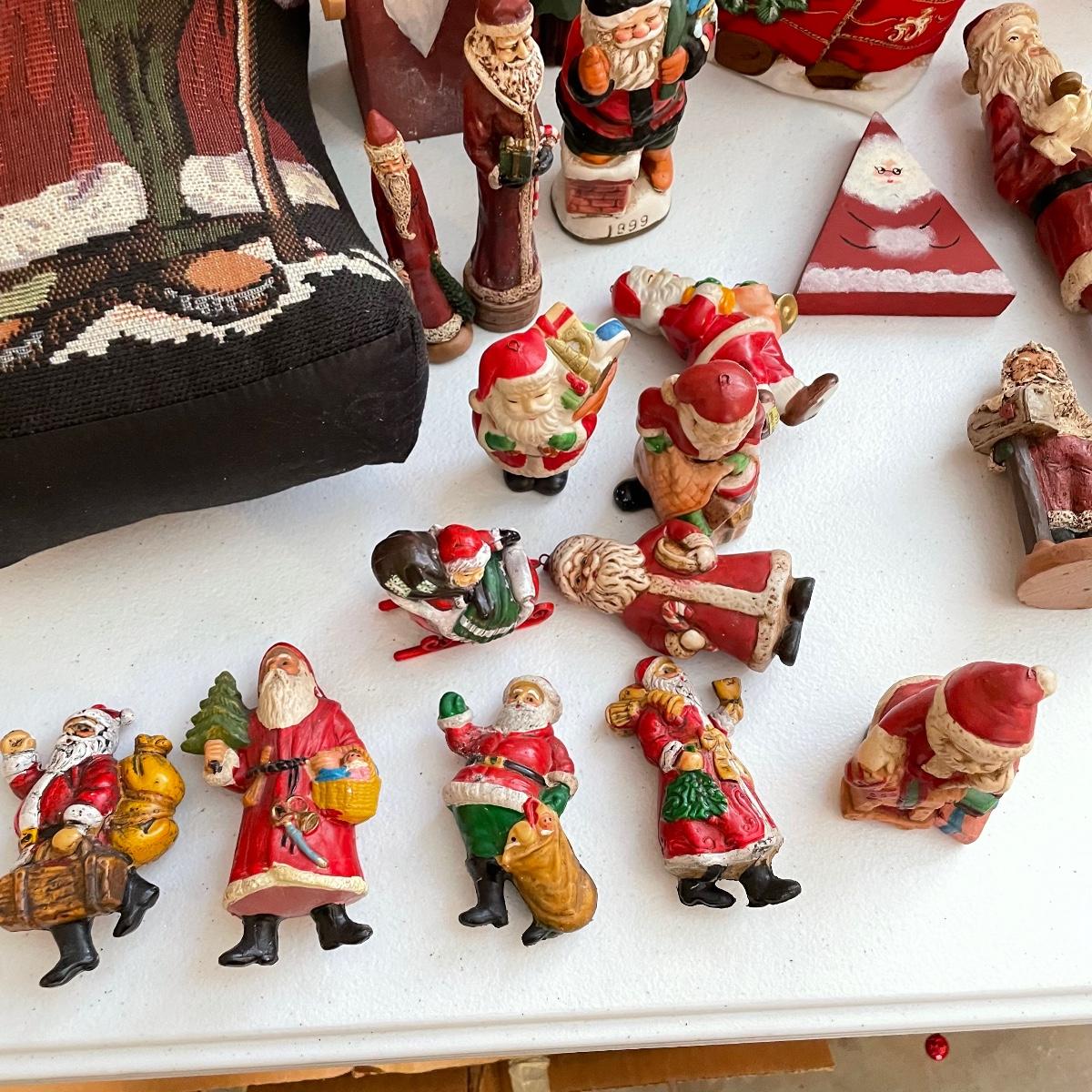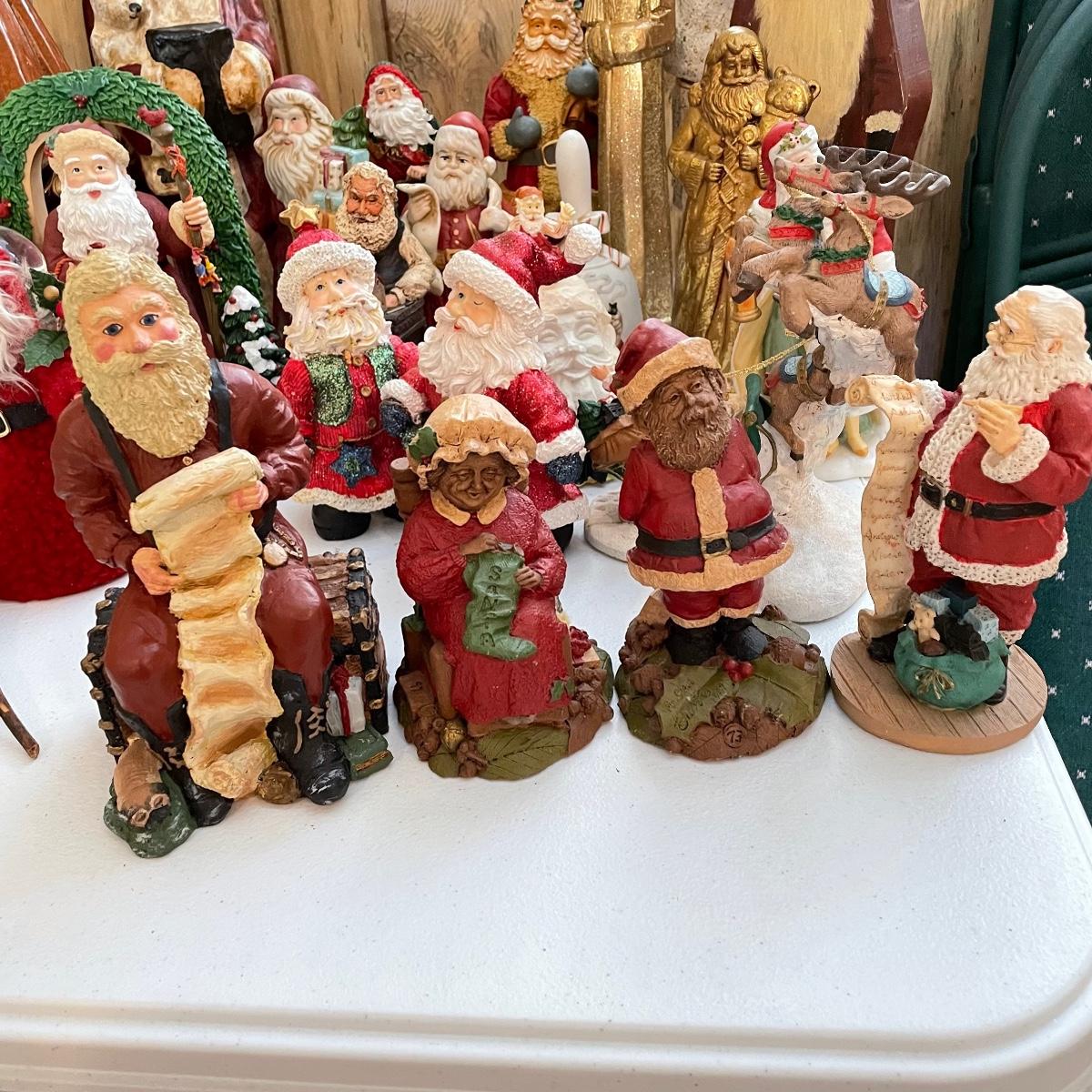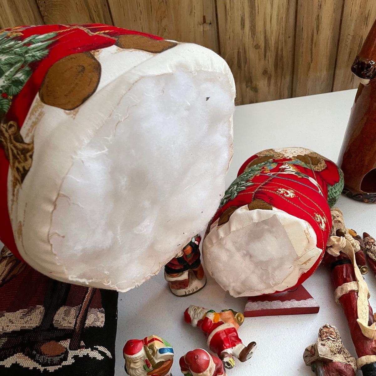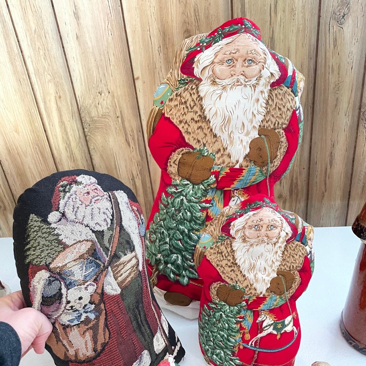 Huge selection of Santas to brighten up your holiday season! Santas are made from a variety of materials like resin, wood, porcelain and more. One music box with Santa holding a bell plays “Santa Claus is Coming to Town”. There is on other cute musical figurine, this piece plays a tune, but extremely slowly. Two first editions from Goebel’s Mark Klaus Kollection. Mr. & Mrs. Claus by Tom Clark, and other signed Santas. See images. The tallest pillow is 18”. The black pillow is weighted. Local pick up only.