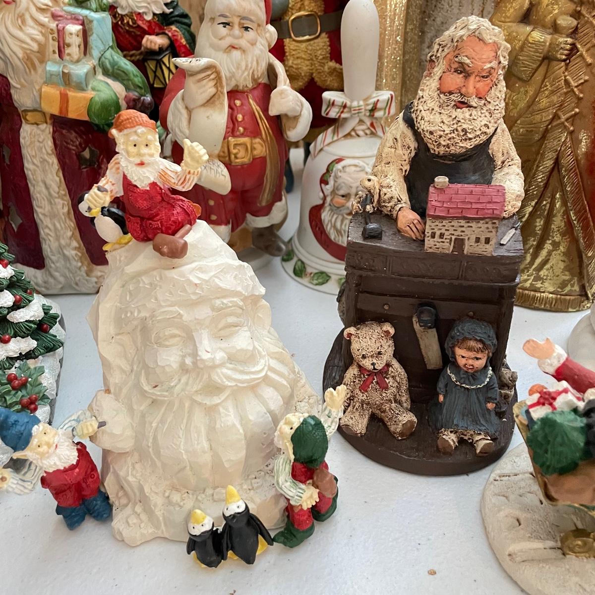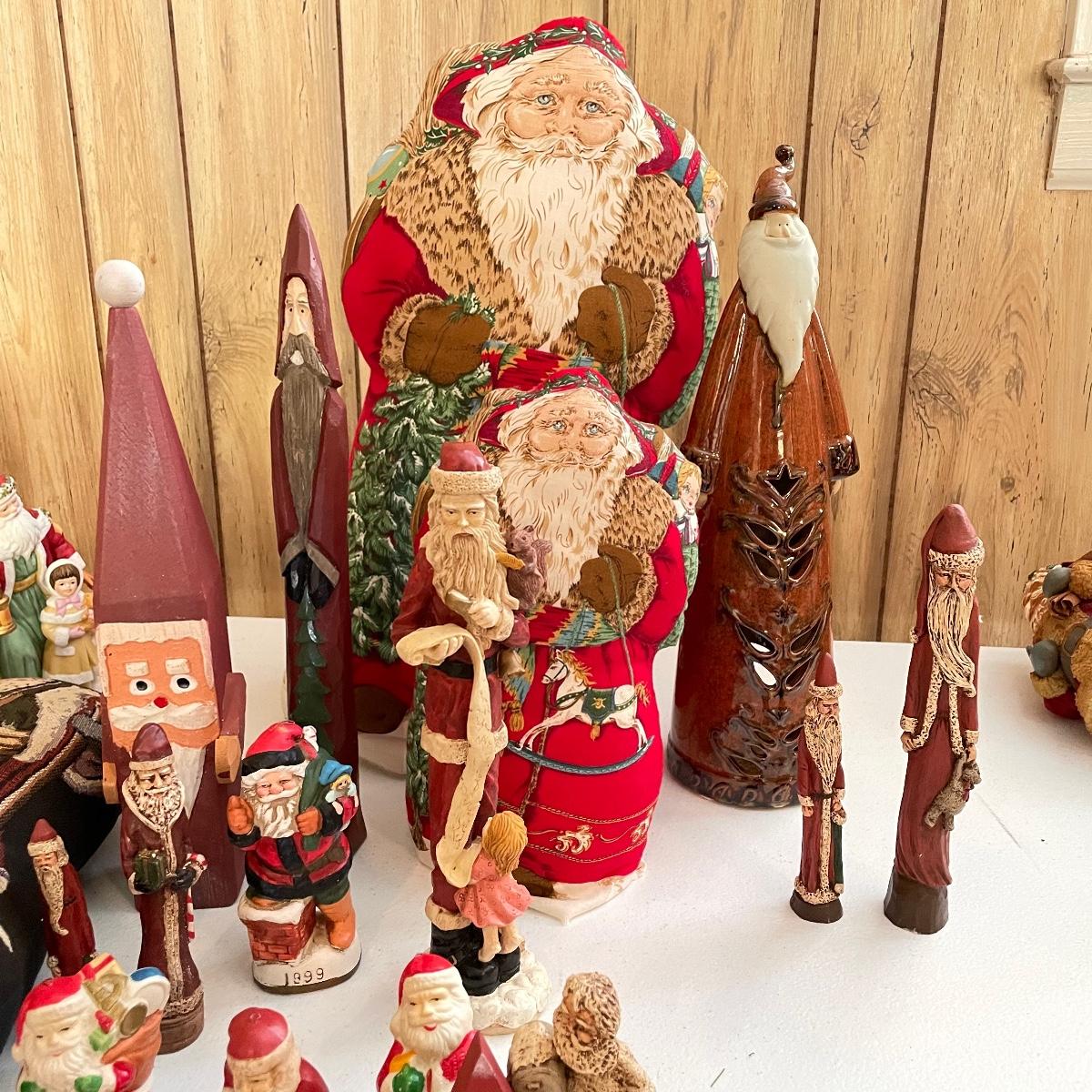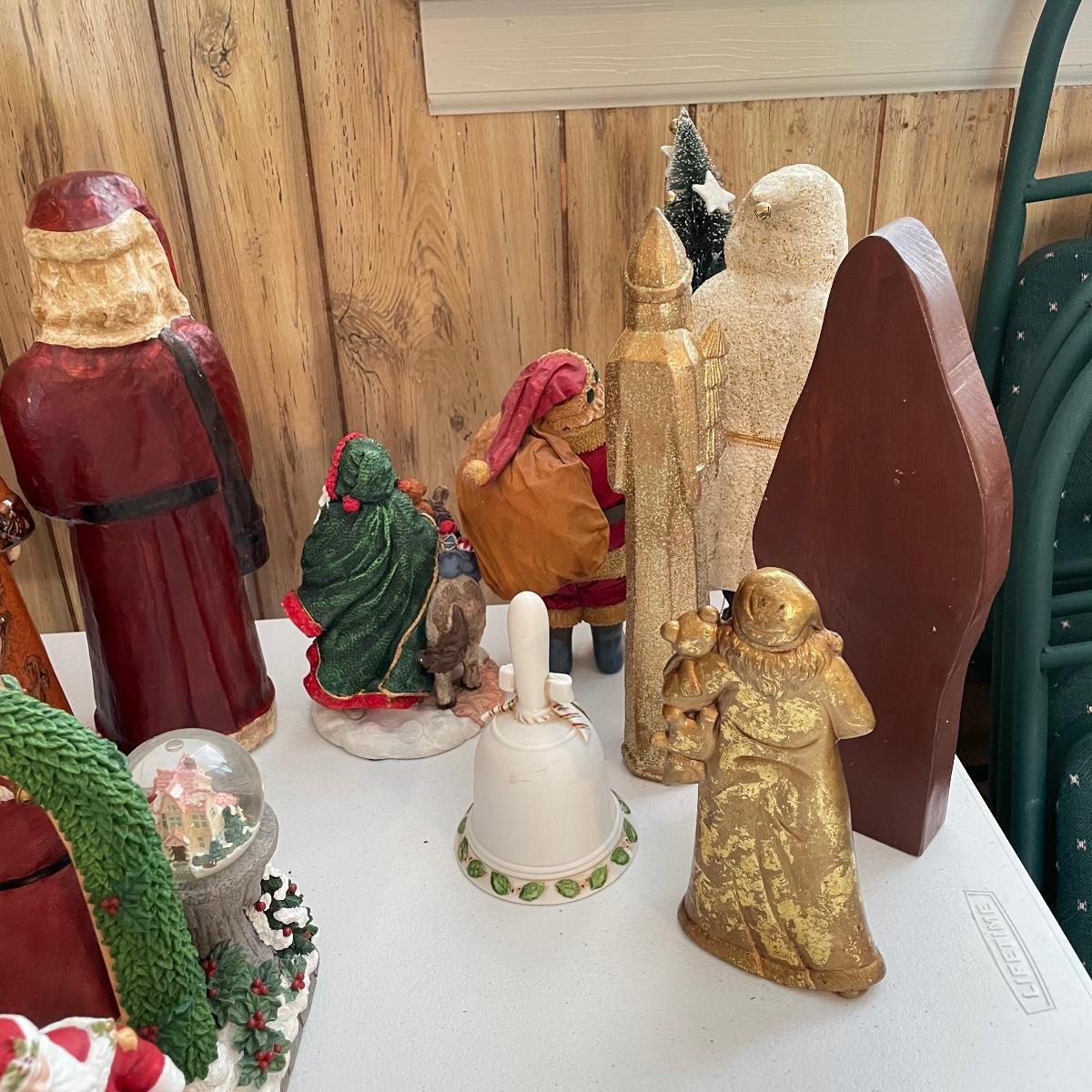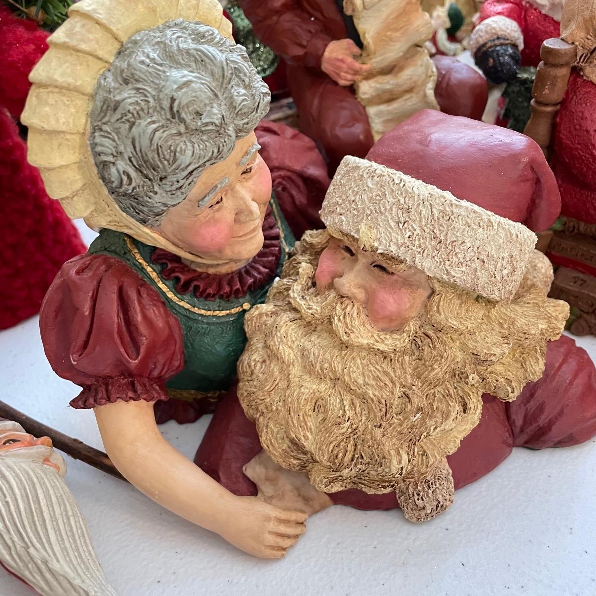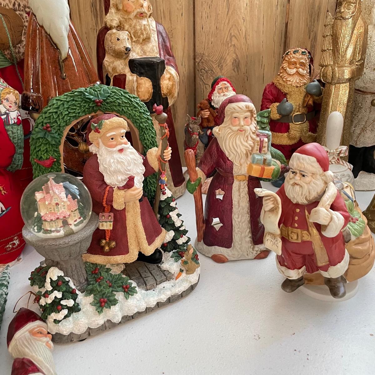 Huge selection of Santas to brighten up your holiday season! Santas are made from a variety of materials like resin, wood, porcelain and more. One music box with Santa holding a bell plays “Santa Claus is Coming to Town”. There is on other cute musical figurine, this piece plays a tune, but extremely slowly. Two first editions from Goebel’s Mark Klaus Kollection. Mr. & Mrs. Claus by Tom Clark, and other signed Santas. See images. The tallest pillow is 18”. The black pillow is weighted. Local pick up only.