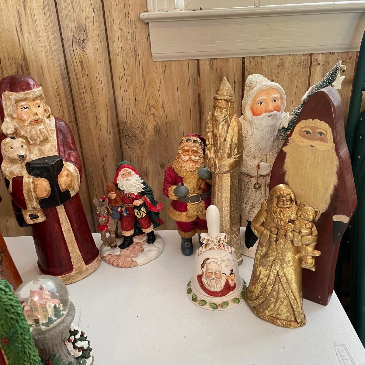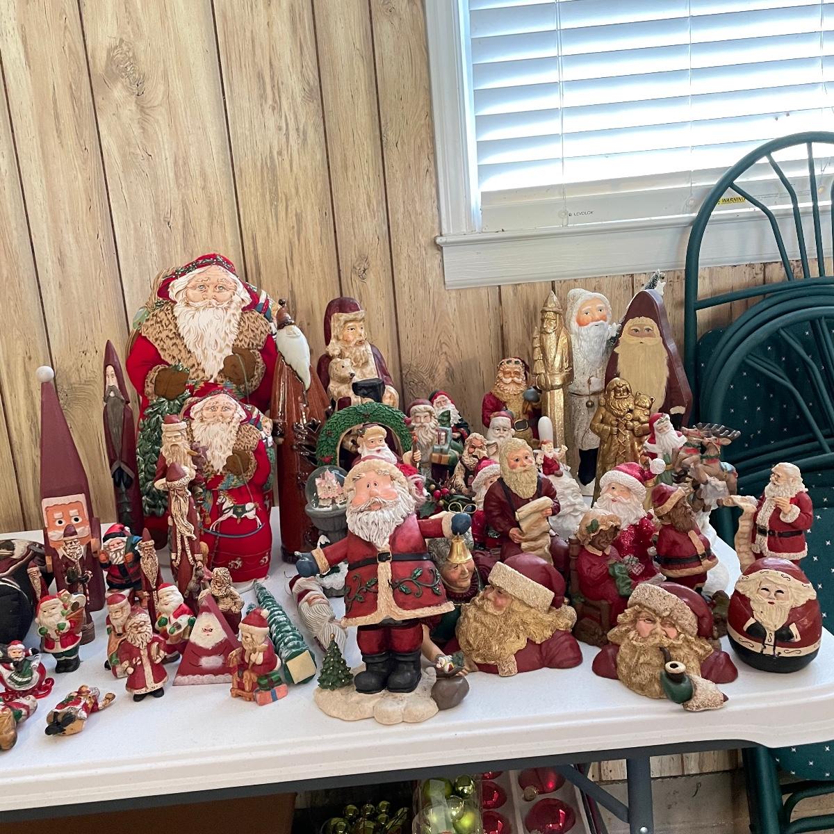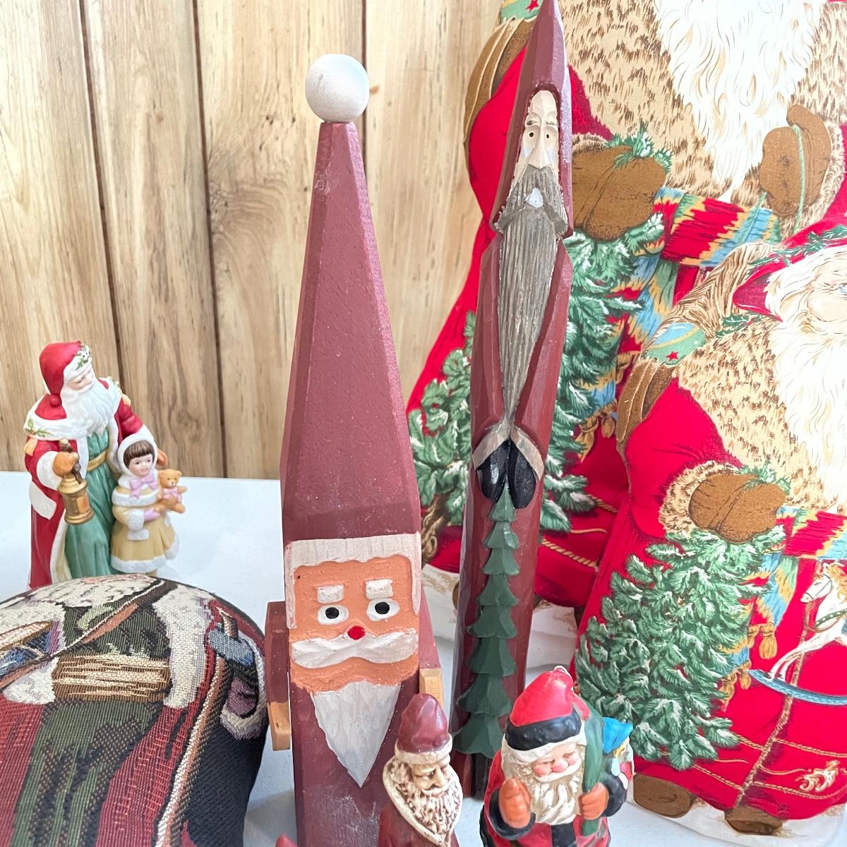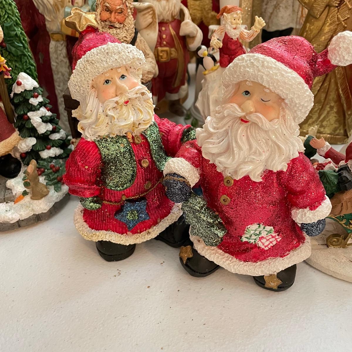 Huge selection of Santas to brighten up your holiday season! Santas are made from a variety of materials like resin, wood, porcelain and more. One music box with Santa holding a bell plays “Santa Claus is Coming to Town”. There is on other cute musical figurine, this piece plays a tune, but extremely slowly. Two first editions from Goebel’s Mark Klaus Kollection. Mr. & Mrs. Claus by Tom Clark, and other signed Santas. See images. The tallest pillow is 18”. The black pillow is weighted. Local pick up only.