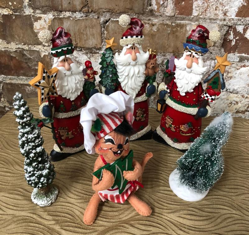 More great display items in this holiday lot of three wise Santas and a plush annalee doll mouse...frosty trees too...