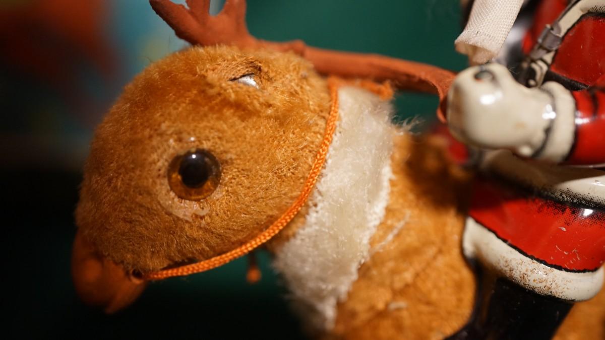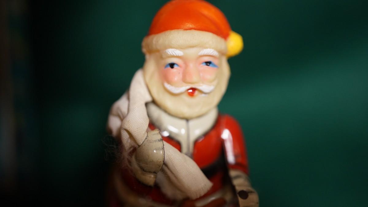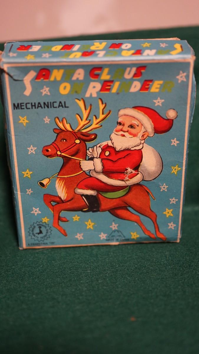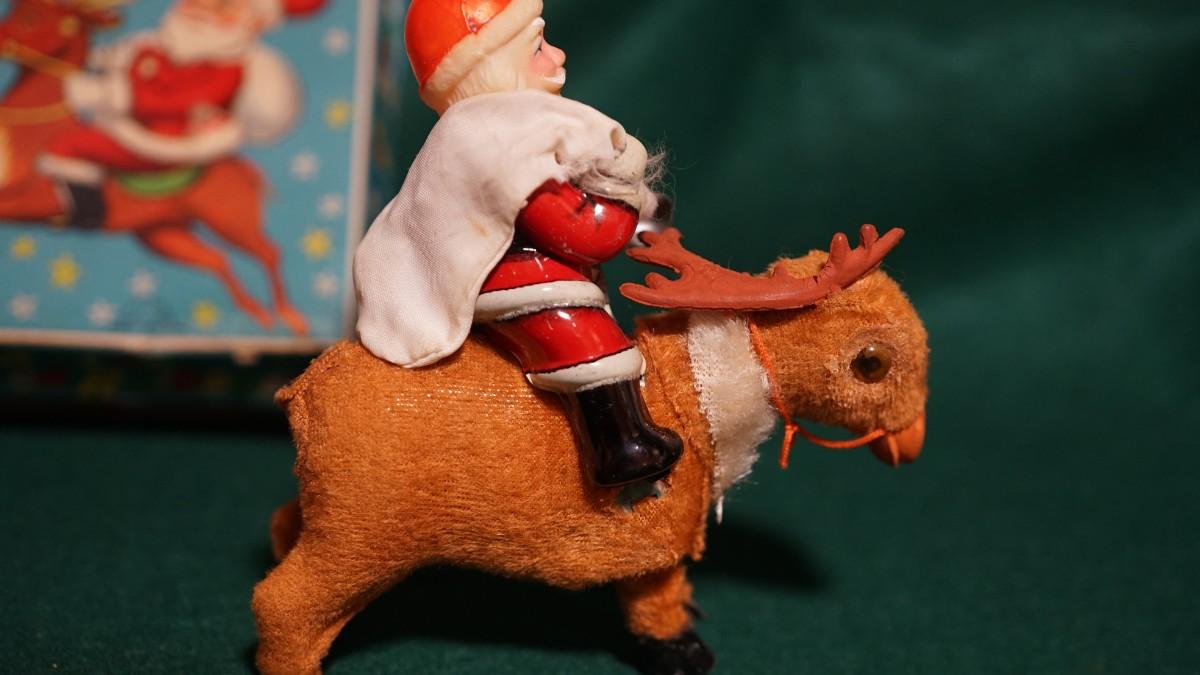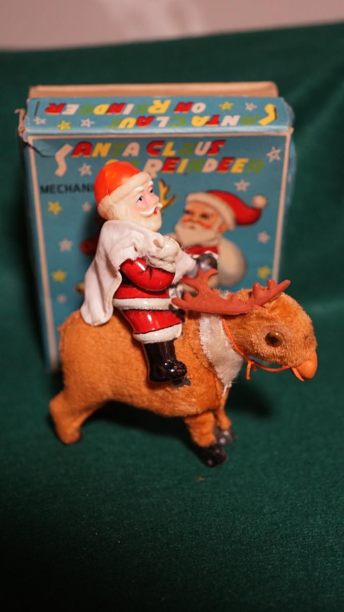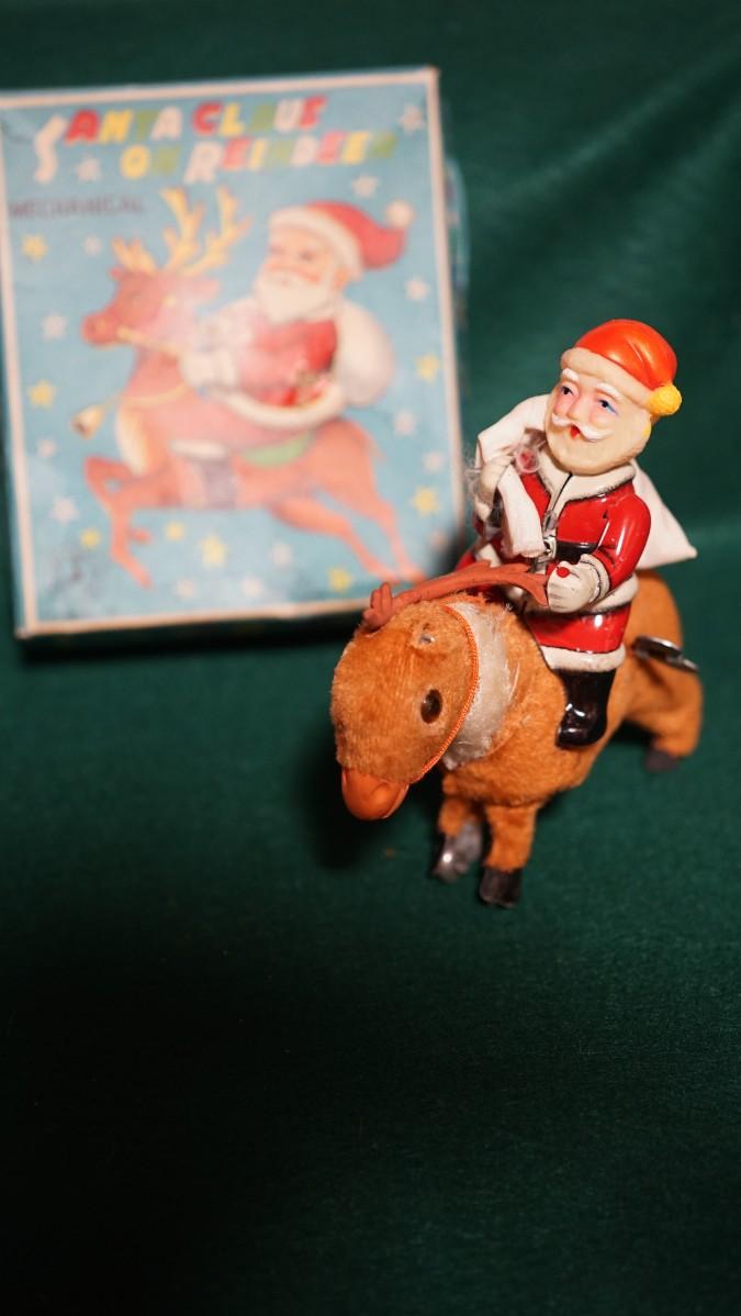 Made in Japan a mechanical toy of santa claus on reindeer.