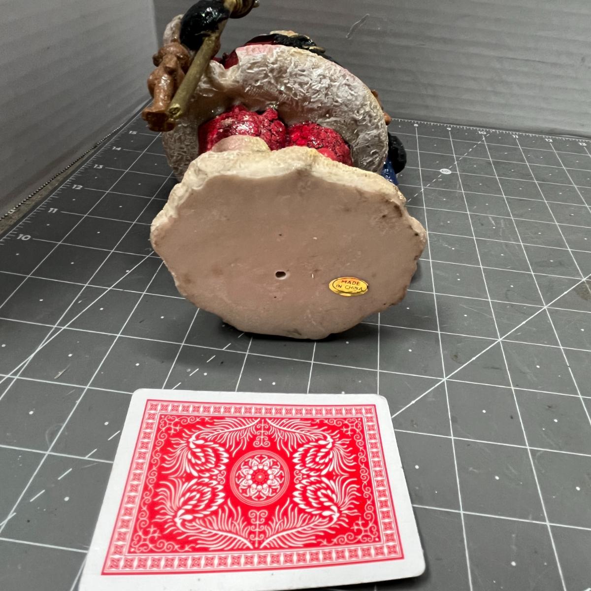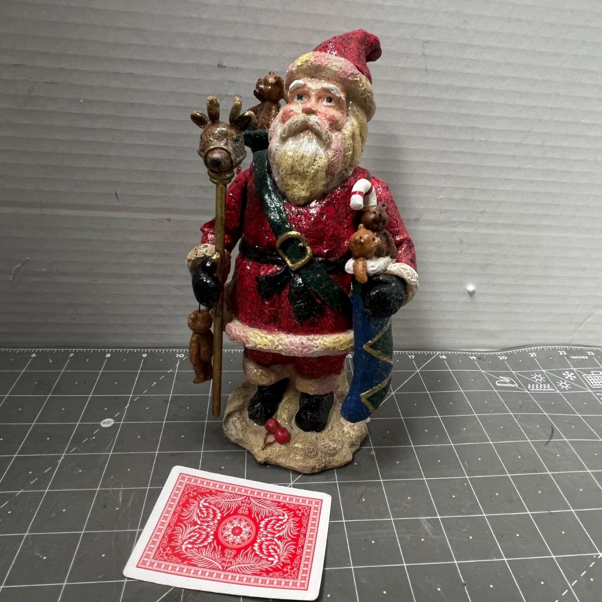 Red suit—staff with reindeer head, blue sack with bear & candy cane.