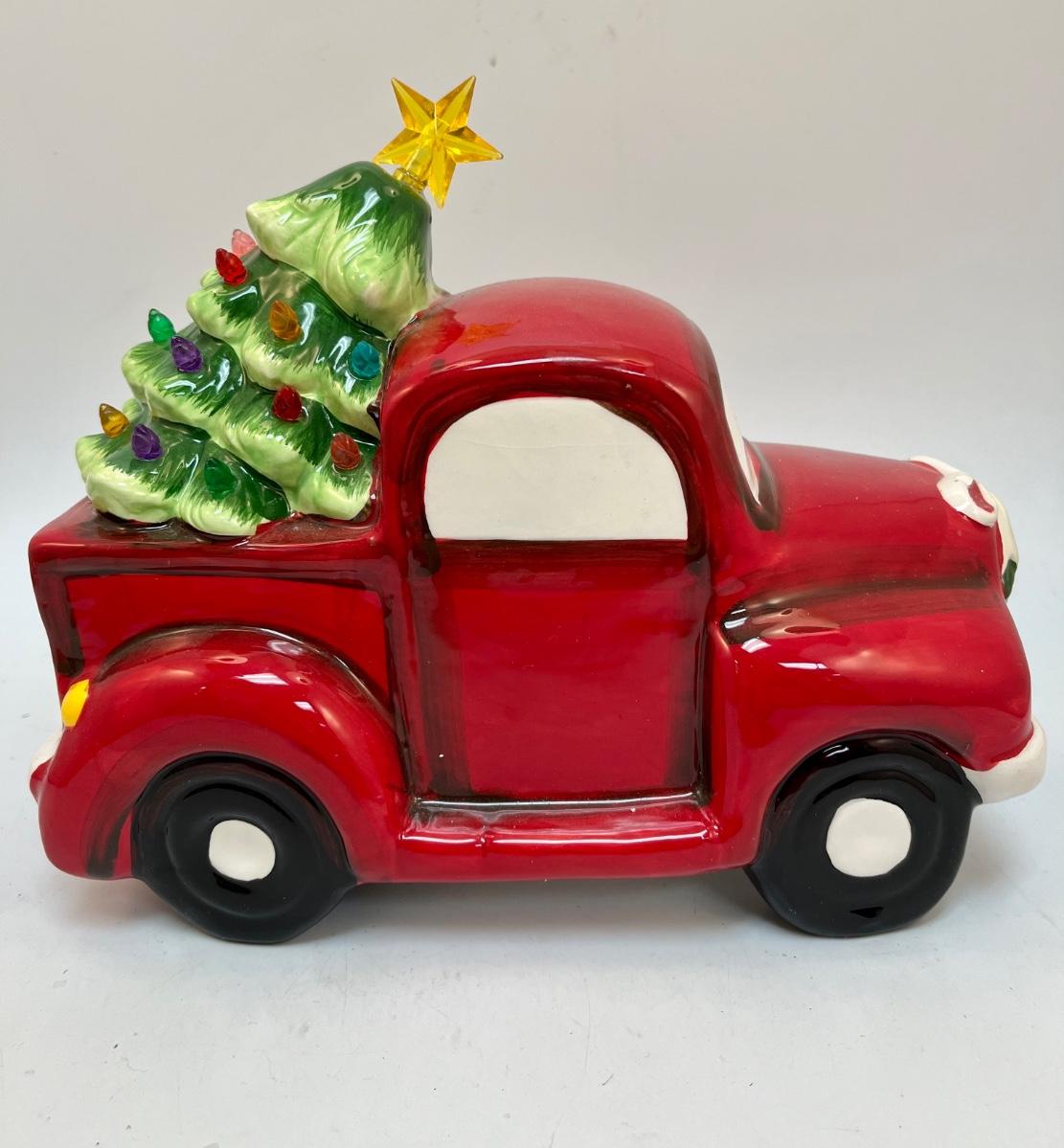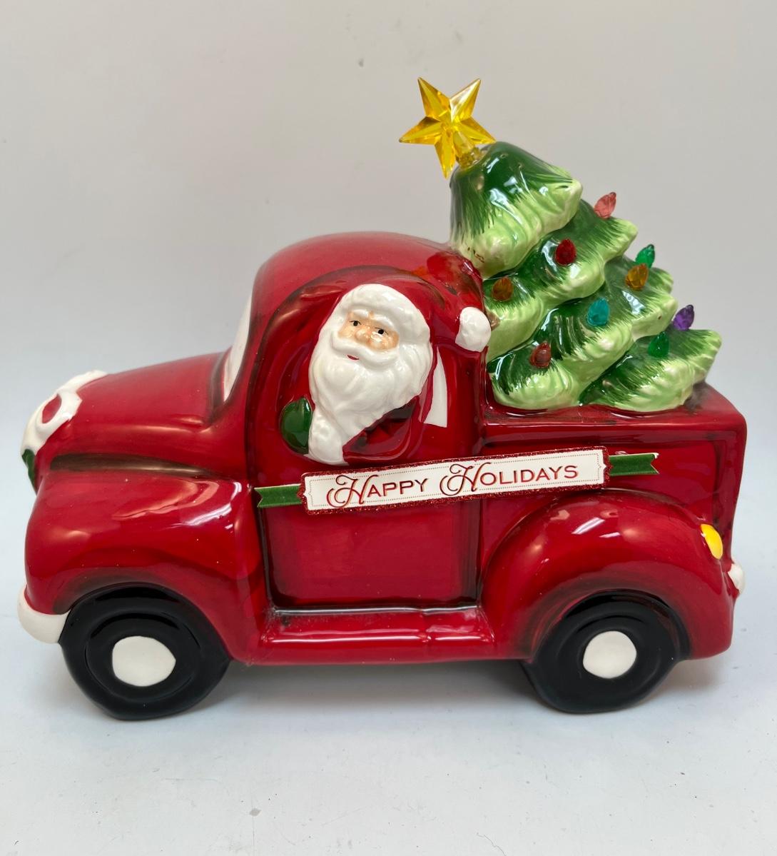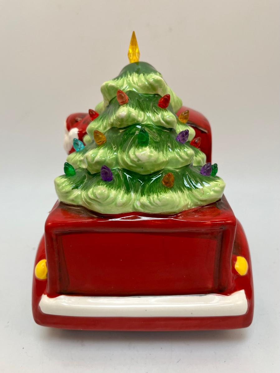 Santa in Red Pickup Truck with Light Up Christmas Tree Figurine