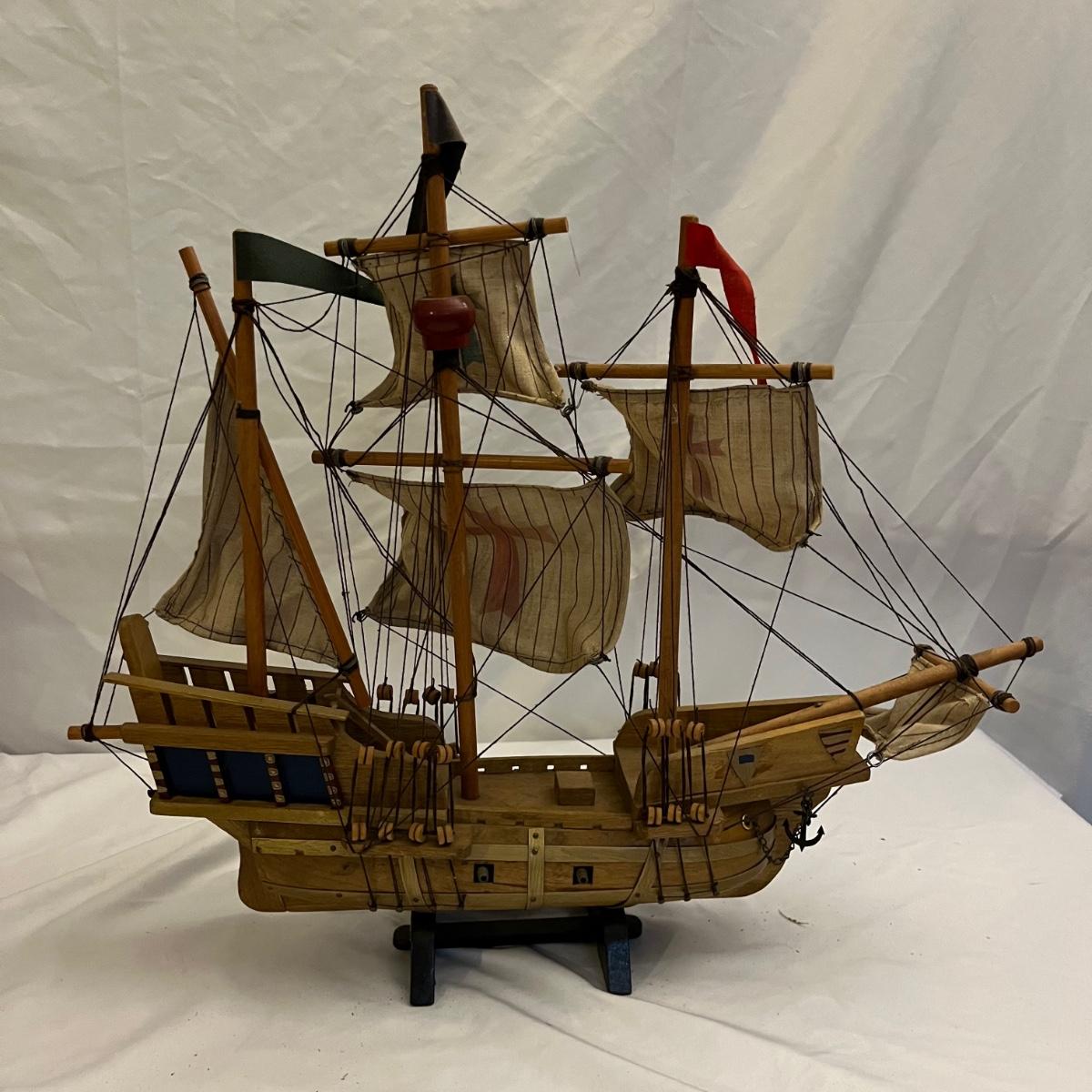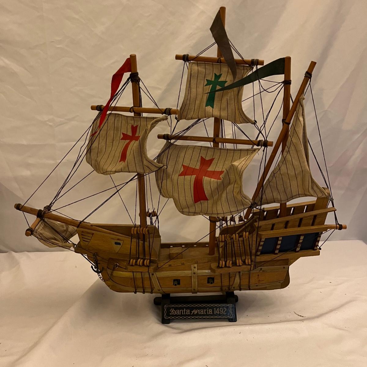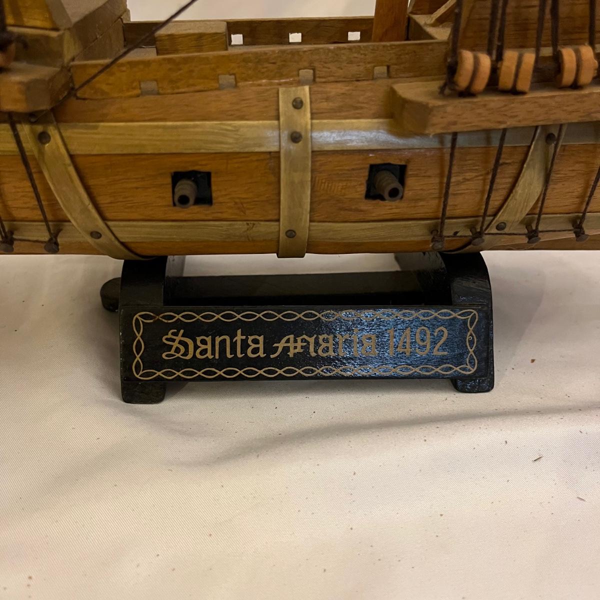 Lot includes a wooden model of the Santa Maria ship from the famous voyage of Columbus. Ship measures 4.5” x 20” x 18”.