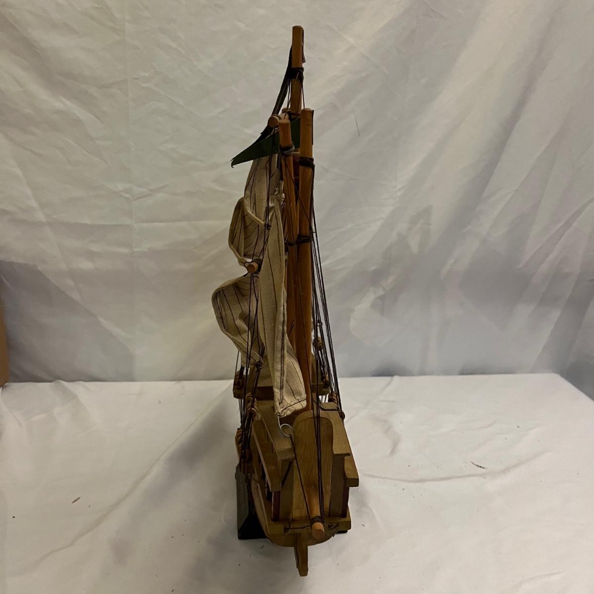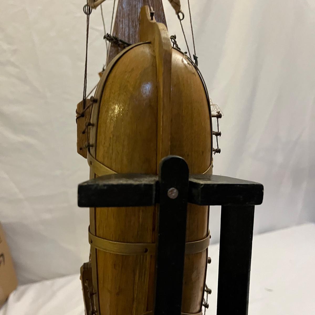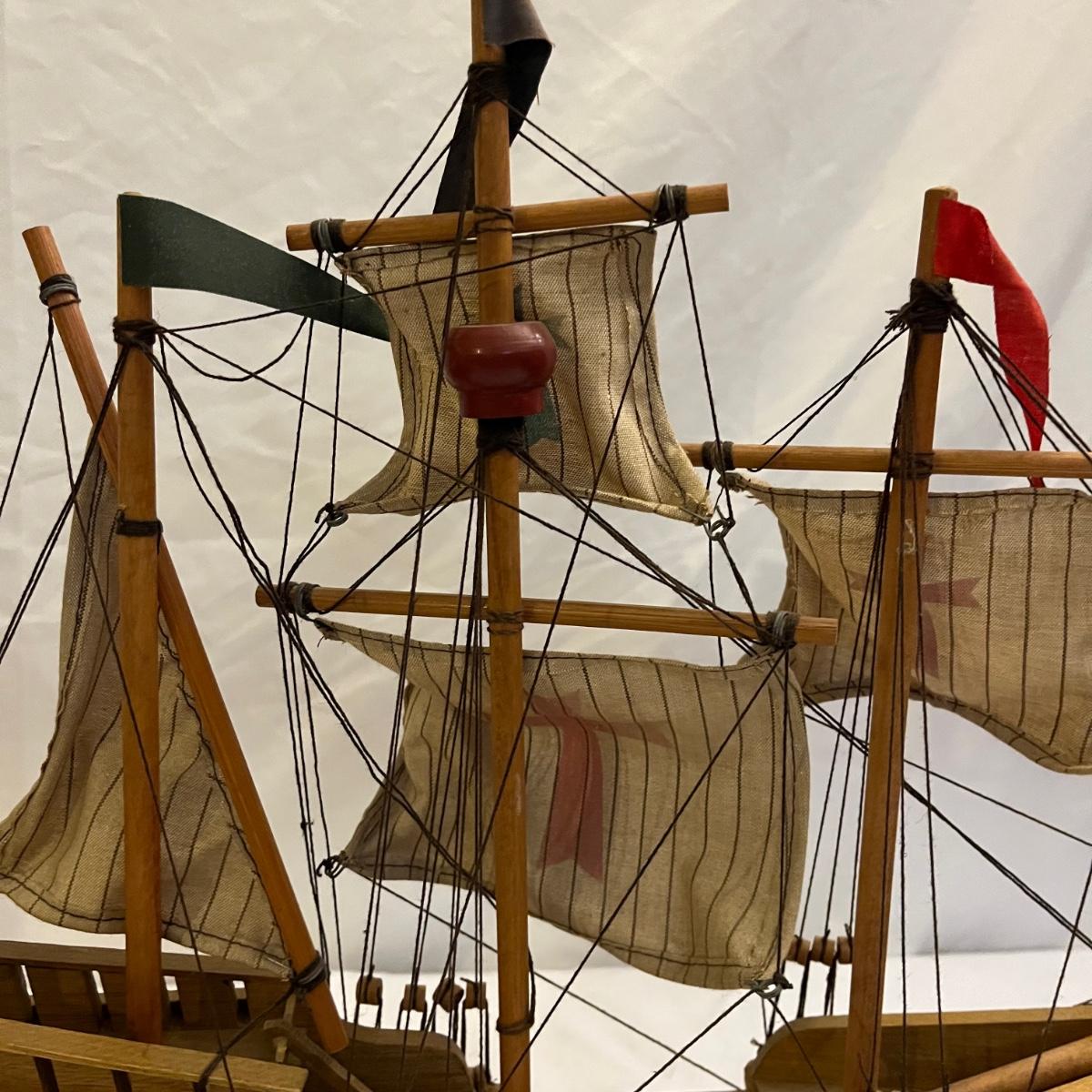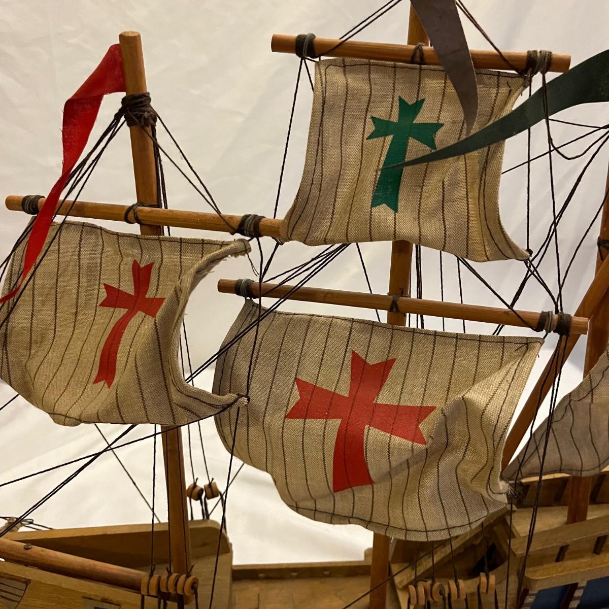 Lot includes a wooden model of the Santa Maria ship from the famous voyage of Columbus. Ship measures 4.5” x 20” x 18”.