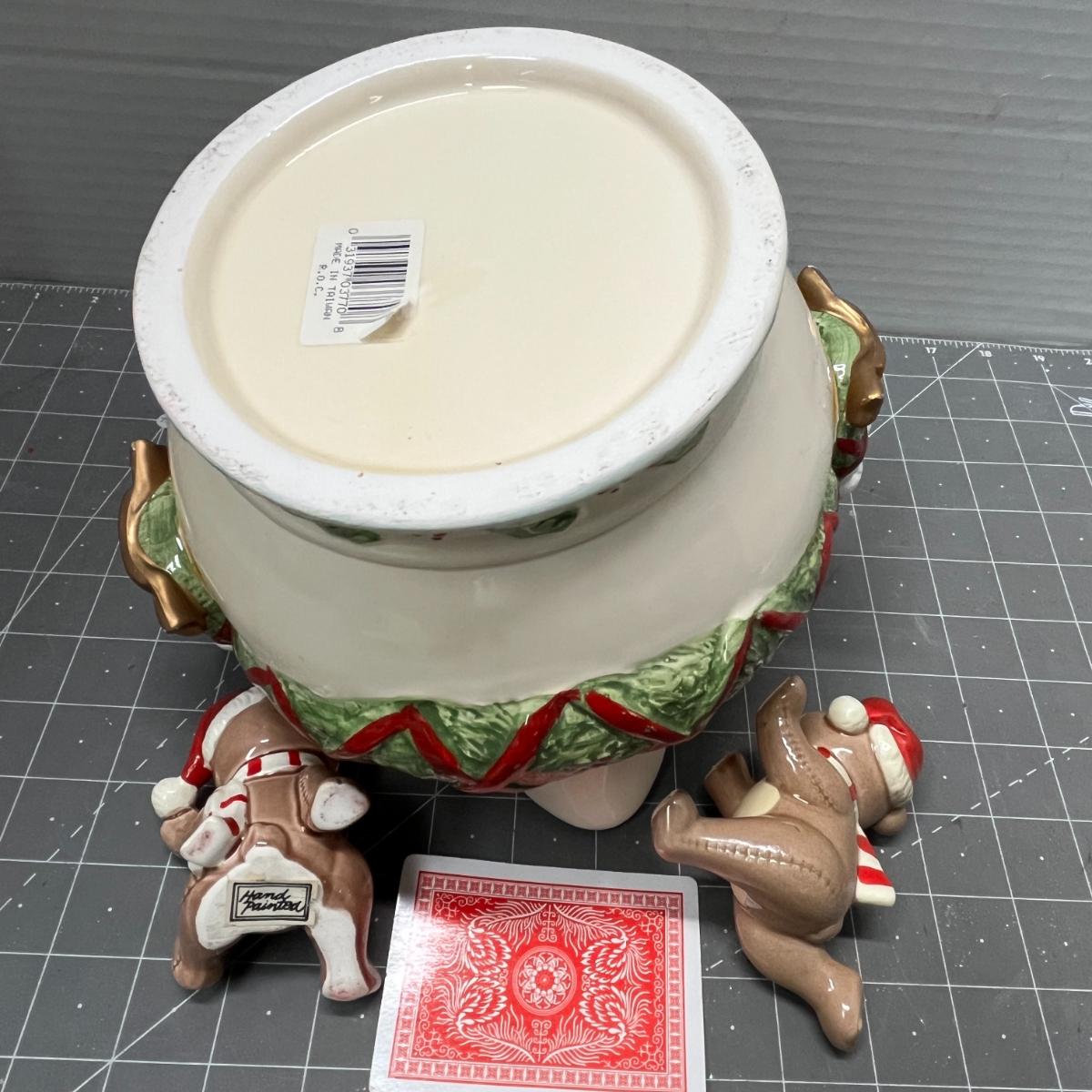 Garland-handled pitcher with Santa face + 2 winter-dressed bear figurines.