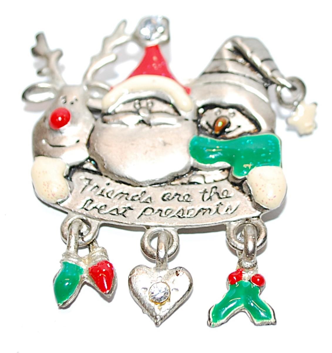 Santa, Reindeer & Snowman HOLIDAY BROOCH (2" x 1¾") "Friends are the best presents" on a Silver Tone Setting