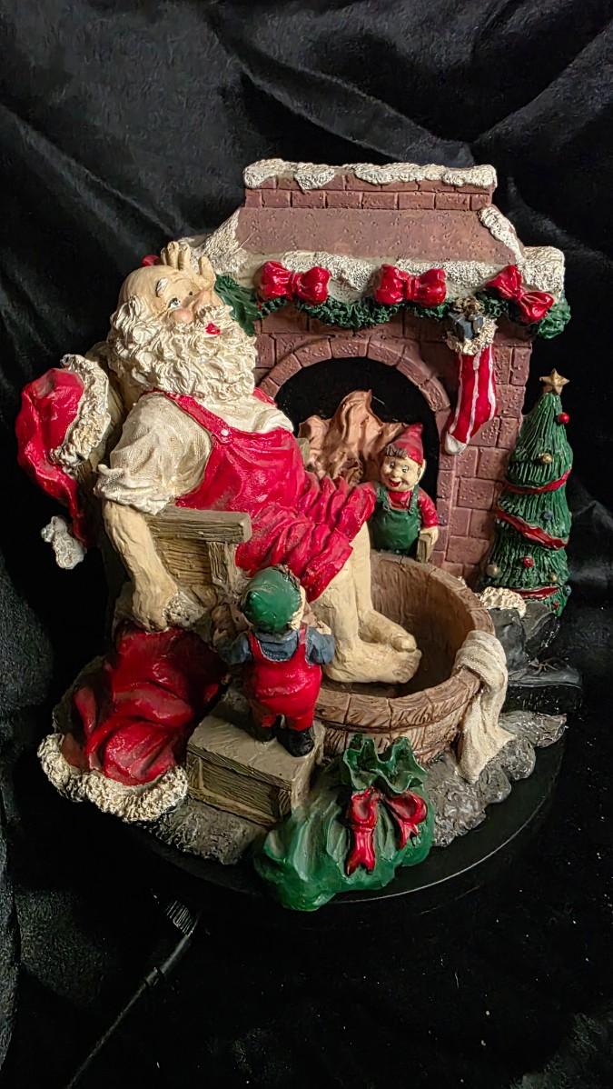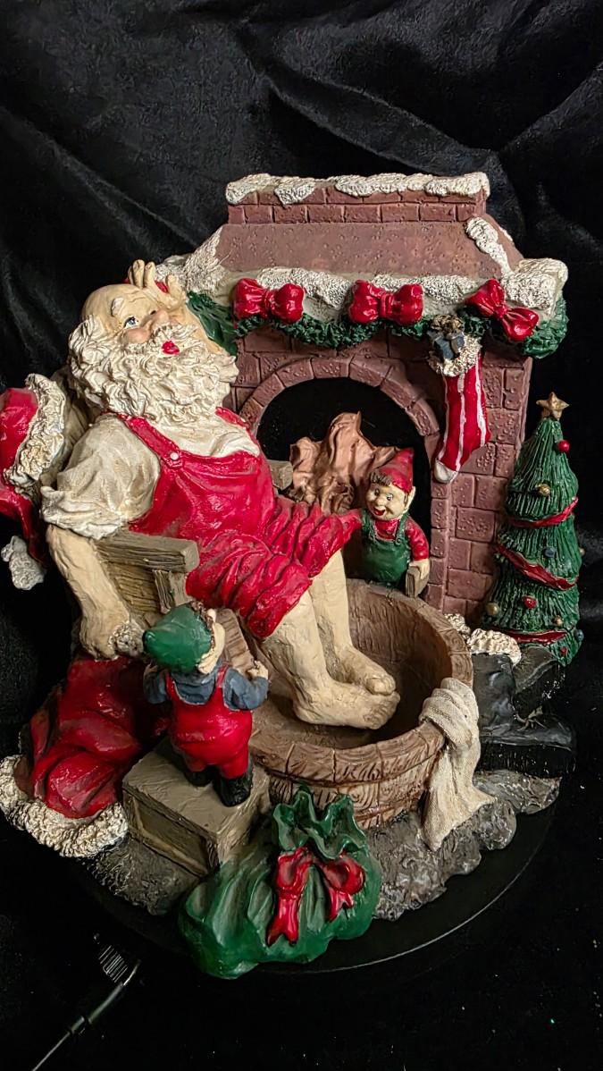 Every element—from the folds of Santa’s robe to the woodgrain of the bucket and the expressive faces of the elves—is sculpted with delightful depth, hand-painted in warm, traditional tones that evoke a timeless Christmas aesthetic. It’s the kind of display piece that instantly becomes the heart of a holiday arrangement, perfect for shelves, mantles, centerpieces, or festive vignettes that call for character and charm.