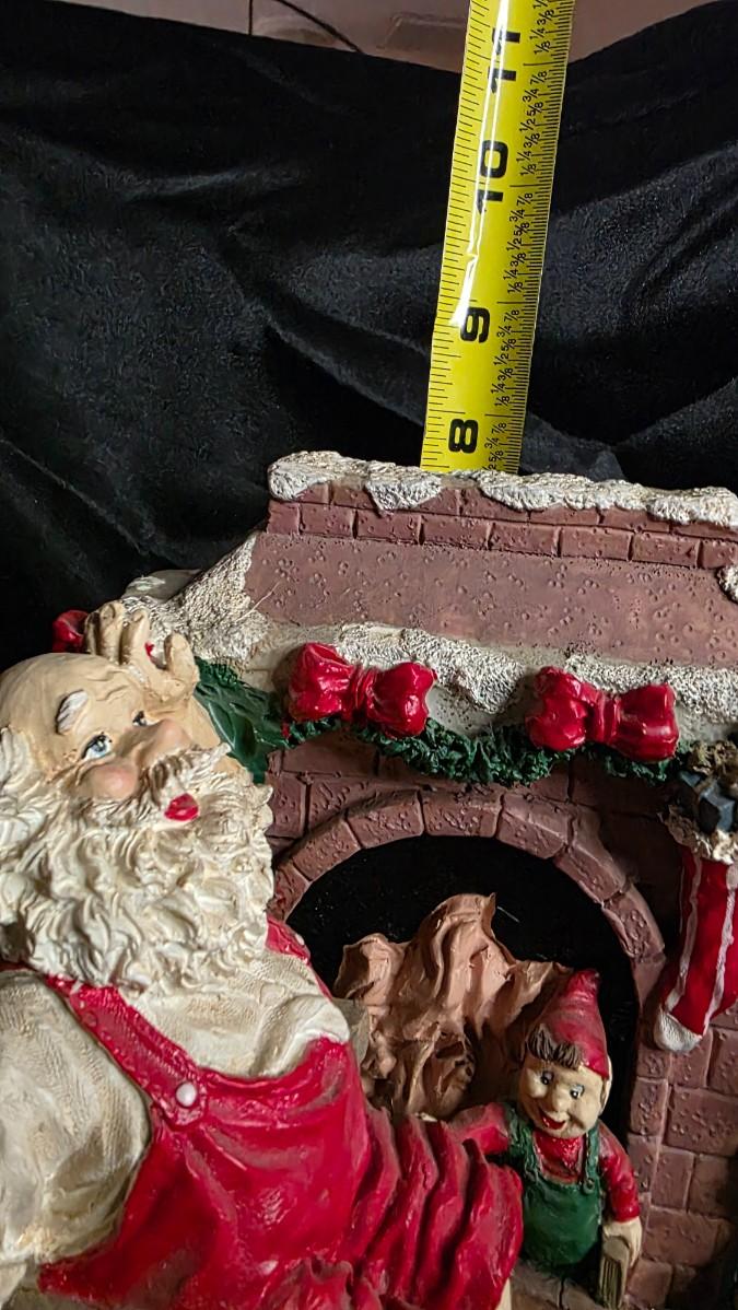 Santa sinks into a rare moment of rest in this charming 8-inch holiday figurine, a sculpted scene that captures the warmth, whimsy, and nostalgia of Christmas at its coziest. Here, the jolly old gift-giver settles back beside a brick fireplace dusted with snow, his boots off, his red overalls relaxed, and a pair of cheerful elves tending to him with playful dedication. Behind him, textured bricks rise into a snowy chimney top trimmed with vibrant red bows and lush greenery, framing the flicker-inspired detail of the hearth. A classic Christmas tree stands to the side, wrapped in garland and dotted with ornaments, adding to the sense of story and seasonal celebration.