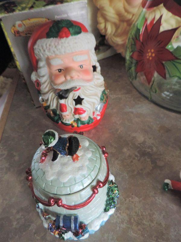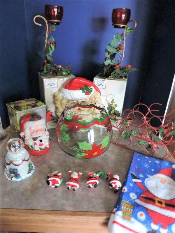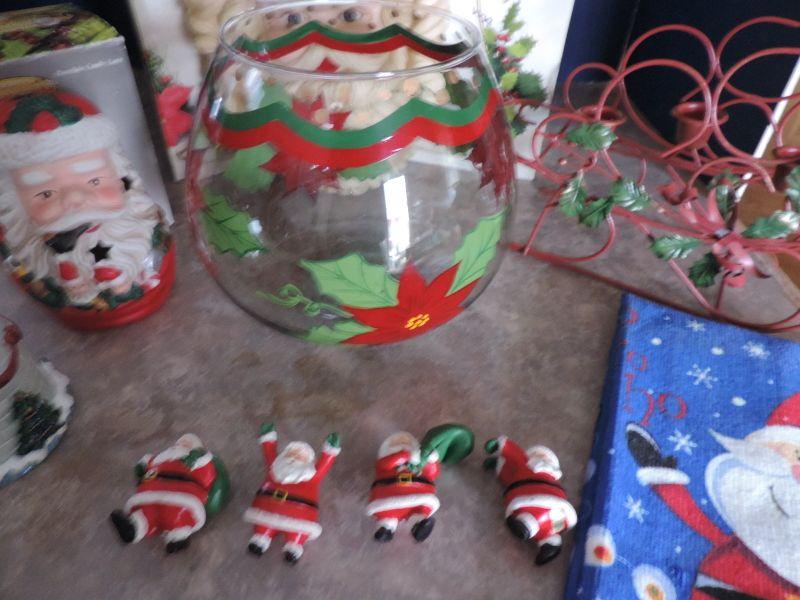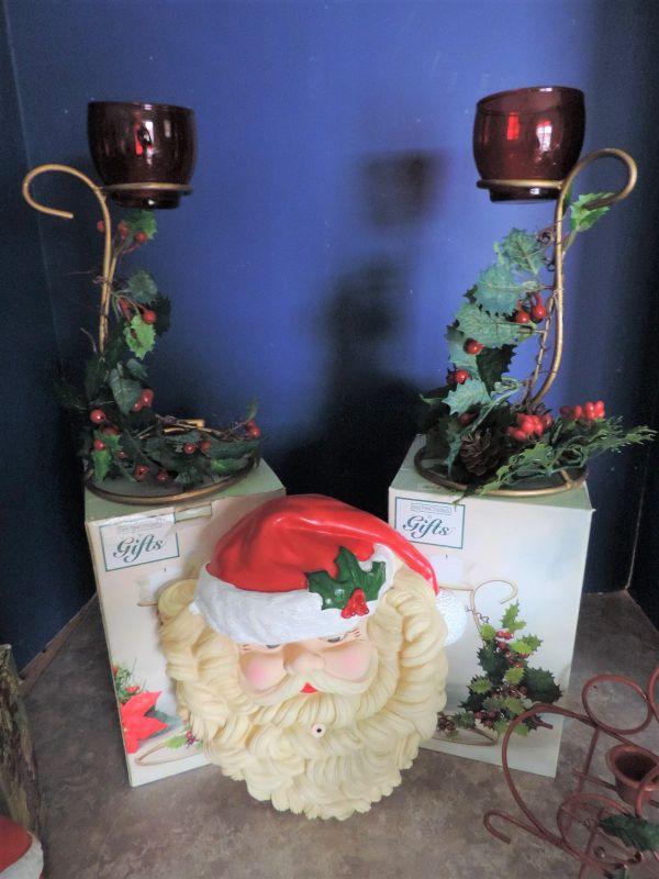 TALKING SANTA HEAD, CANDLE HOLDERS WITH RED GLASS AND COMES WITH A CLEAR GLASS, PAINTED BOWL AND MORE