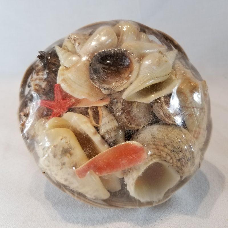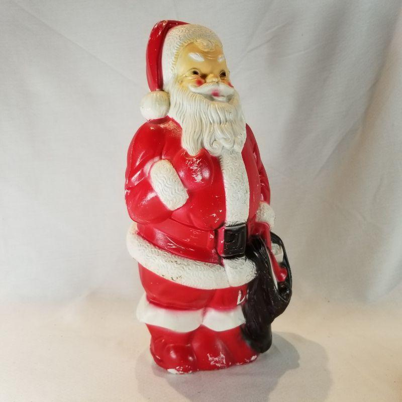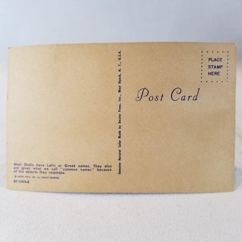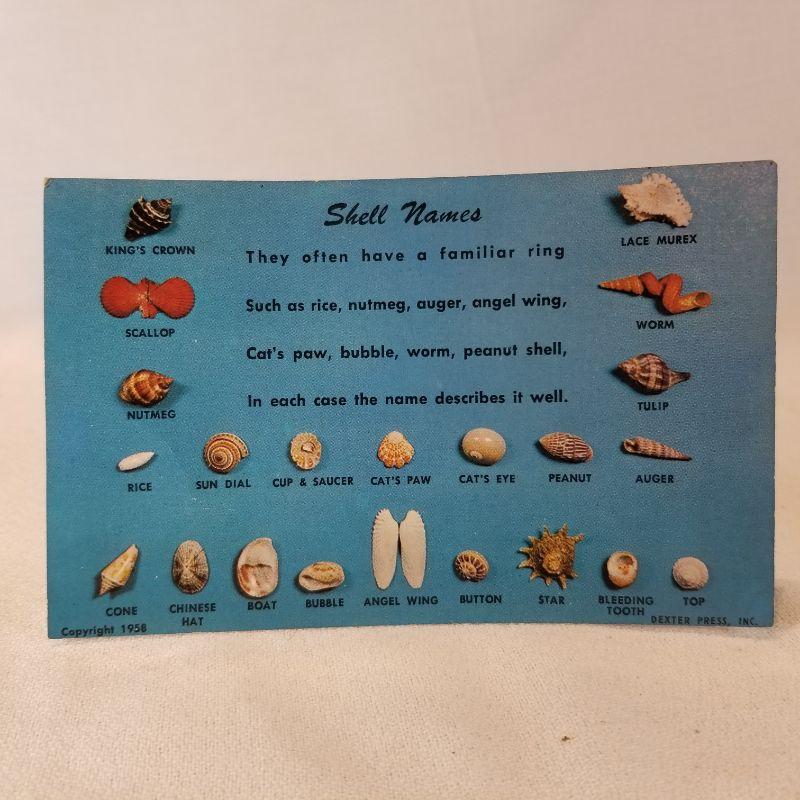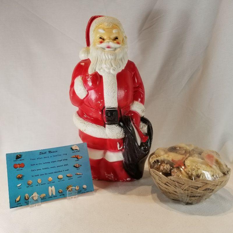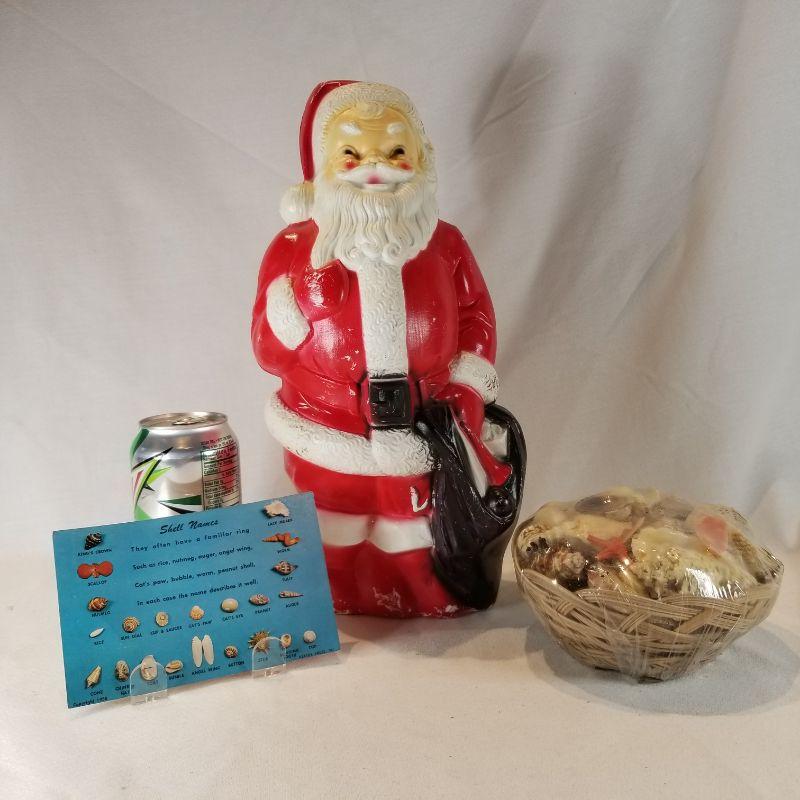We couldn't find sleigh bells to put with sea shells so Santa had to do. A nice vintage, plastic 13-inch tall Santa with an old-new small basket of sea shells and a great Sea Shell Names vintage post card - dated 1958. Santa shows a lot of wear and scuffs but that is consistent with his age and use. The basket of shells has never been opened. The post card back has no hand writing but has darkened,