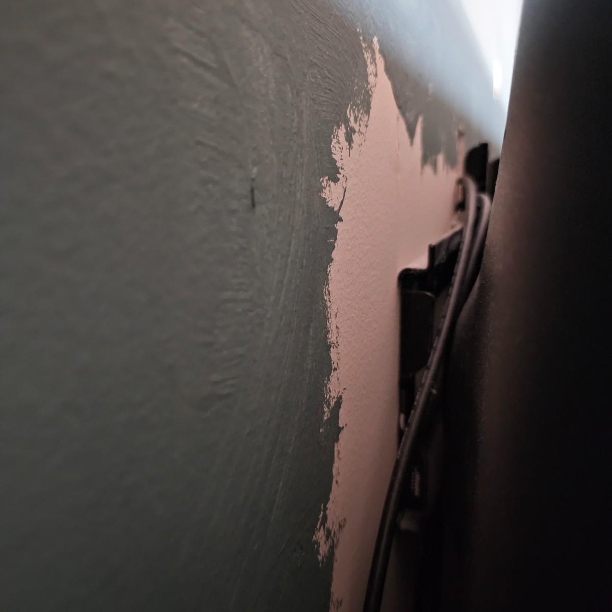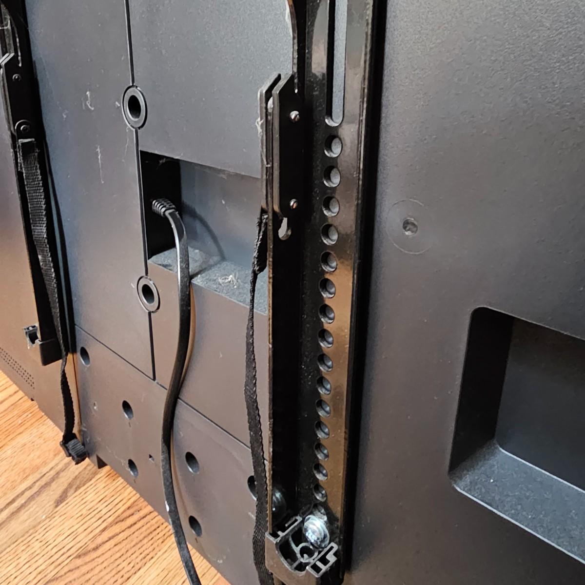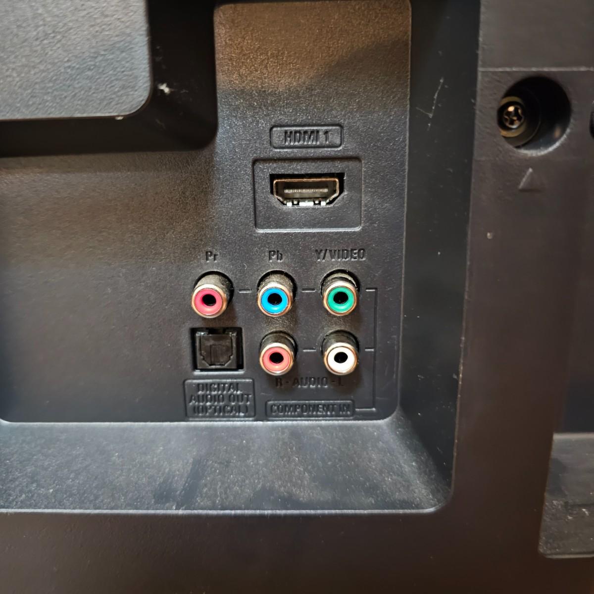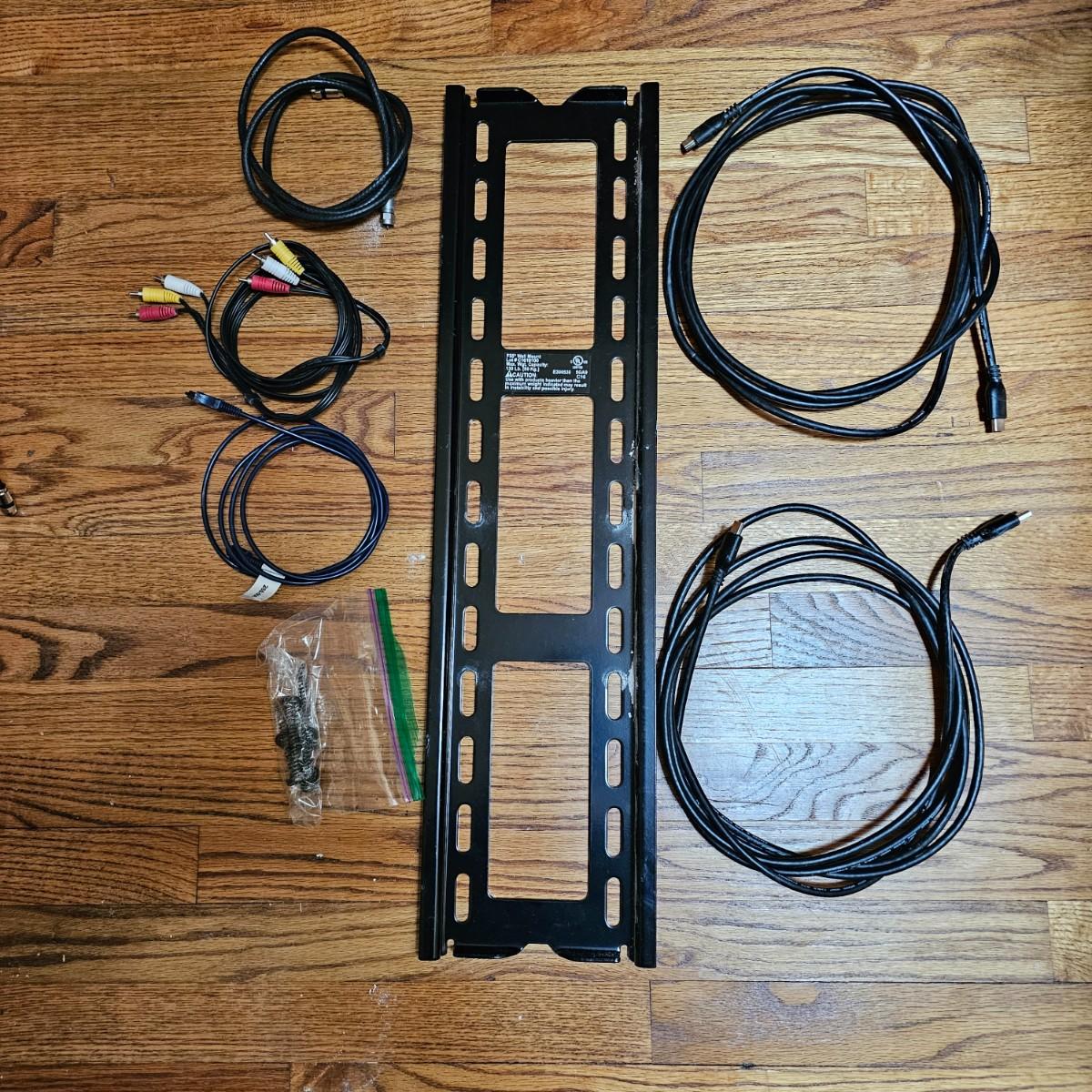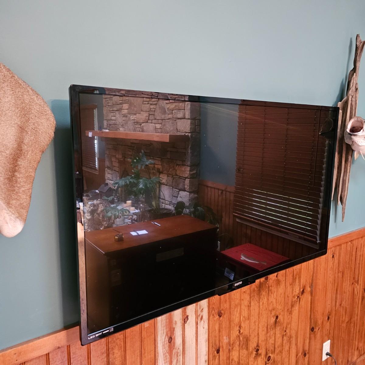 One Sanyo flat screen TV. 55" screen, and entire unit measures 49.5" x 5" x 28.5"H. Includes wall mount, already removed and all cables shown. Unit powered on when plugged in. No remote. Local pickup only.