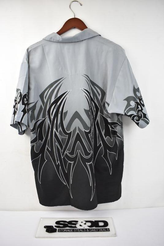Sapphire Lounge Short Sleeve Button-Up Bowling Shirt Size Large. Modern Flame Design in Black & Grays