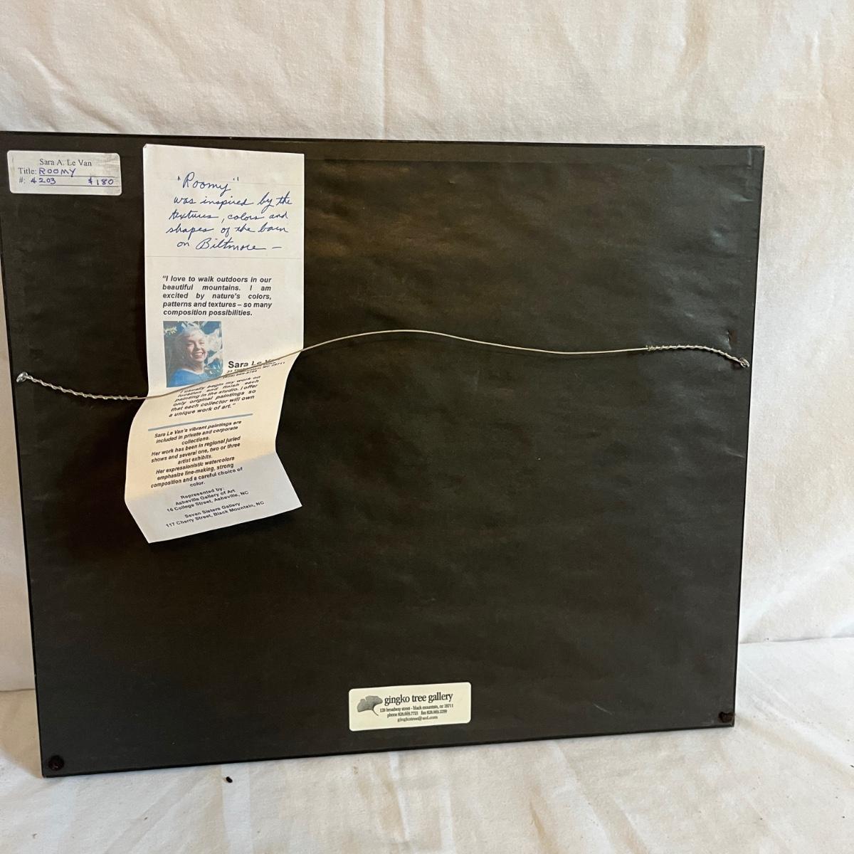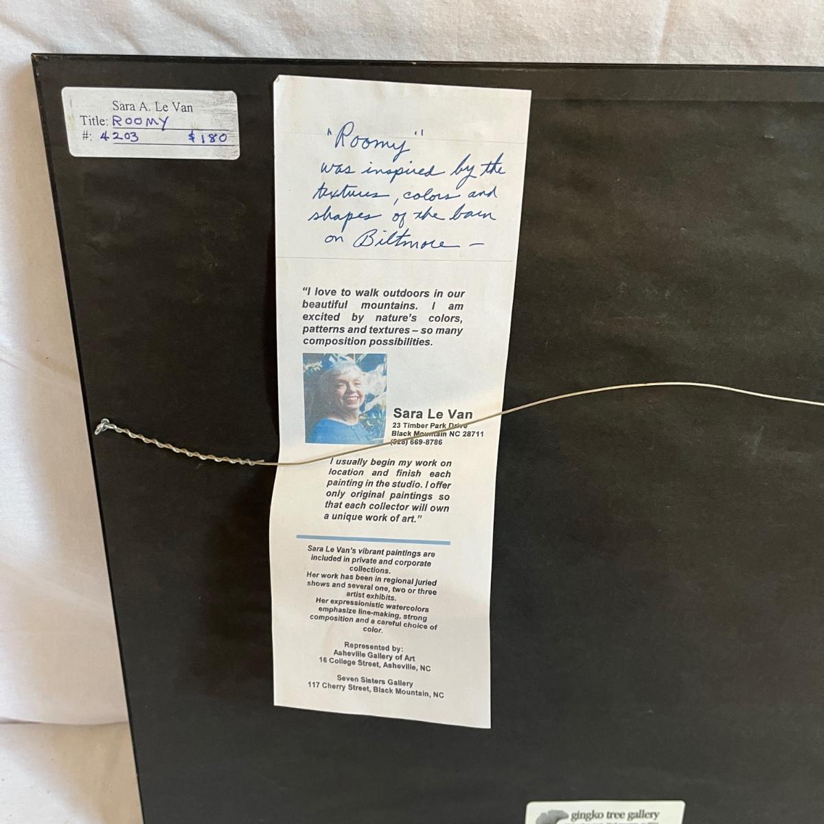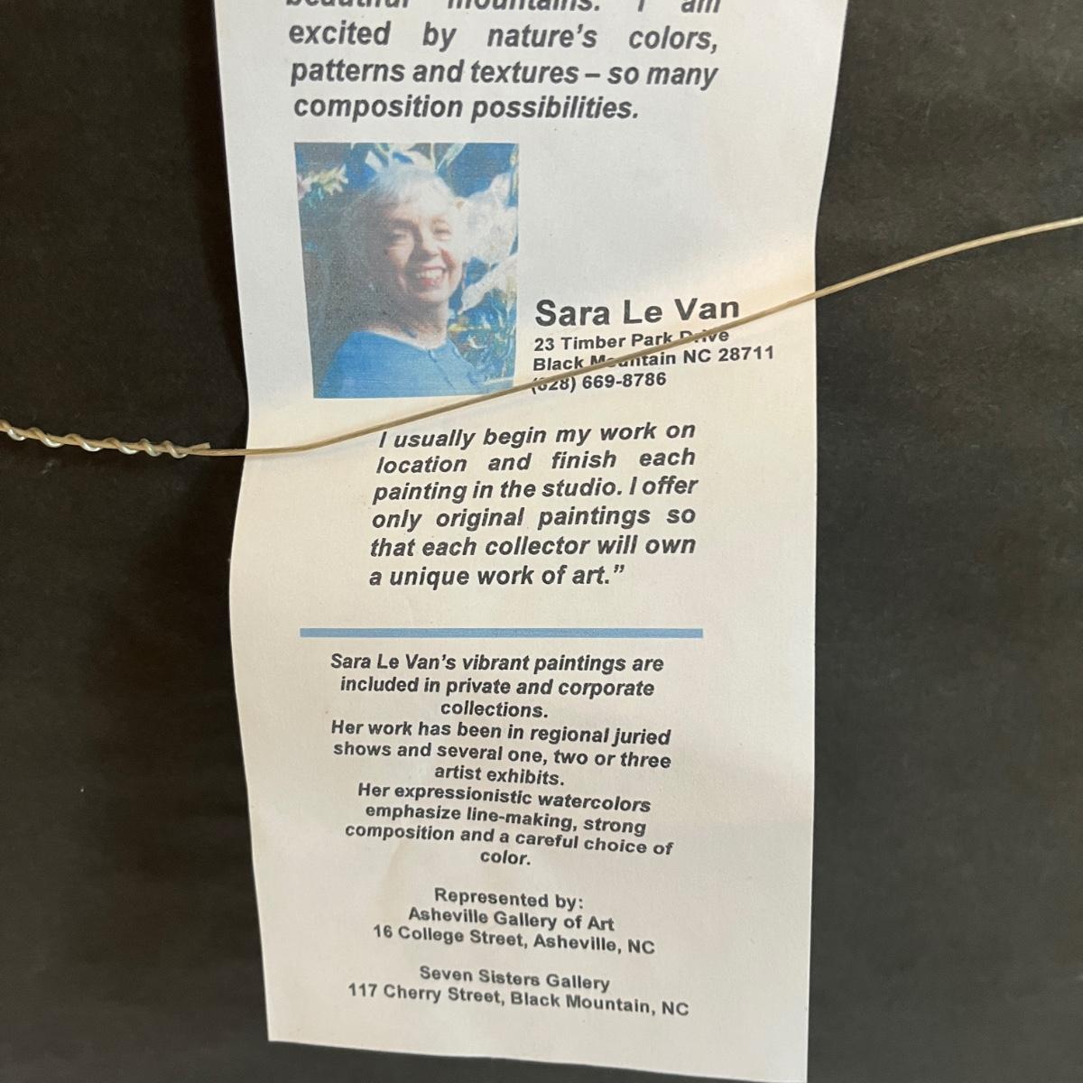 This wooden framed, matted and under glass signed watercolor painting is by local Black Mountain artist Sara Le Van. Frame measures 20” x 17”H.