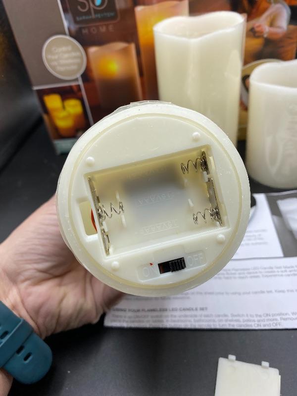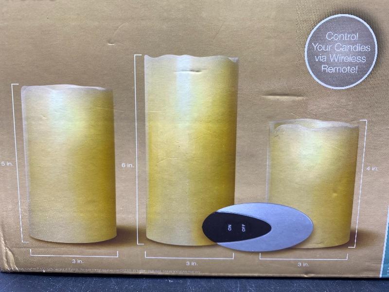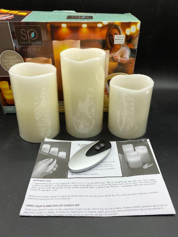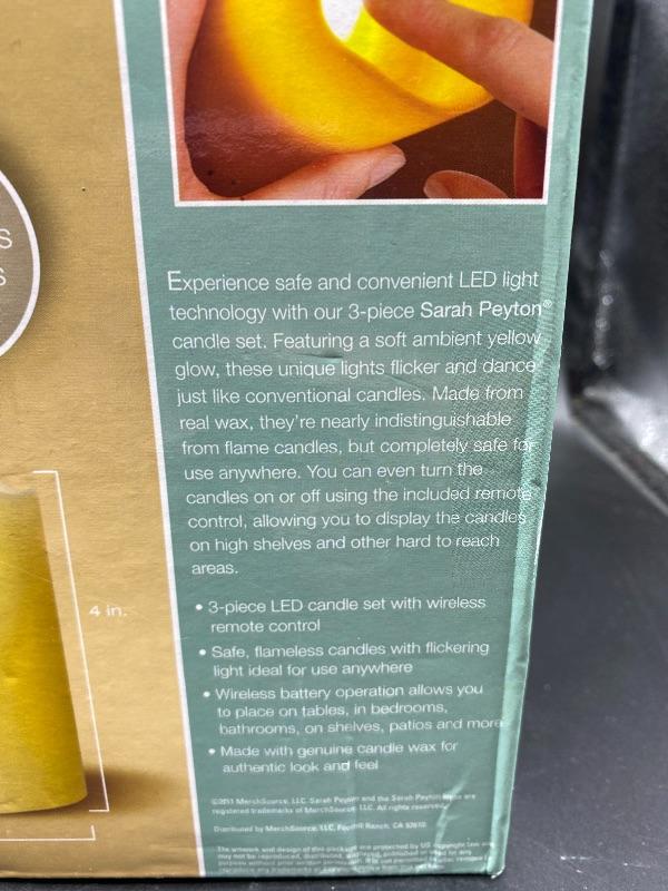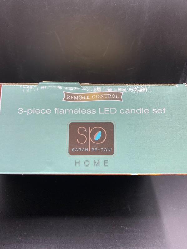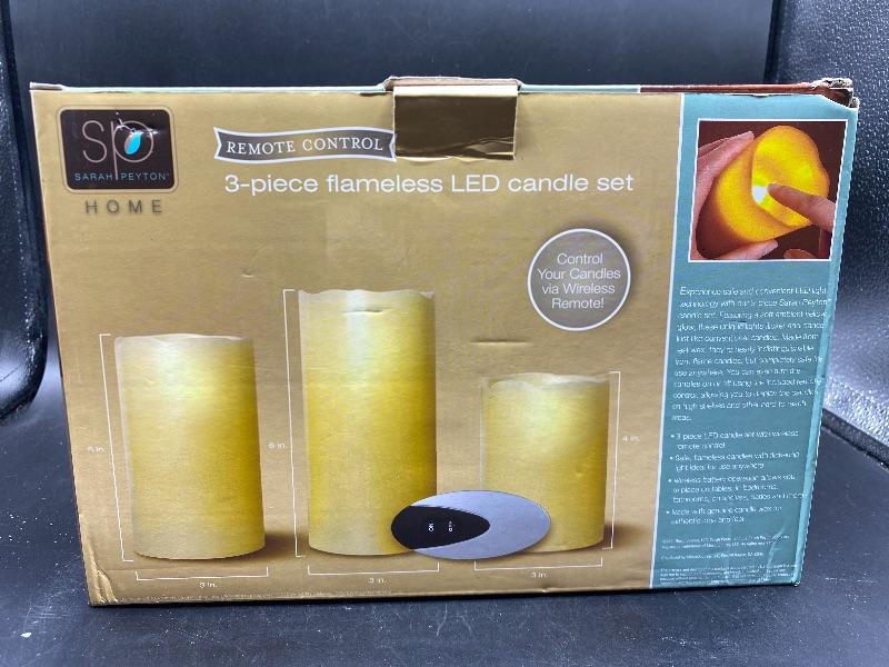 Sarah Peyton Home 3 piece LED candle set. Candles can be remote controlled on/off. Come in original box, but do not have inside packaging. 4", 5", & 6" real wax candles.