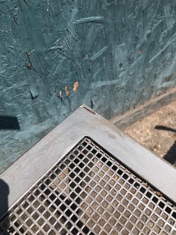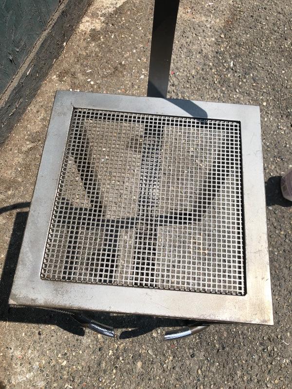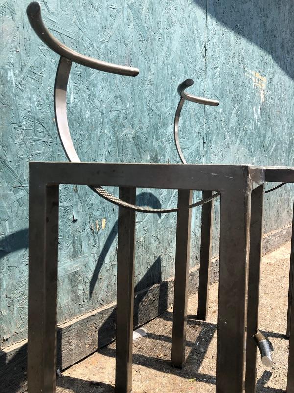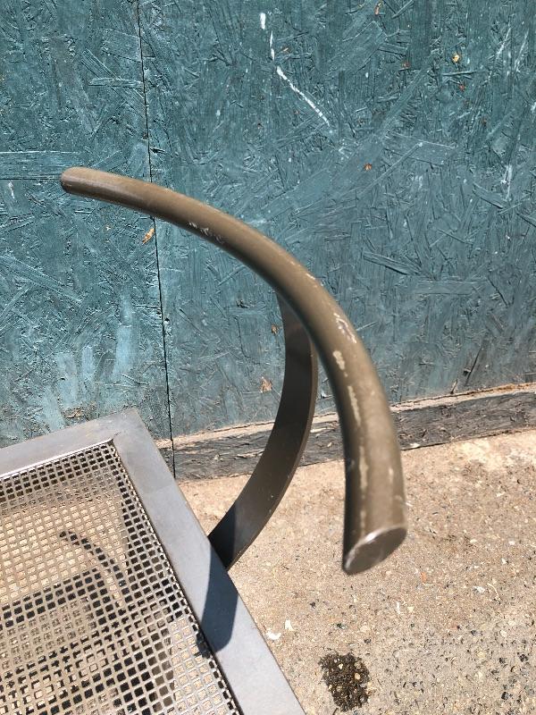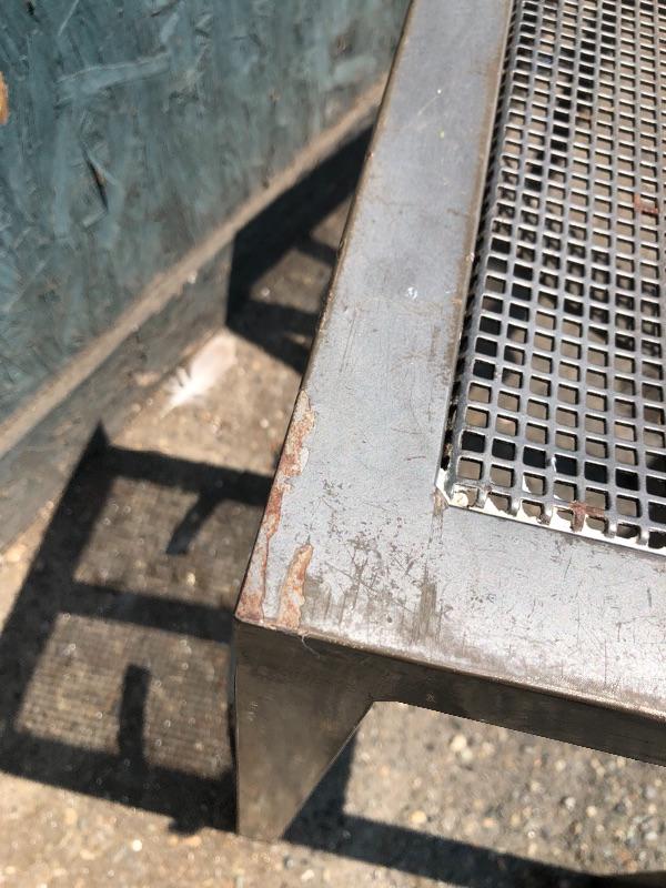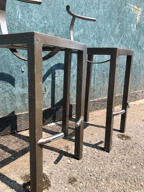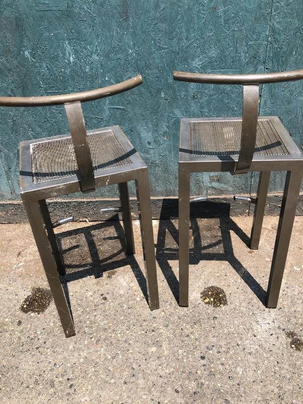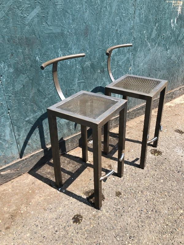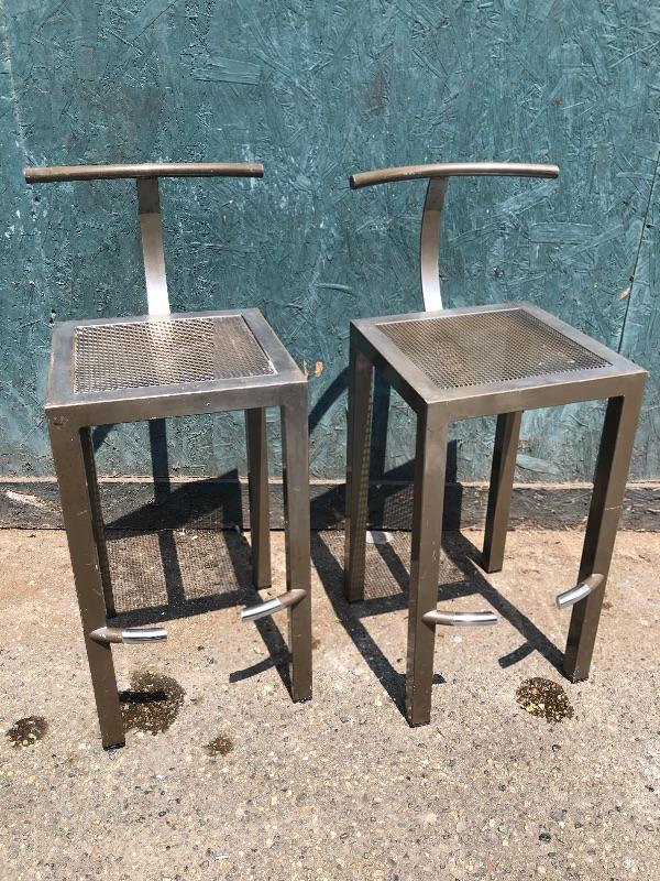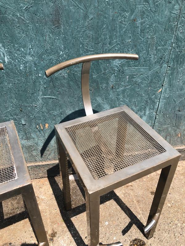 Cool pair of steel barstools! Very sturdy chairs with metal mesh seats. Dimensions are 14"L x 14"W x 34.5”H