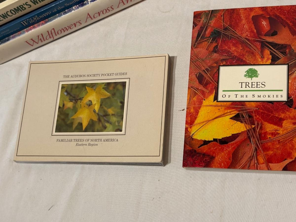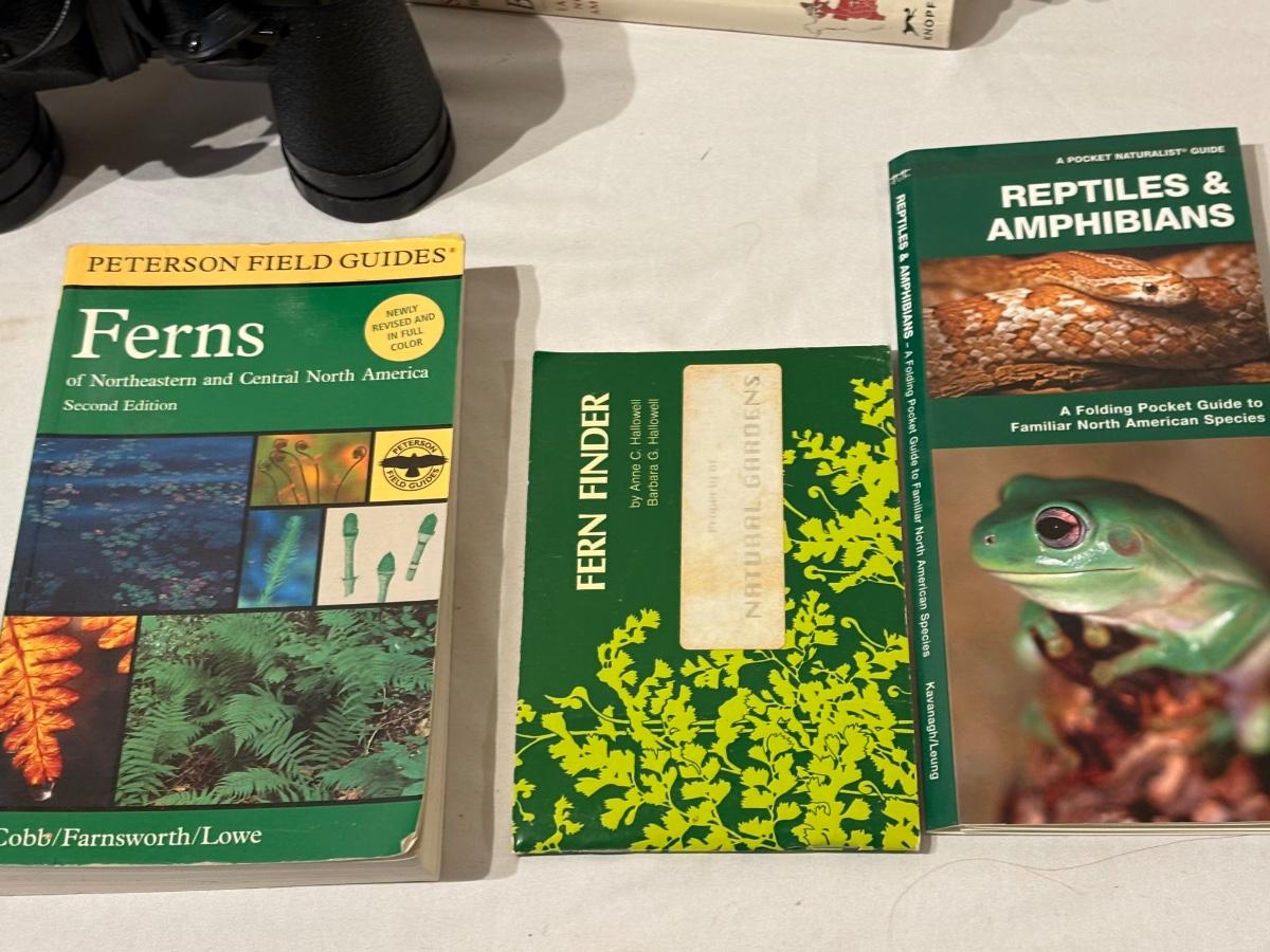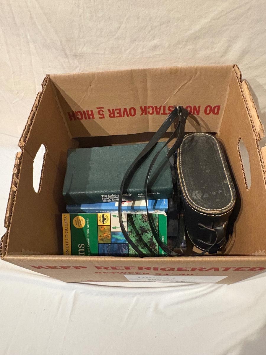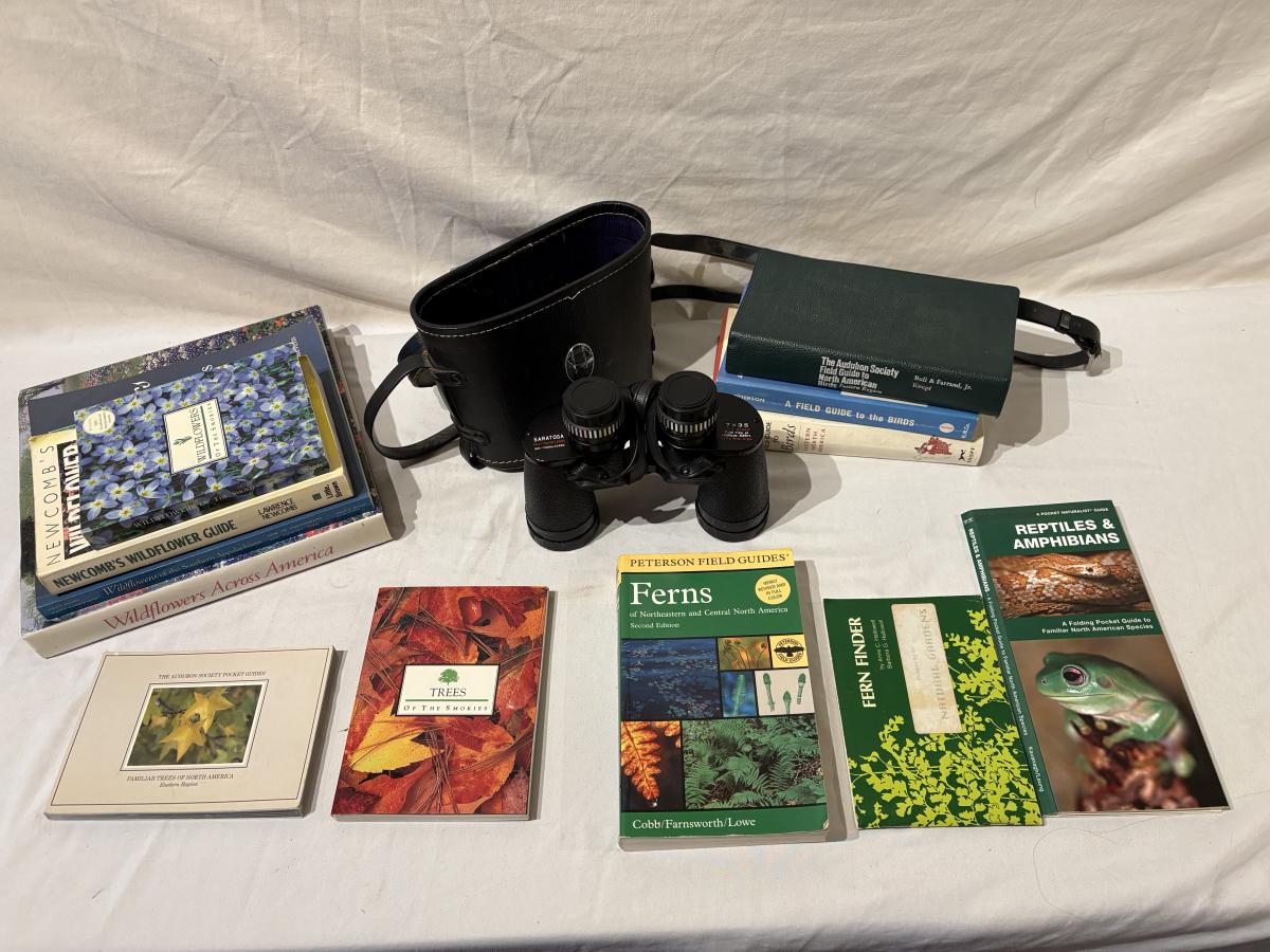 Bird, flower, trees & more field guides including regional or local books. Binoculars appear in good working order. Shipping available.