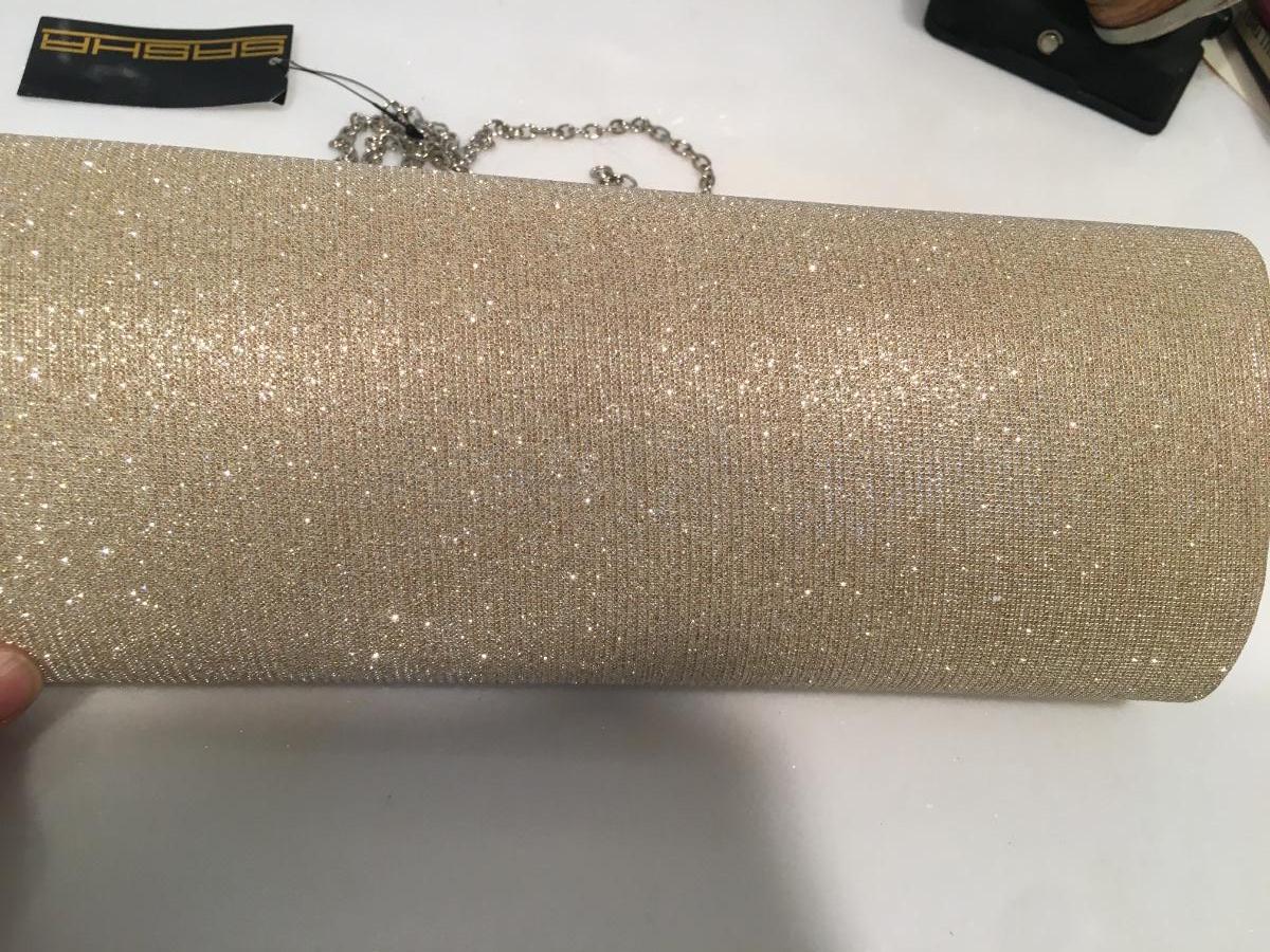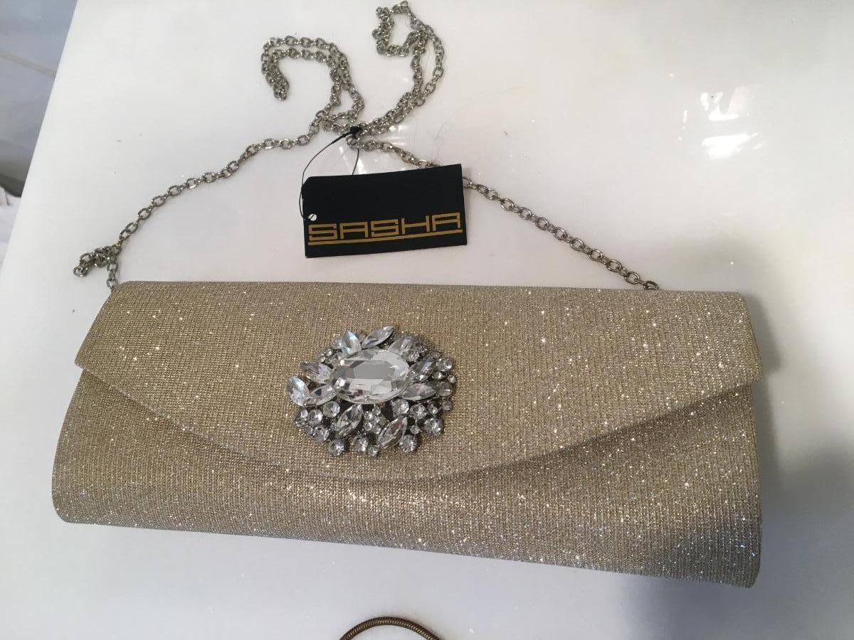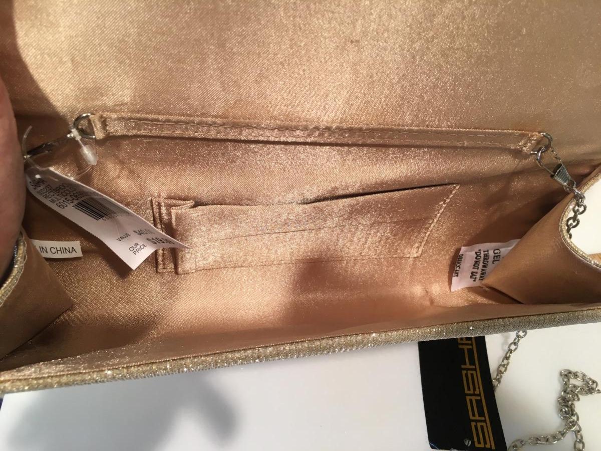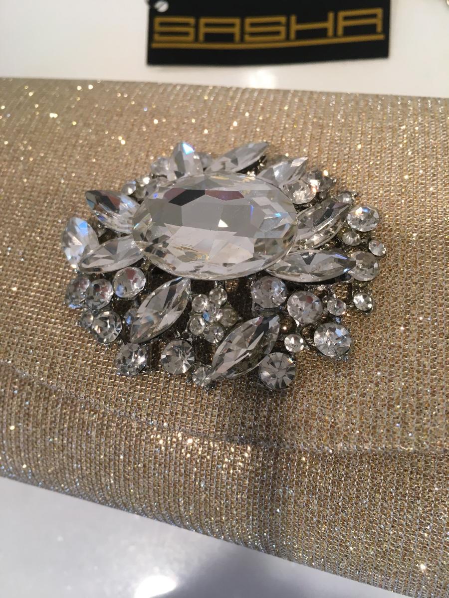 NWT synthetic shiny cloth clutch with metal and alternate cloth shoulder strap, large rhinestone accent.