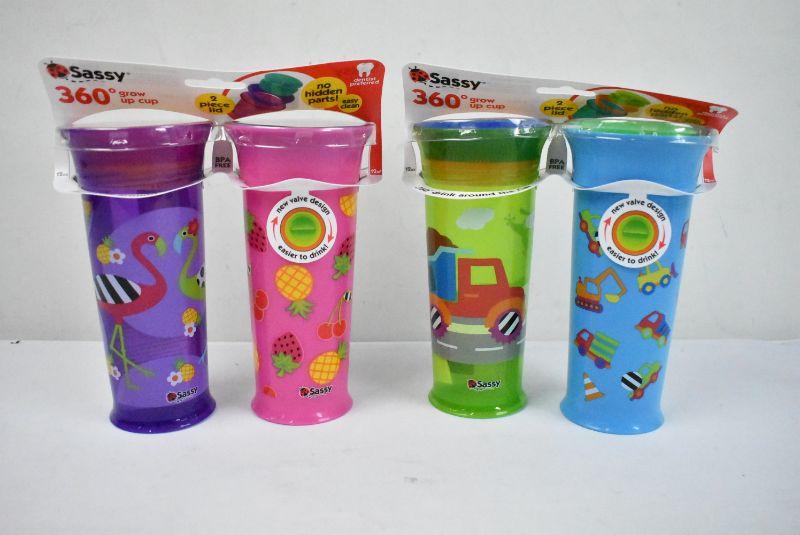 Sassy No Spill Spoutless Sippy Cup - Two 2-Packs: Purple, Pink, Green, Blue, 12 oz Each - New