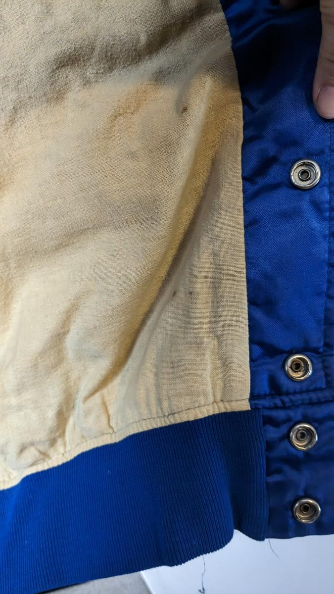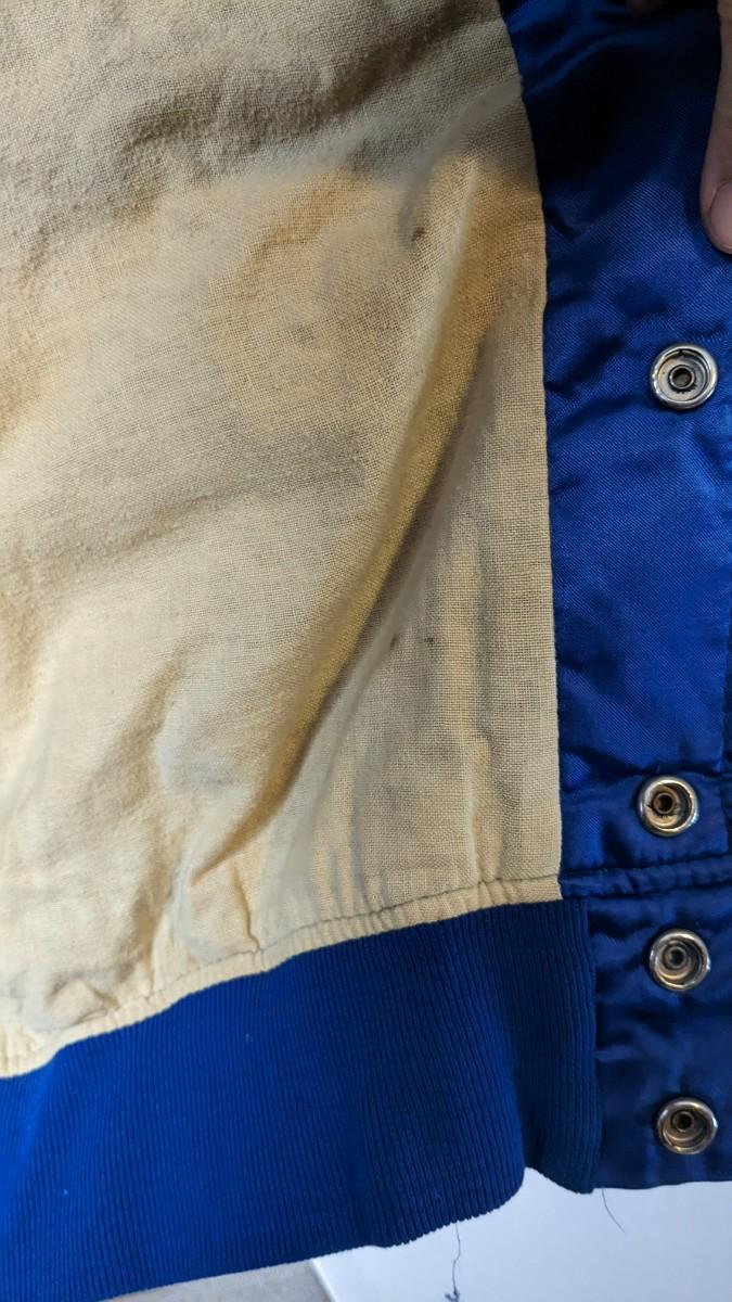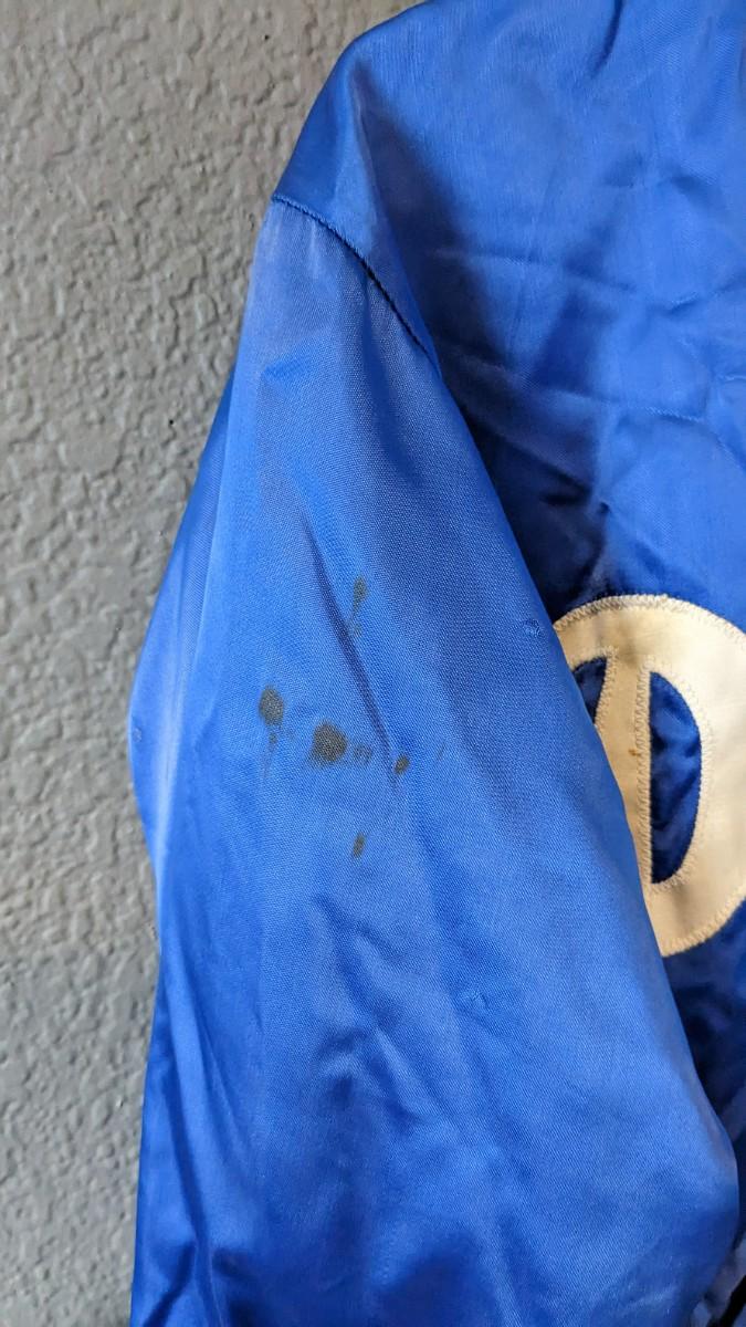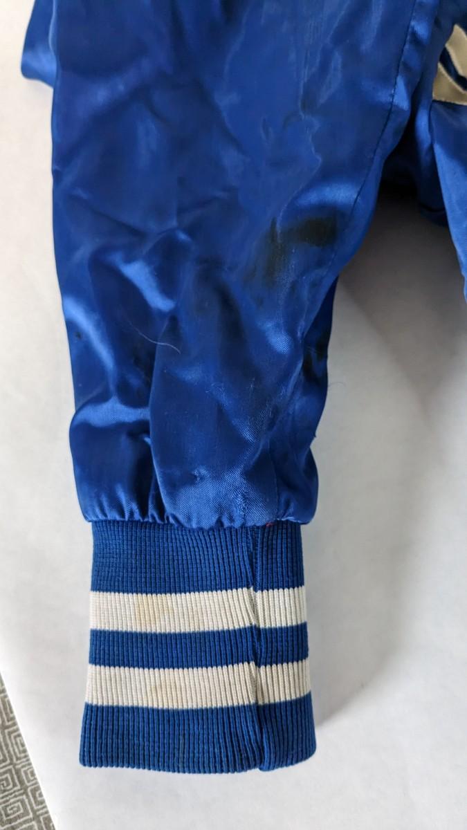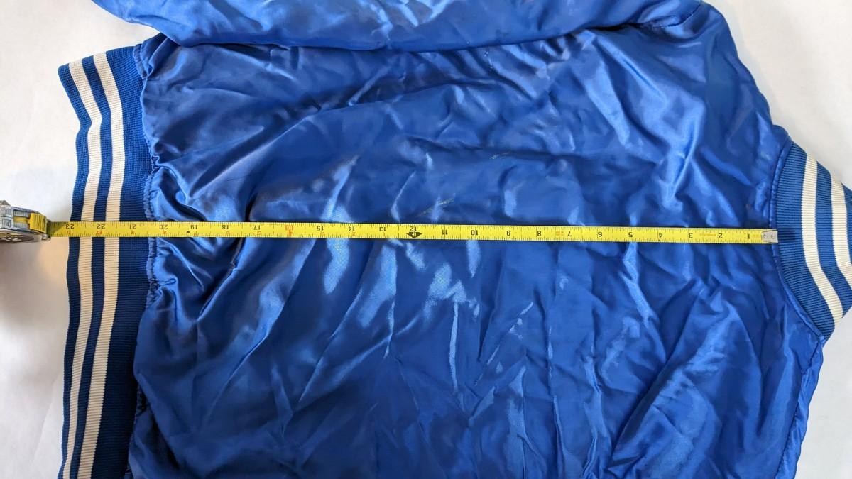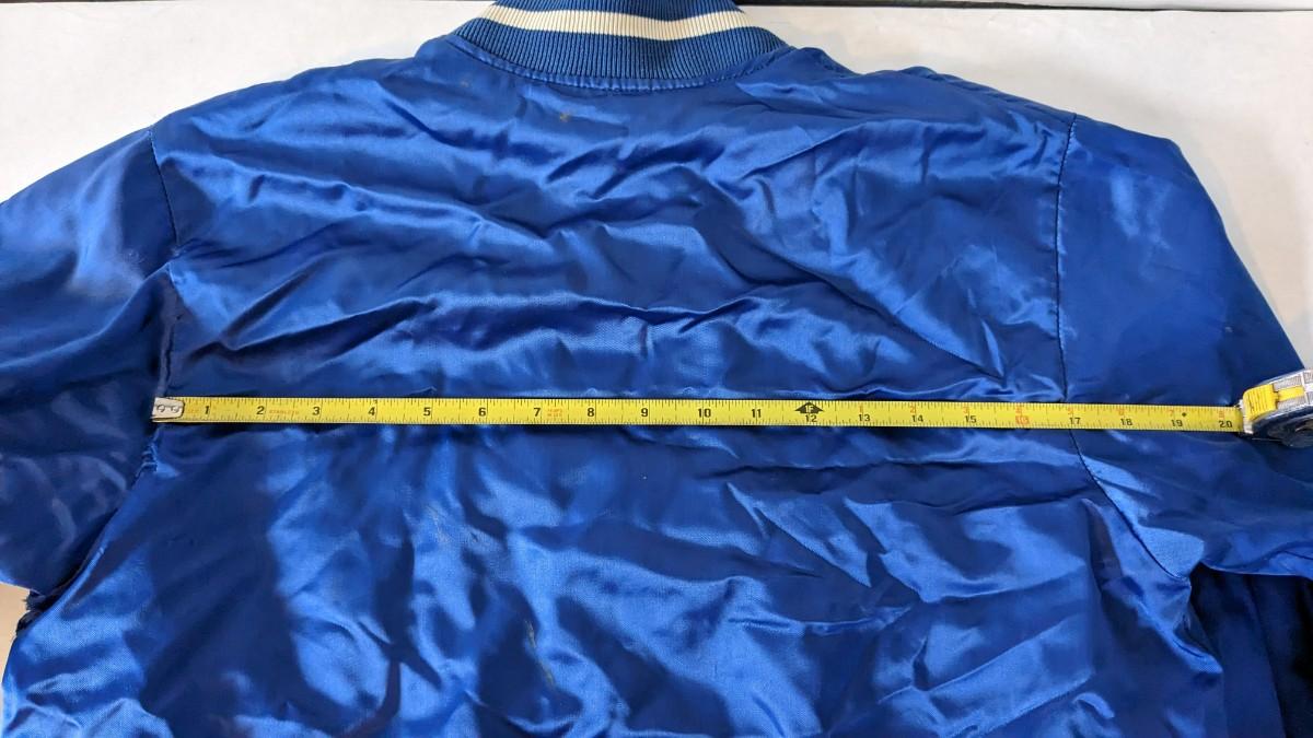 shows significant signs of use with staining on and wear noted. Seam separation on left shoulder and underarm, staining on front and arm, with other spotting. This item has not been laundered so some may come out. Measurements laying flat are 21" pit to pit, 23" neck to end, and 17" shoulders.