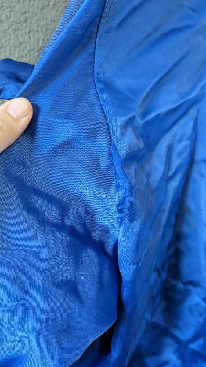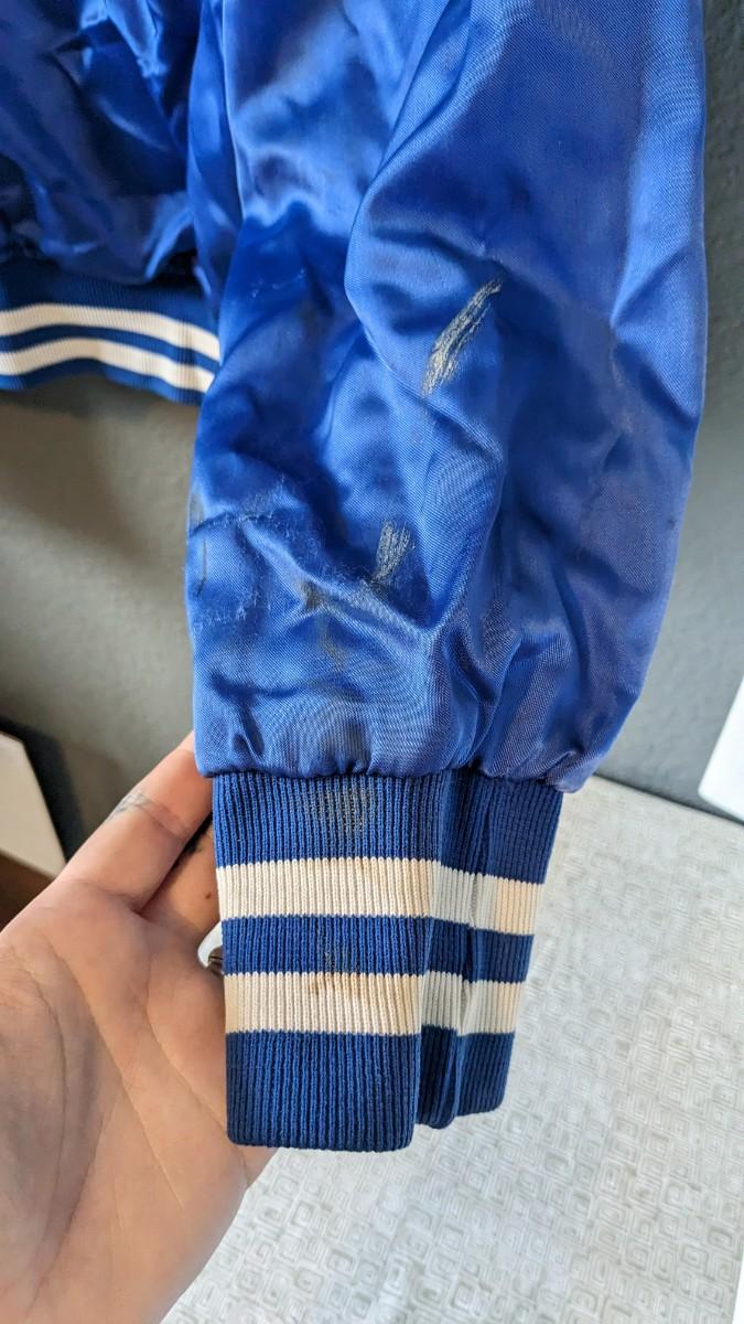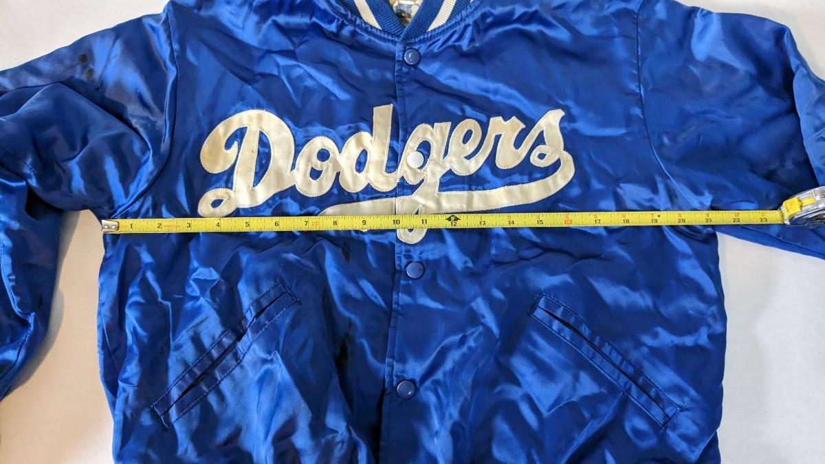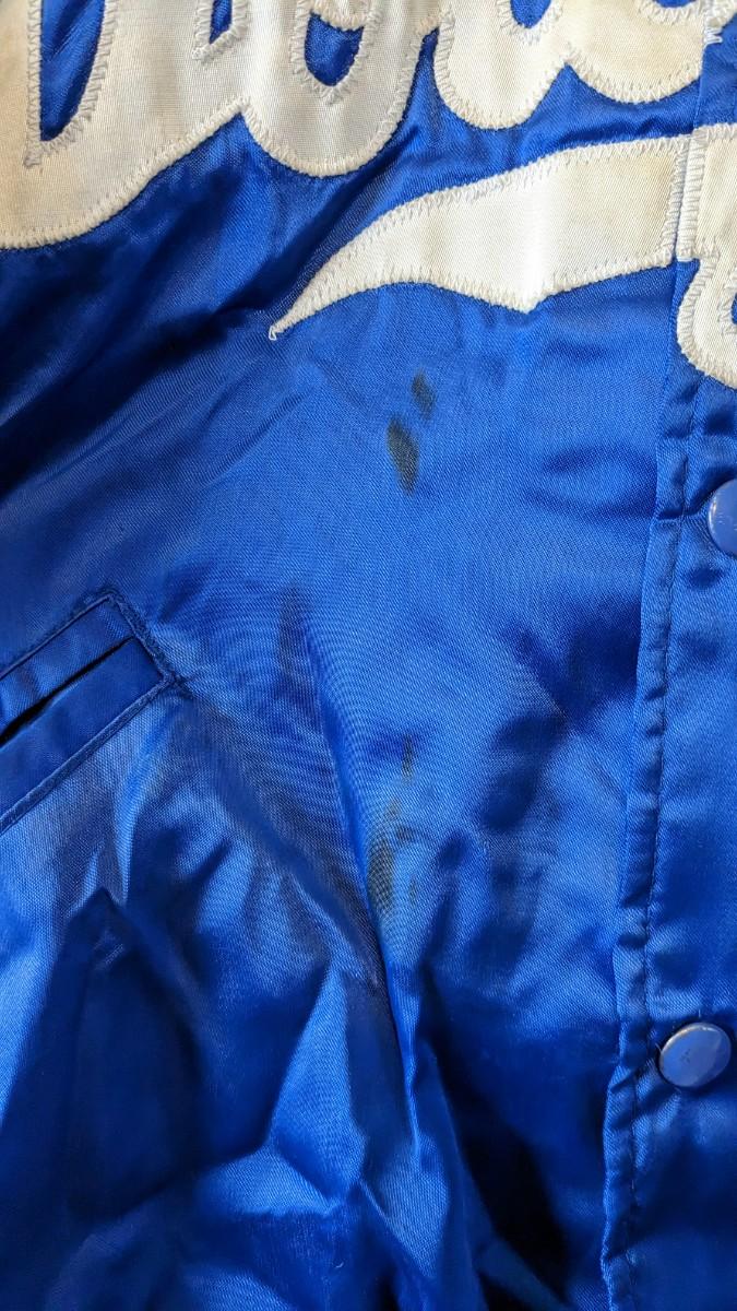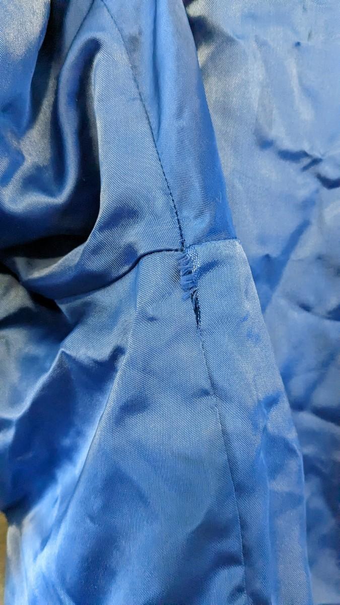 shows significant signs of use with staining on and wear noted. Seam separation on left shoulder and underarm, staining on front and arm, with other spotting. This item has not been laundered so some may come out. Measurements laying flat are 21" pit to pit, 23" neck to end, and 17" shoulders.