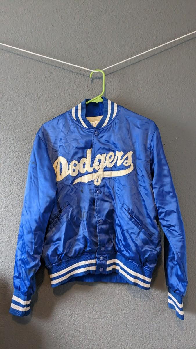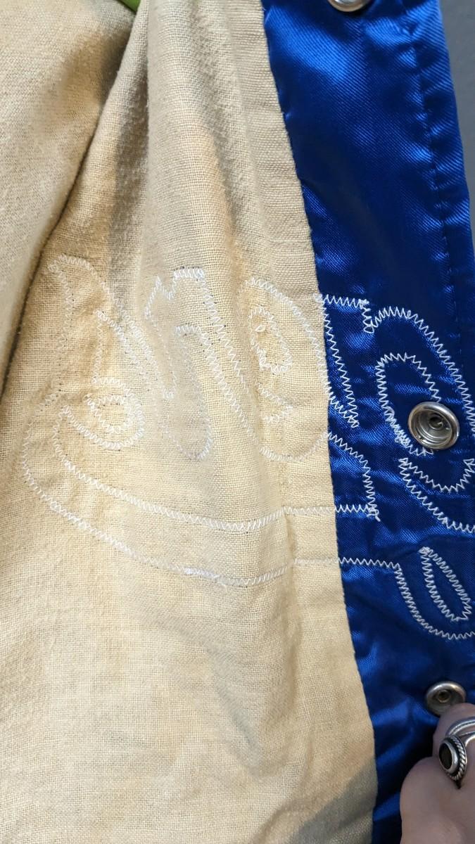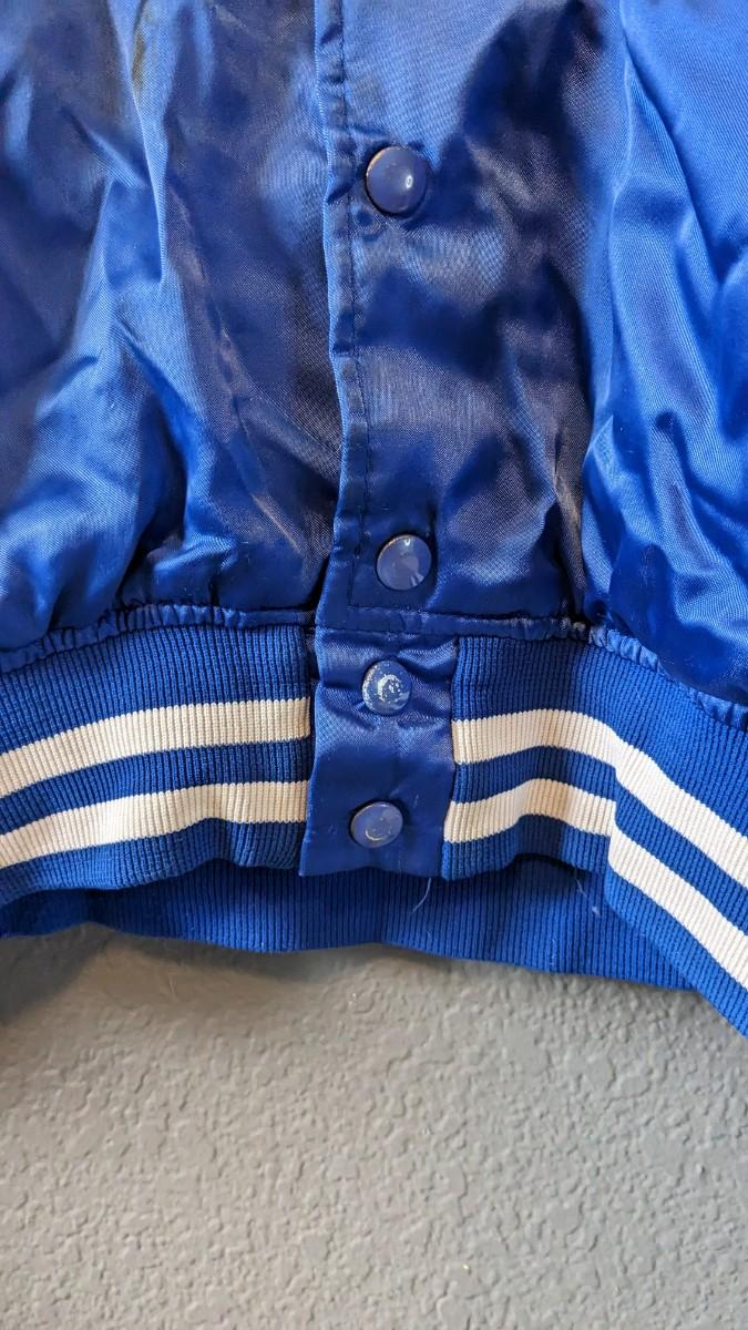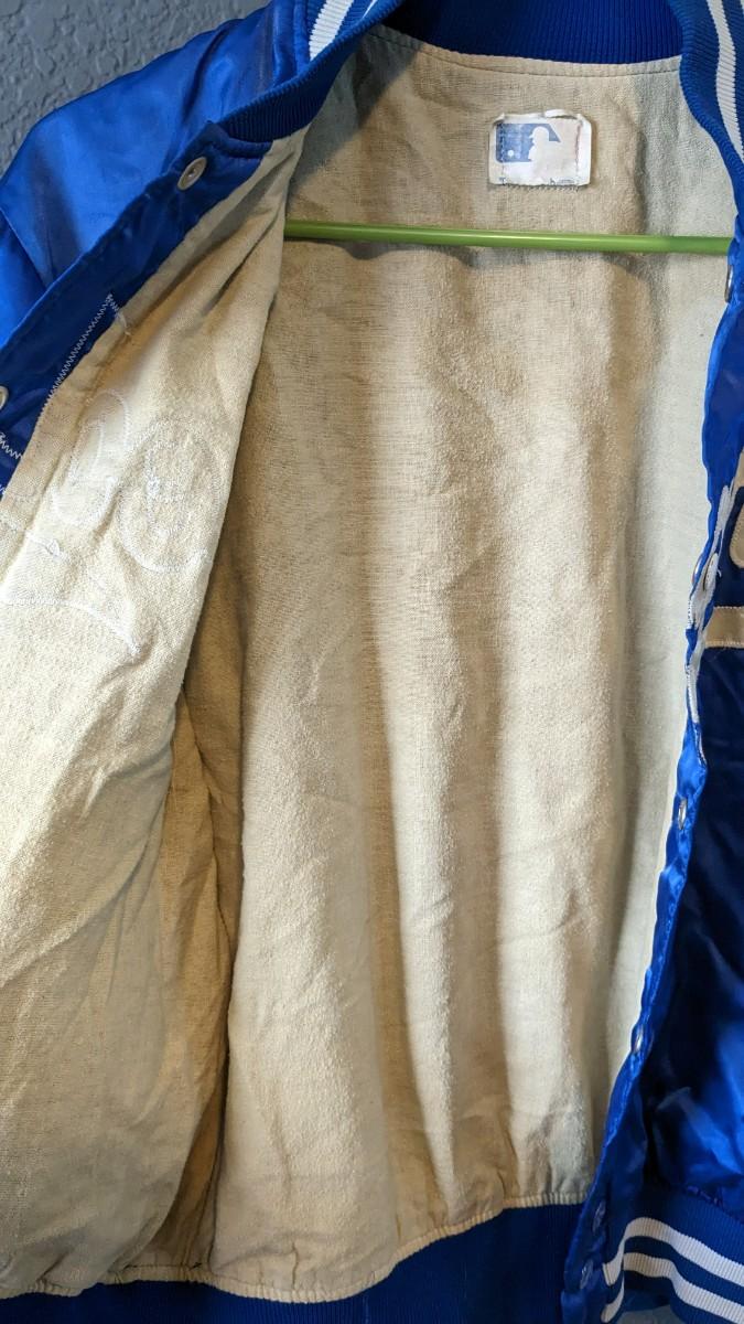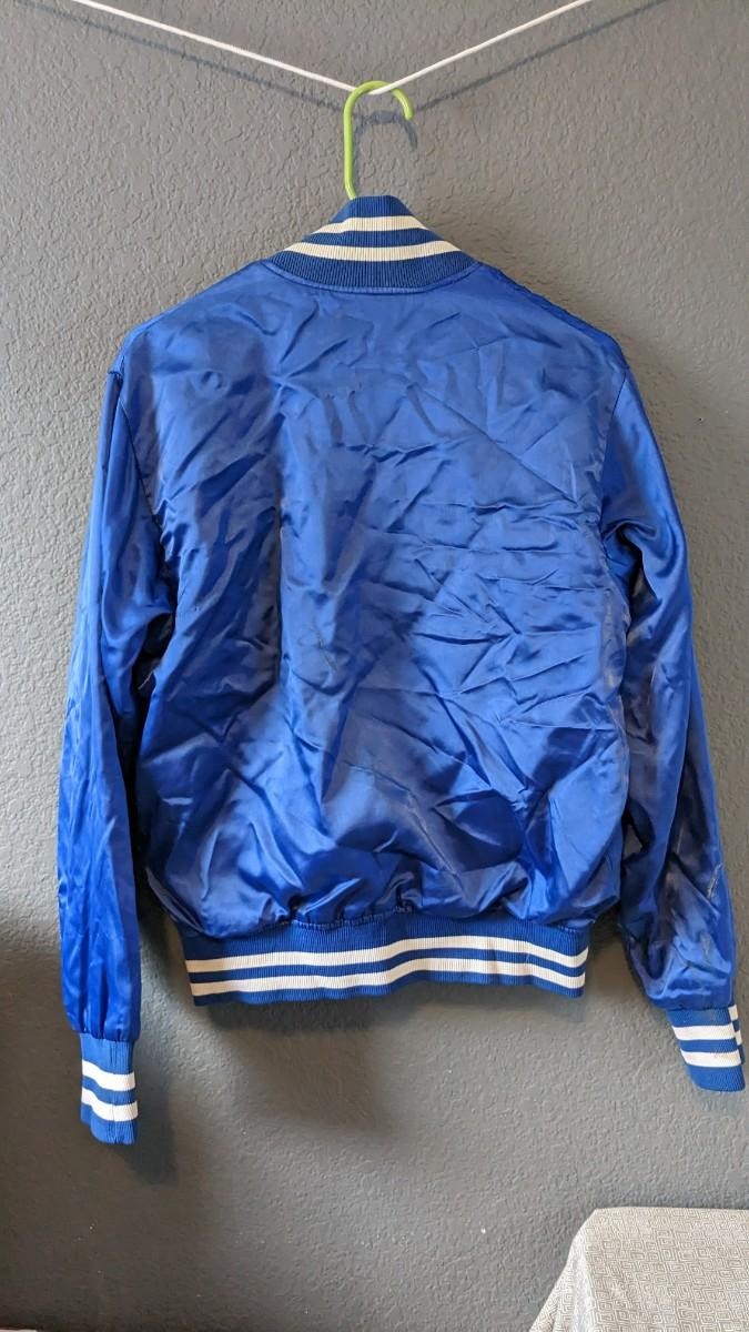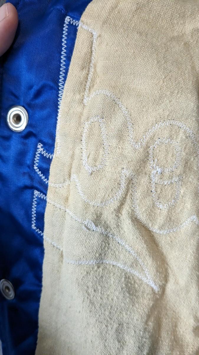 shows significant signs of use with staining on and wear noted. Seam separation on left shoulder and underarm, staining on front and arm, with other spotting. This item has not been laundered so some may come out. Measurements laying flat are 21" pit to pit, 23" neck to end, and 17" shoulders.