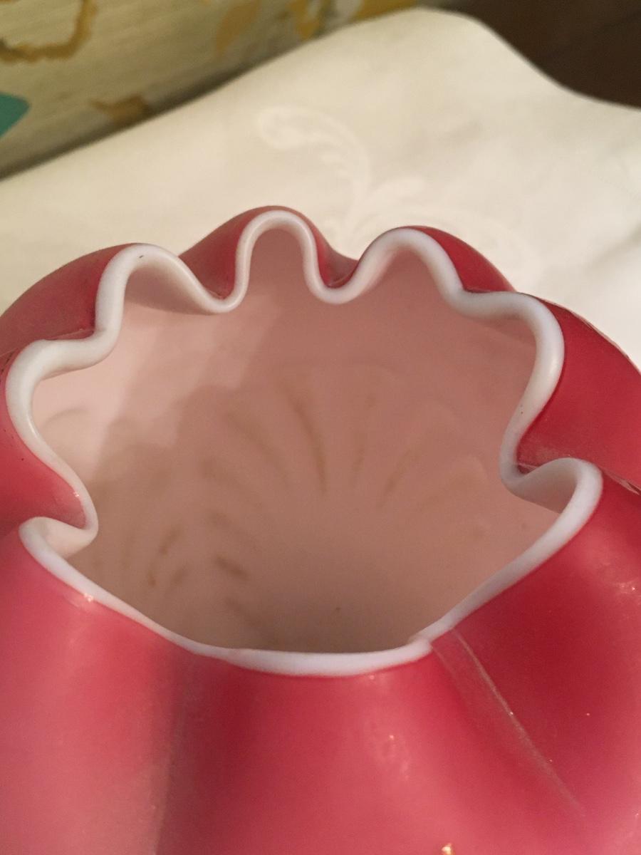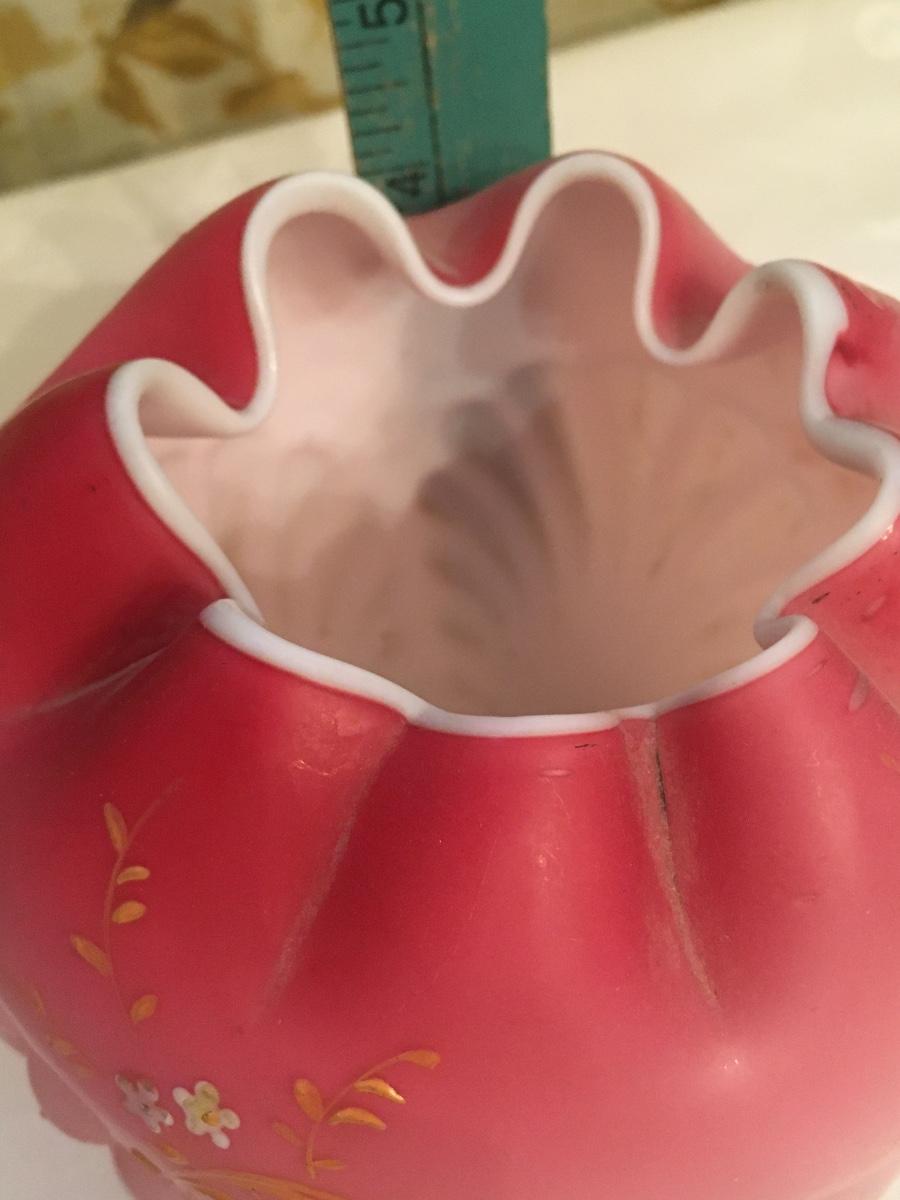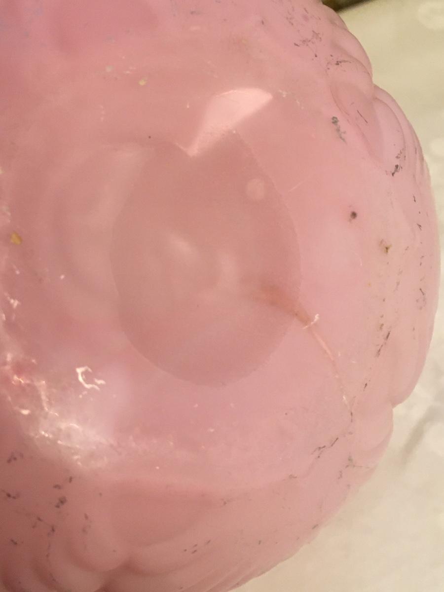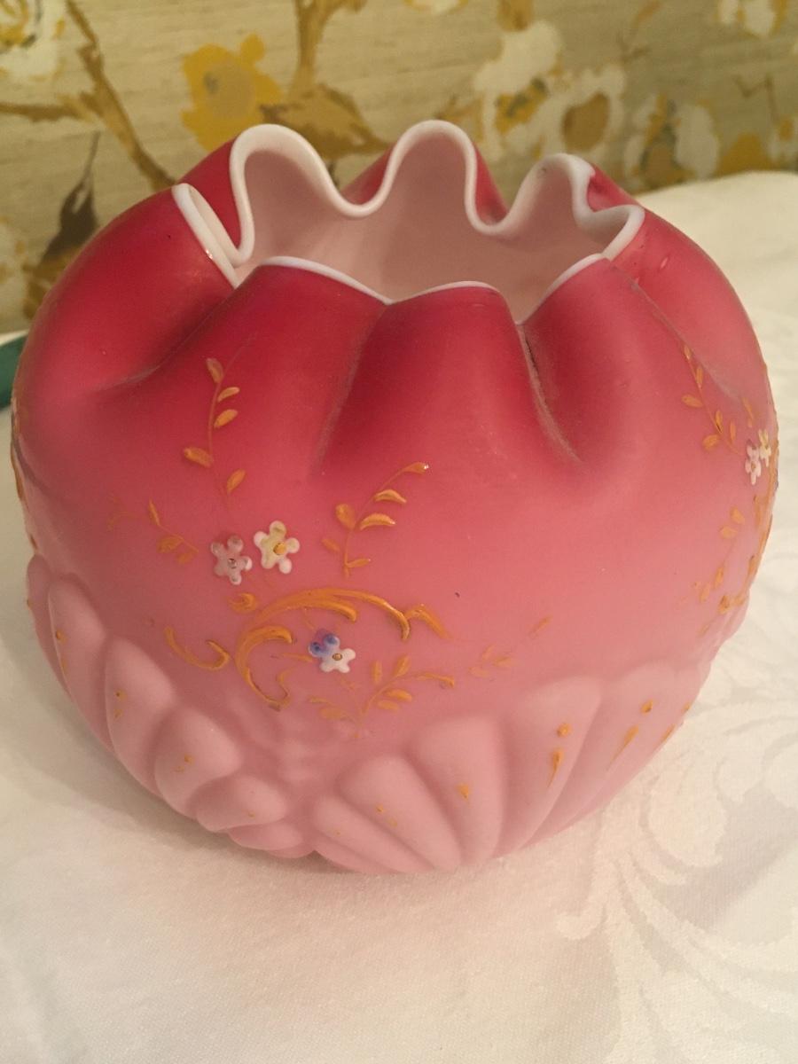 Beautiful vintage Rose bowl in Pink Satin case glass with a Seashell and Coral in relief lower base.