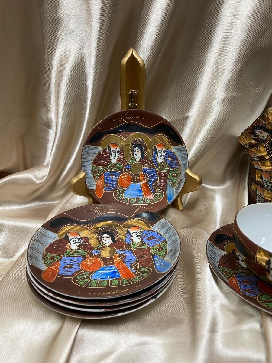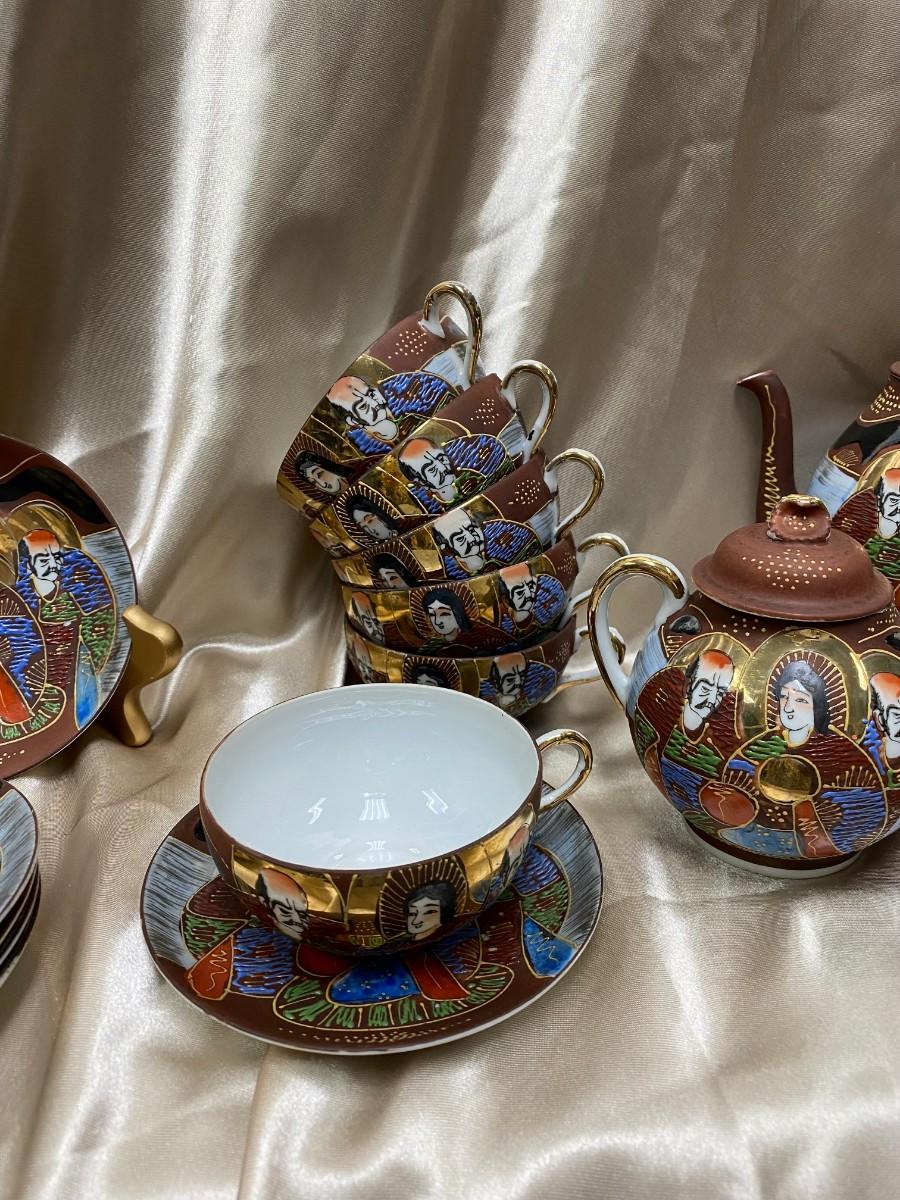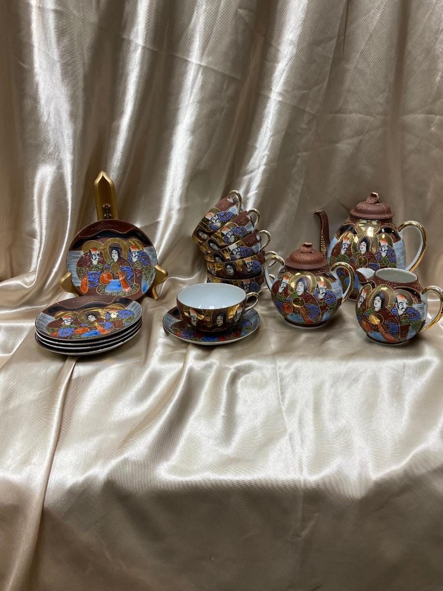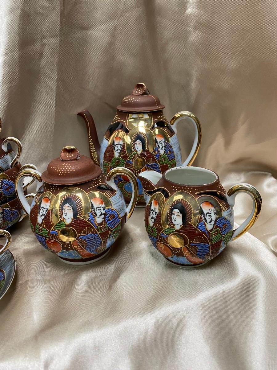 Circa 1930s. The teapot has a crack in the lid, repaired. 7 inches tall.