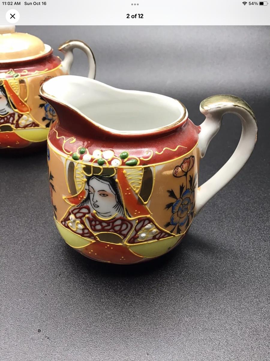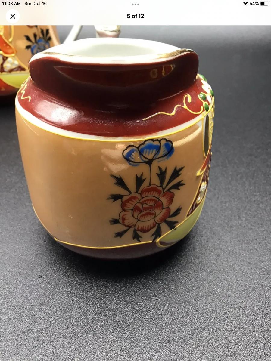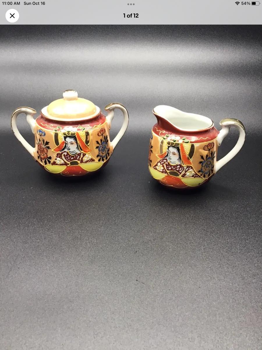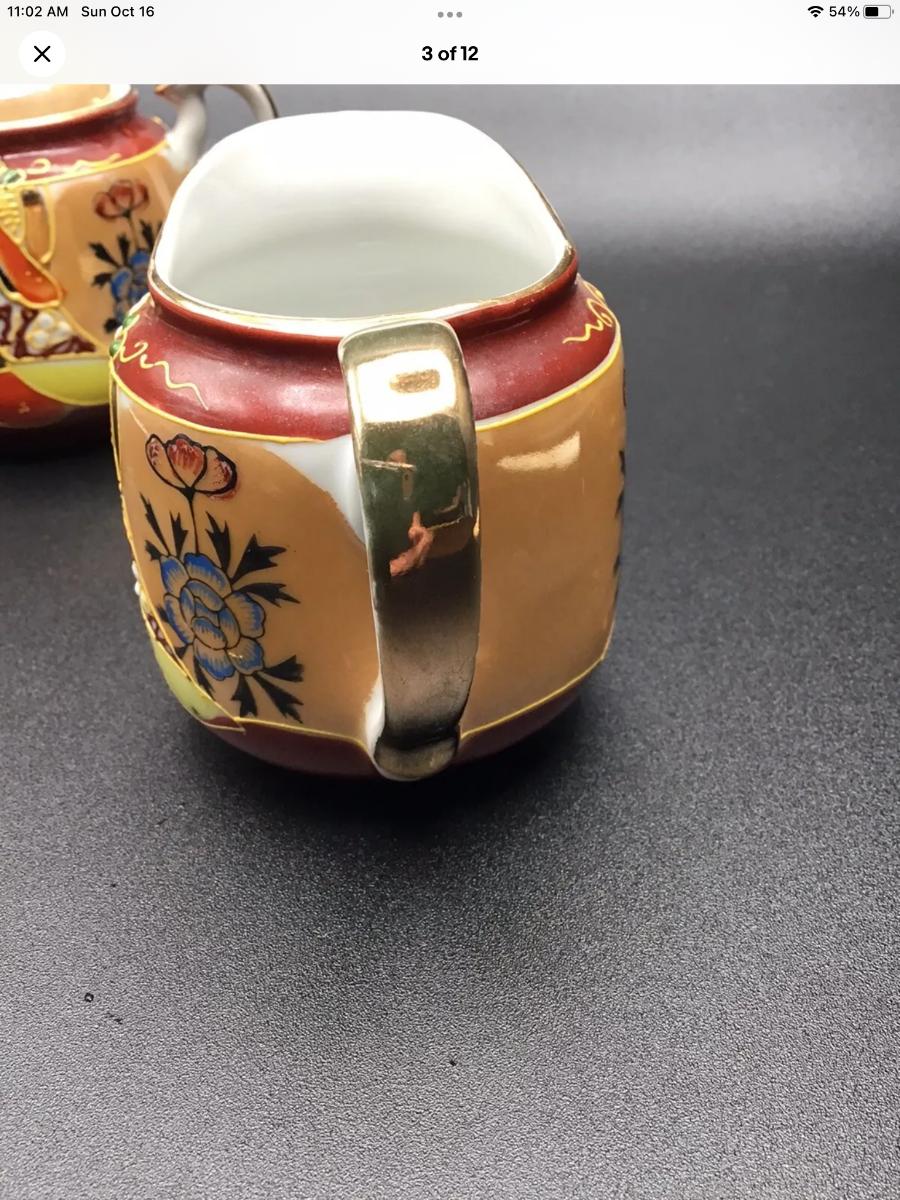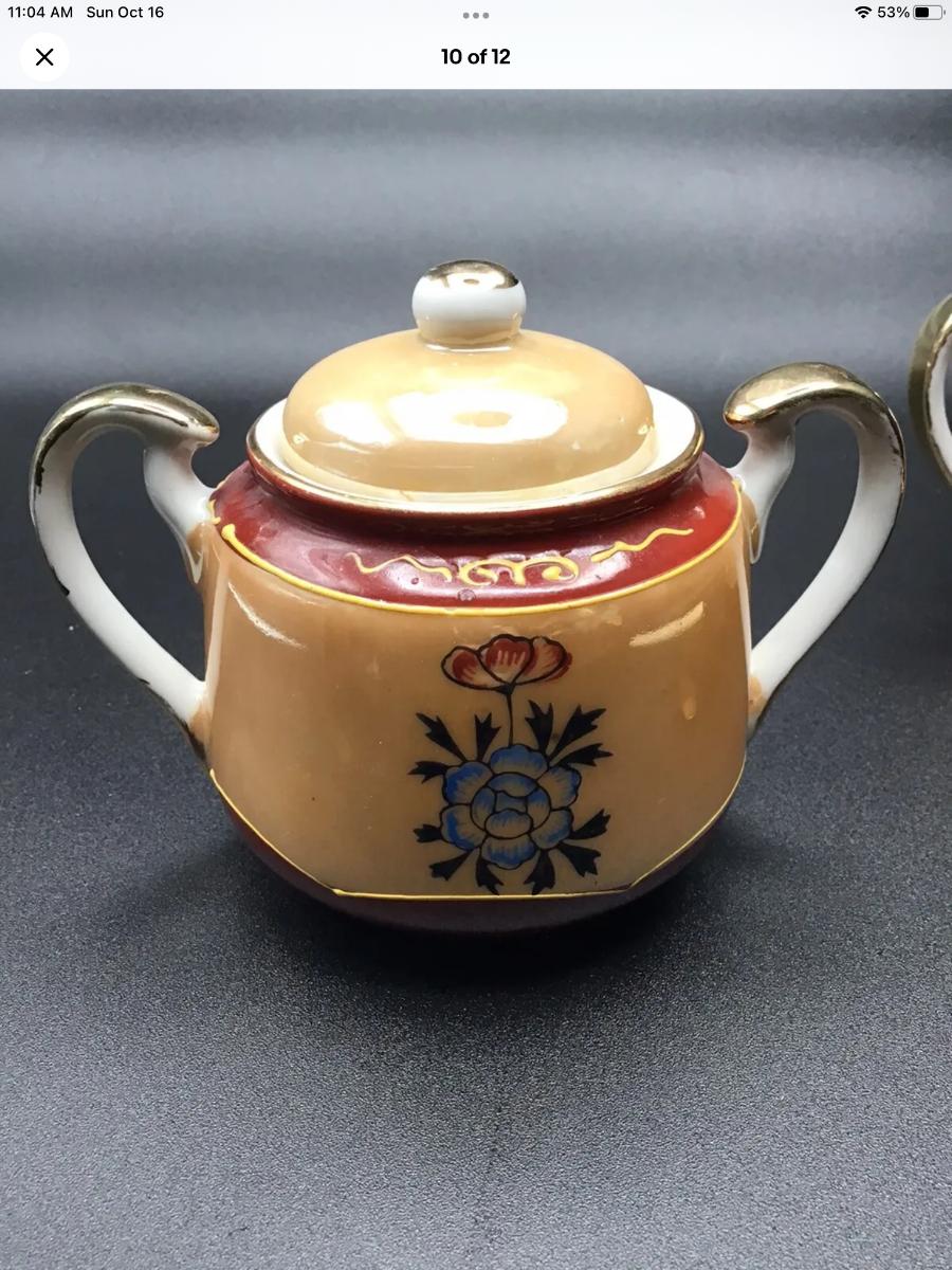 Satsuma Porcelain Cream & Sugar Hand Painted Japan; The finish is reminiscent of Luster Ware and appears to be hand painted with lots of gold detail and on rims and handles. Really interesting and unique design, colors are vibrant and fresh; Measures: Sugar Bow - 4: high x 5" wide including handles, Creamer - 3.25" high x 3.5" wide including handles; The “foreign” stamp on the bottom indicates these were made in 1923 or before. Considering the age, there’s little paint ware and the gold is still bright.