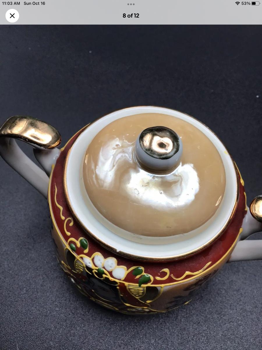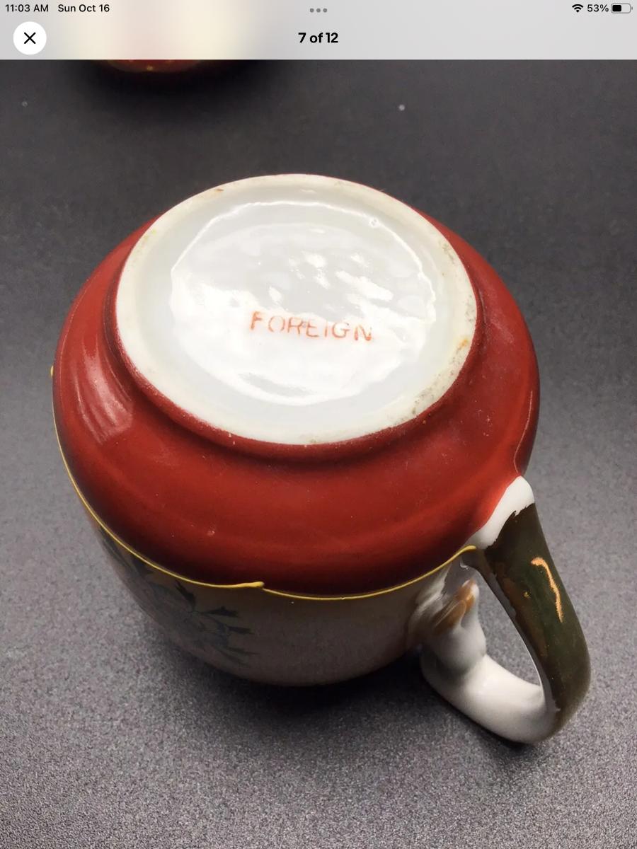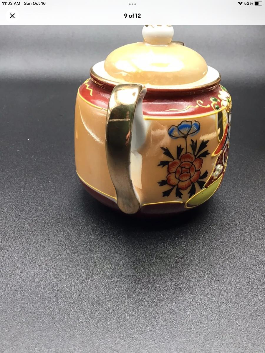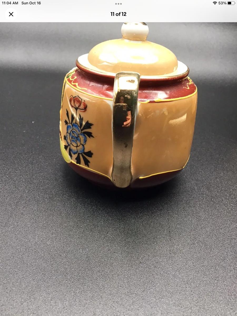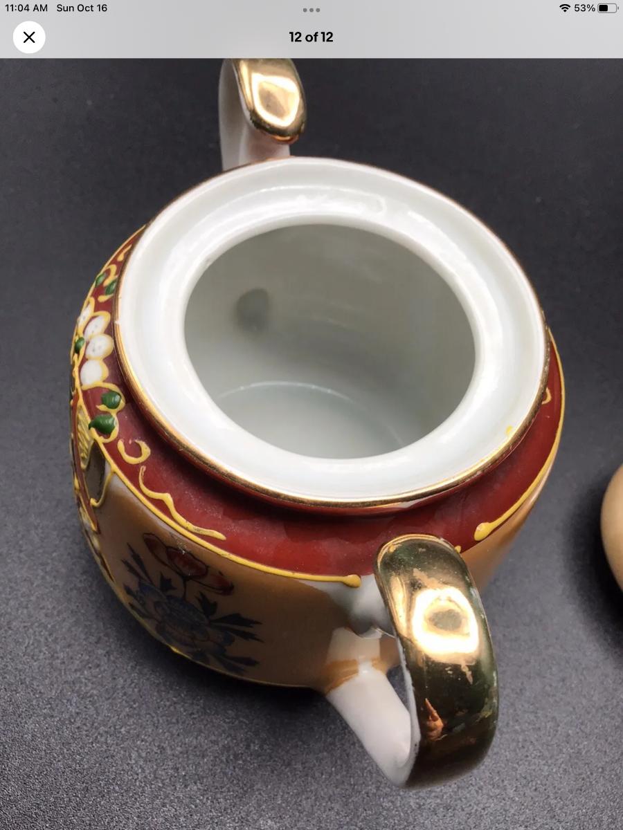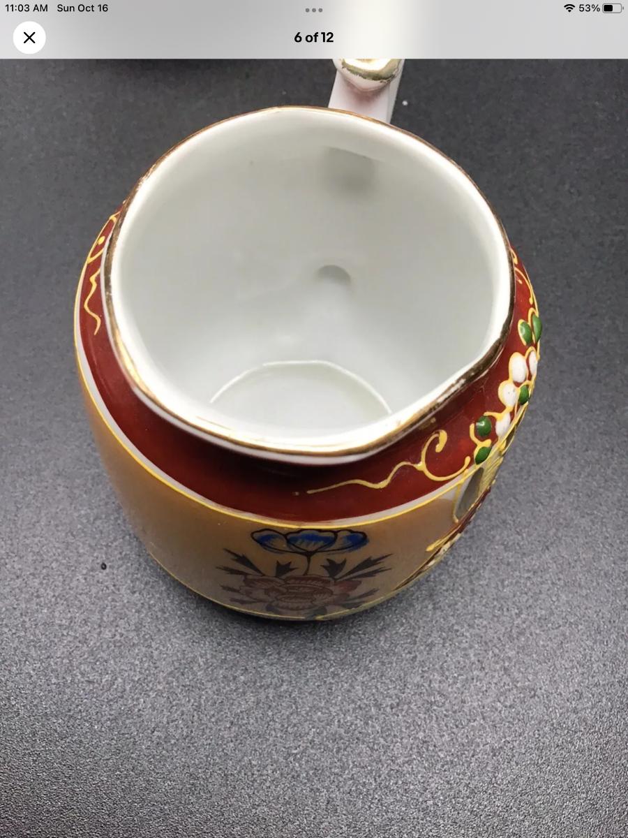 Satsuma Porcelain Cream & Sugar Hand Painted Japan; The finish is reminiscent of Luster Ware and appears to be hand painted with lots of gold detail and on rims and handles. Really interesting and unique design, colors are vibrant and fresh; Measures: Sugar Bow - 4: high x 5" wide including handles, Creamer - 3.25" high x 3.5" wide including handles; The “foreign” stamp on the bottom indicates these were made in 1923 or before. Considering the age, there’s little paint ware and the gold is still bright.
