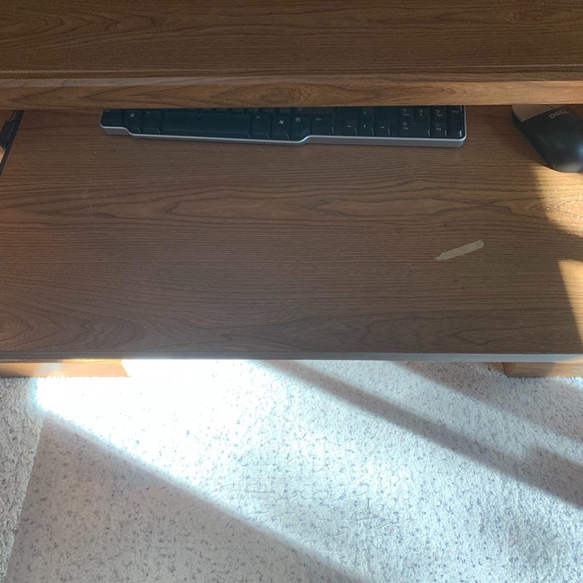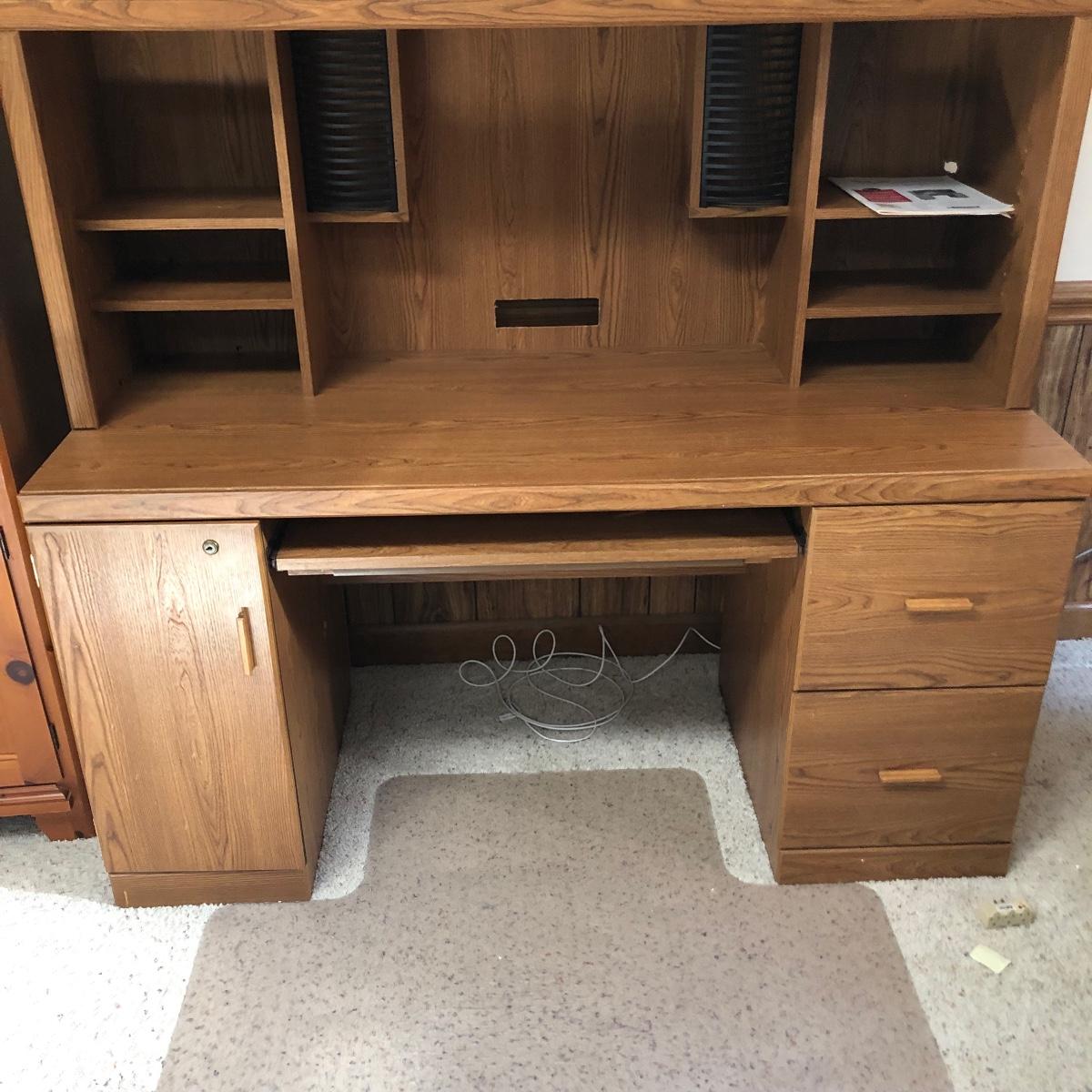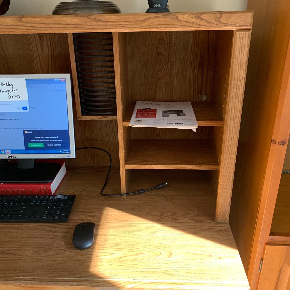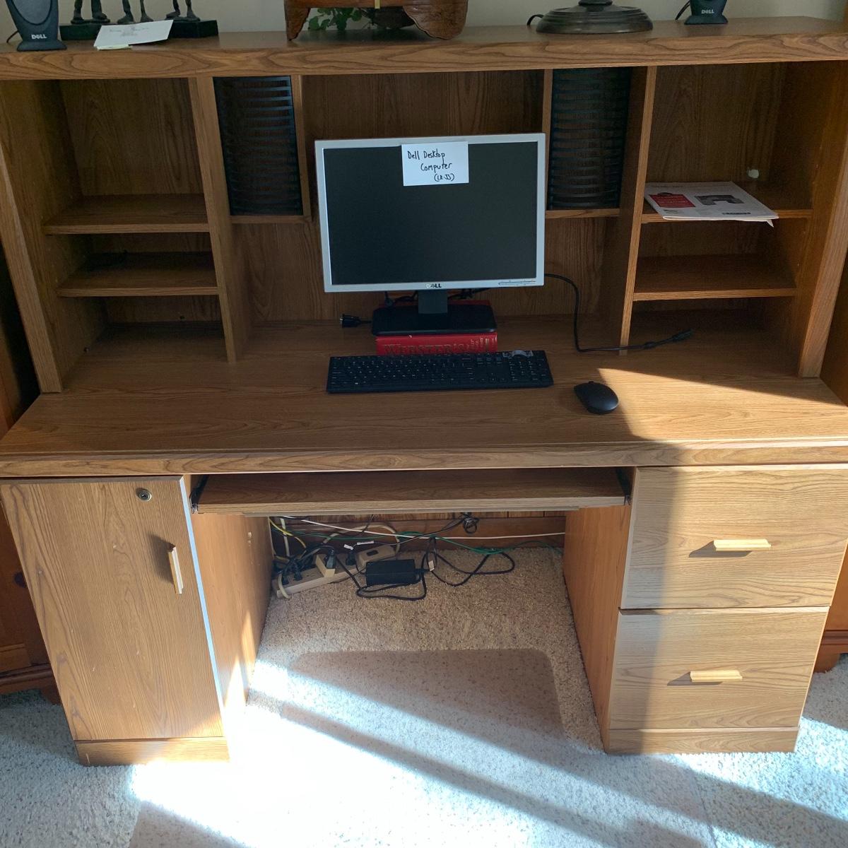 This desk features two drawers, a storage bay, a retractable typewriter tray, and a storage hutch to go on top. This desk is made of pressed wood, and is in overall good condition. Computer not included. Desk measures 24” x 60” x 54”.