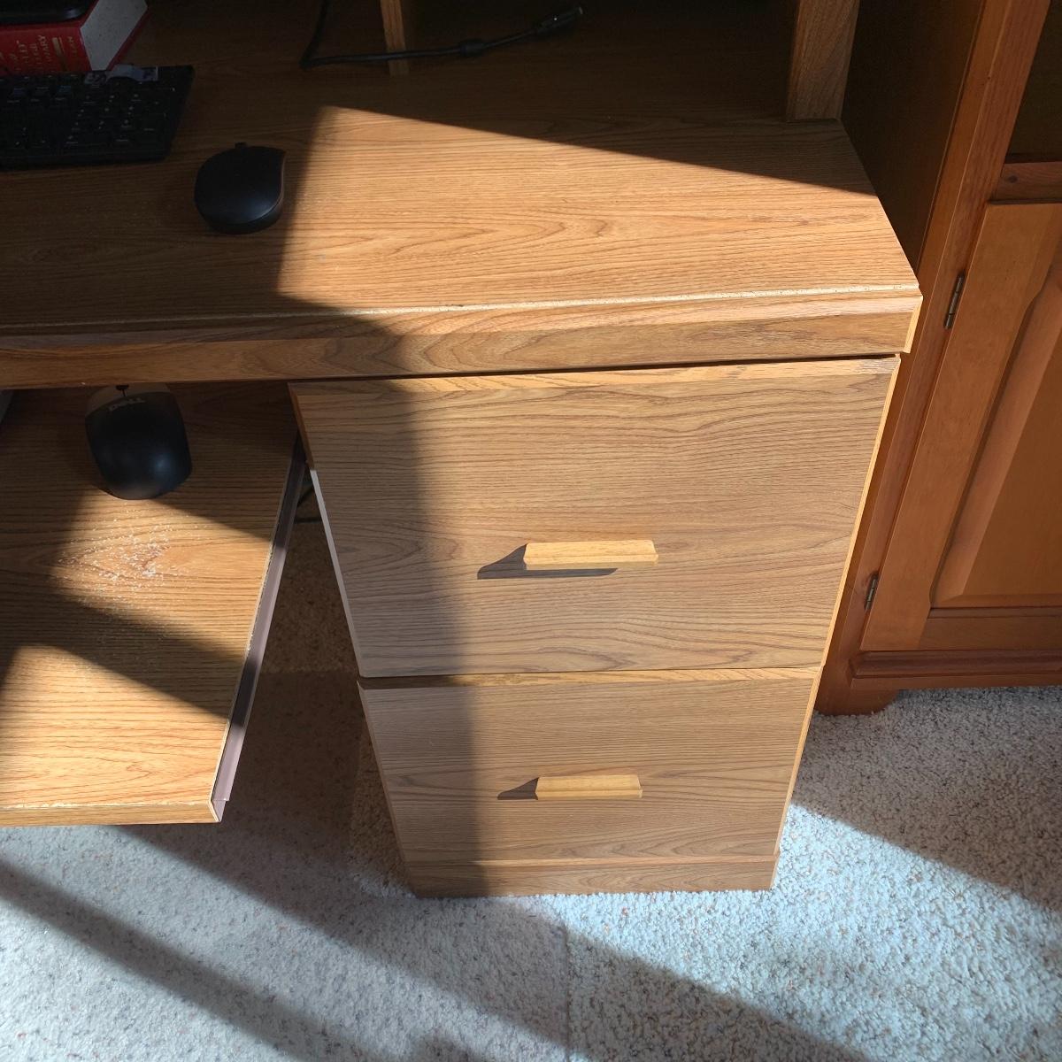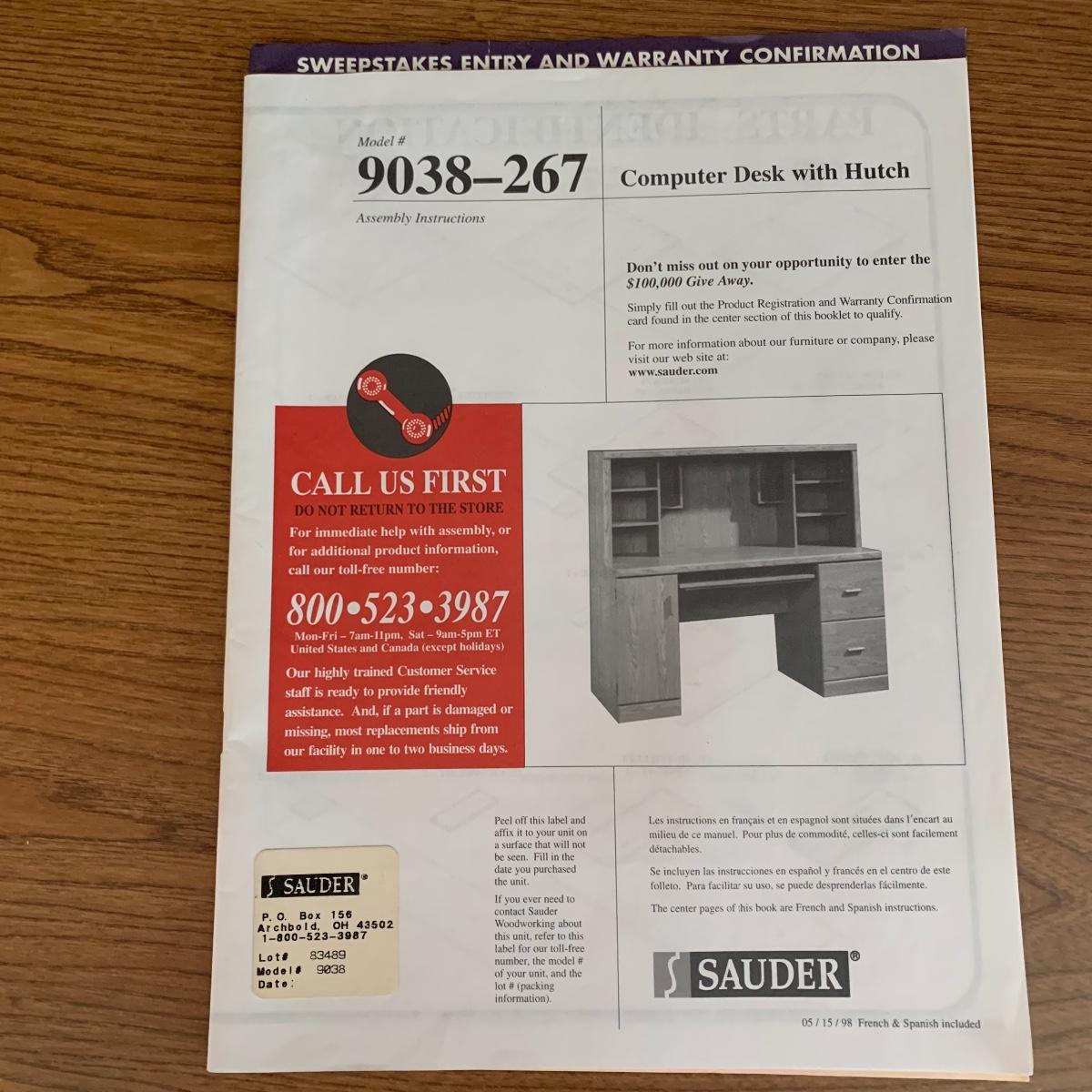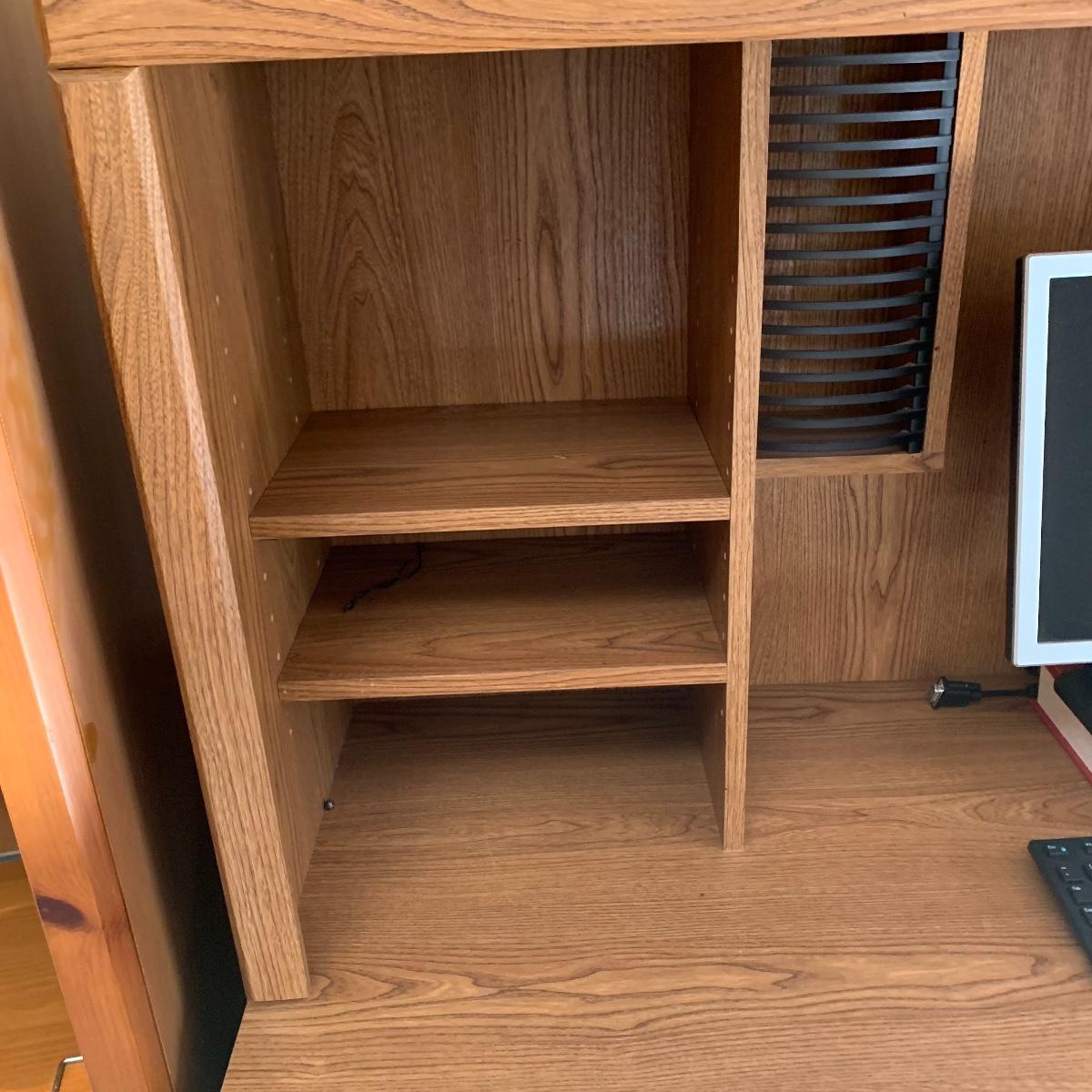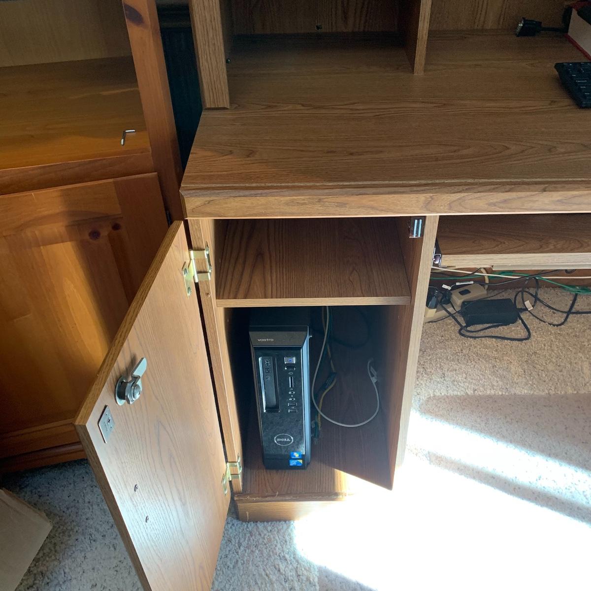 This desk features two drawers, a storage bay, a retractable typewriter tray, and a storage hutch to go on top. This desk is made of pressed wood, and is in overall good condition. Computer not included. Desk measures 24” x 60” x 54”.