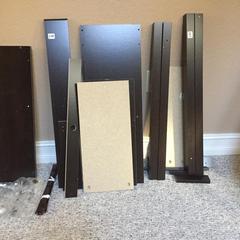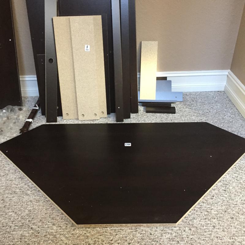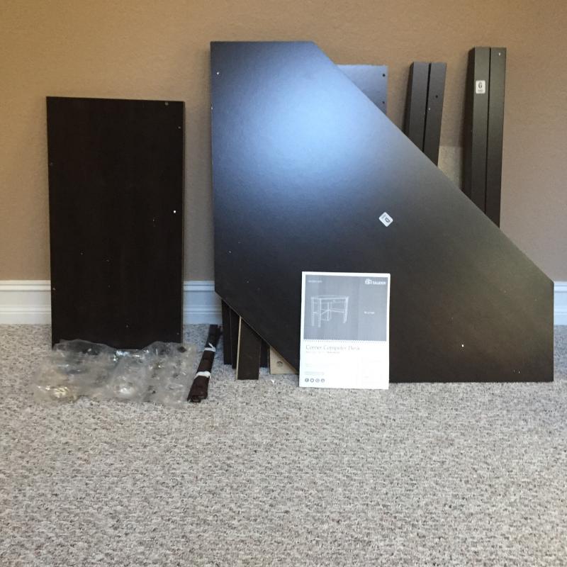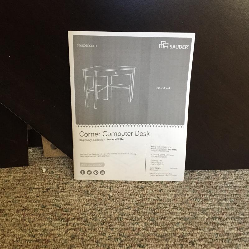 Sauder corner computer desk #412314. Brand new Desk out of box it looks like all parts are here-see pictures. According to Sauder website desk measures 45.945"W x 23.386"D x 29.921"H.