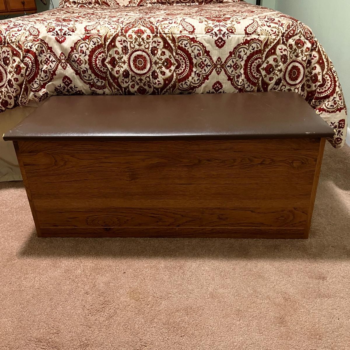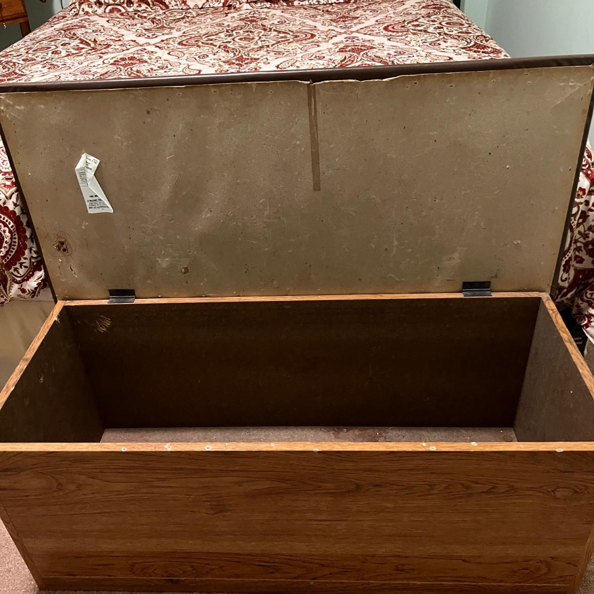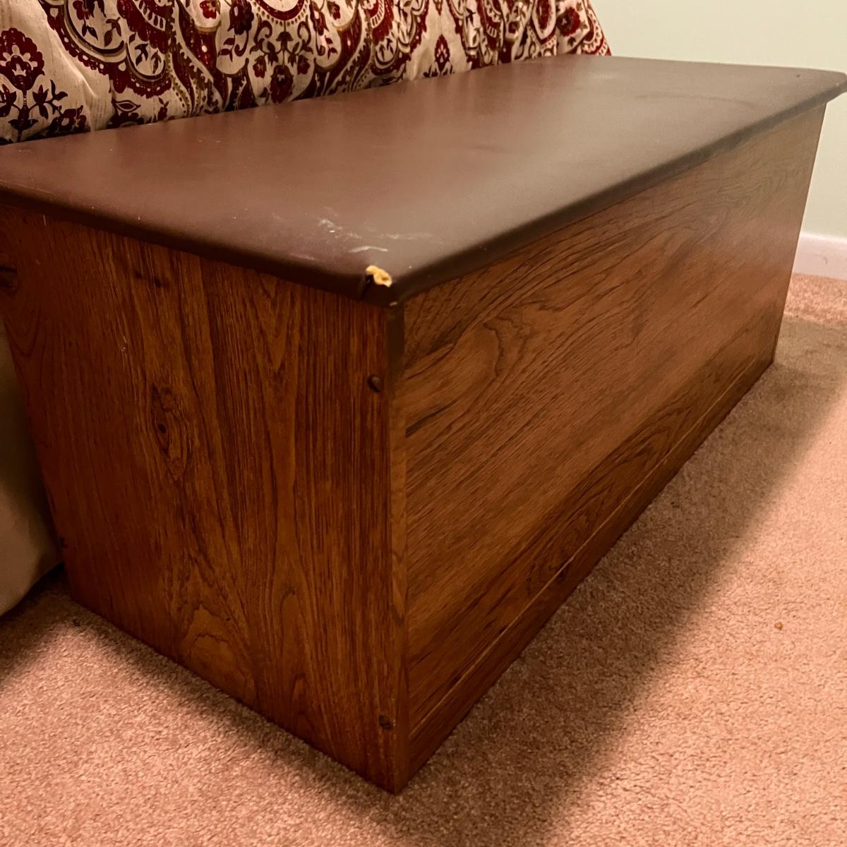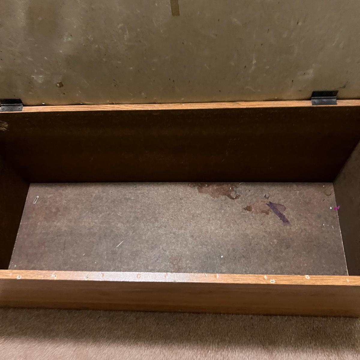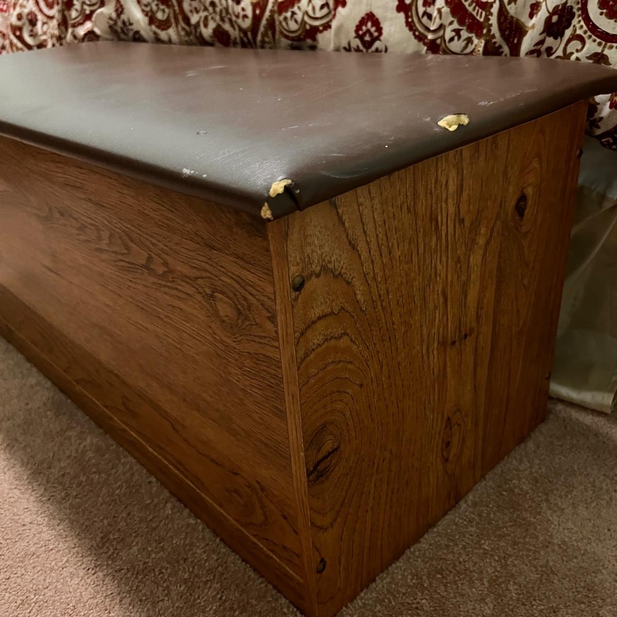 Multi-use piece by Sauder Woodworking piece - storage chest, end of the bed bench, toy box. The vinyl has some tears as shown in pics.
