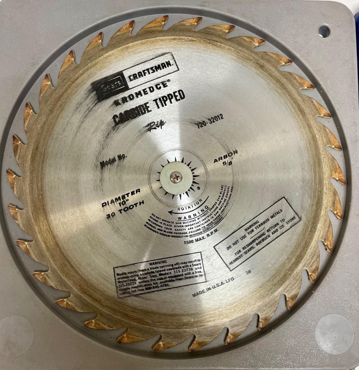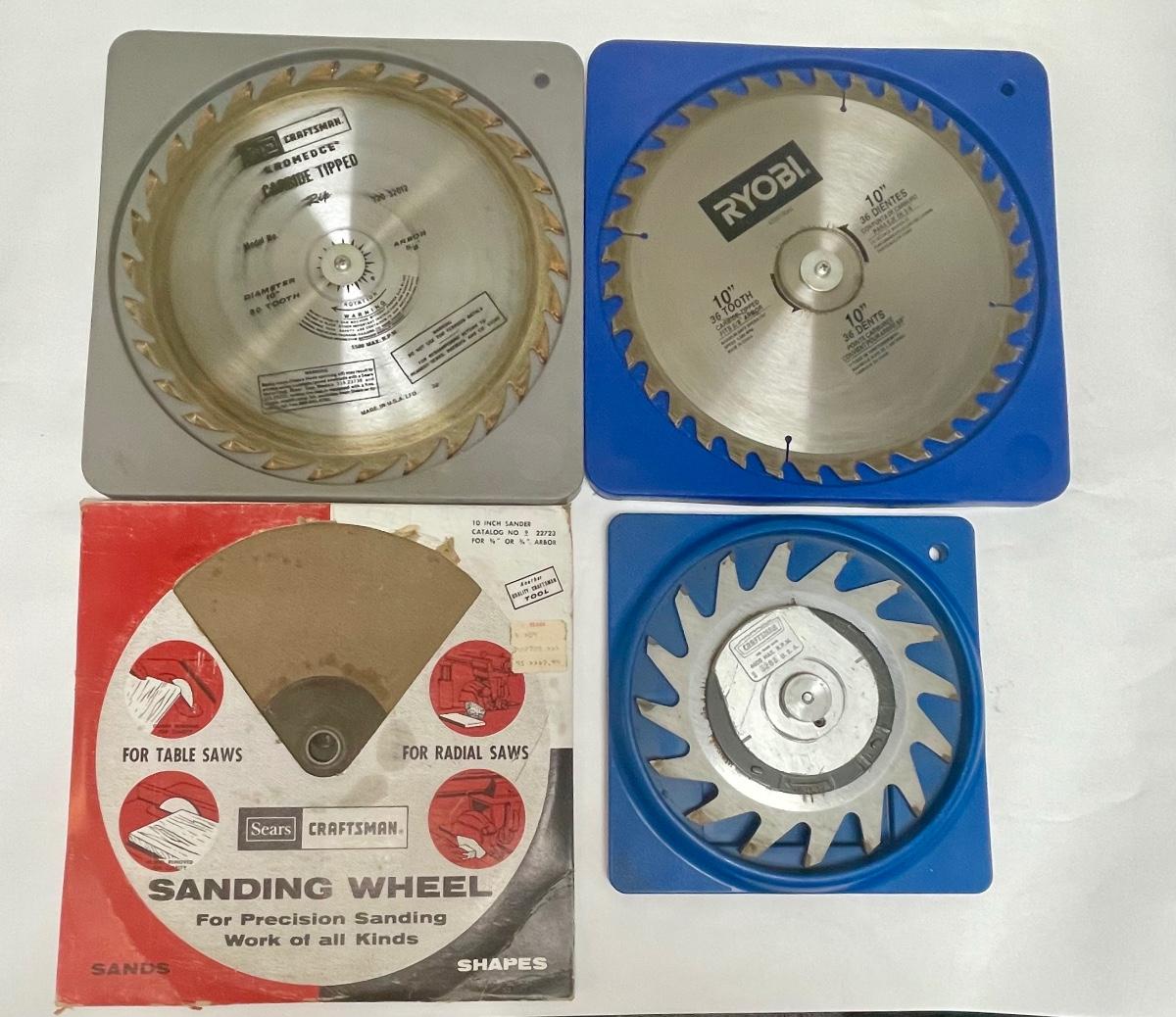 Lot includes 4 items: (2) 10-inch saw blades, (1) package of 10-inch sanding disks, and (1) 7-inch adjustable dado blade.