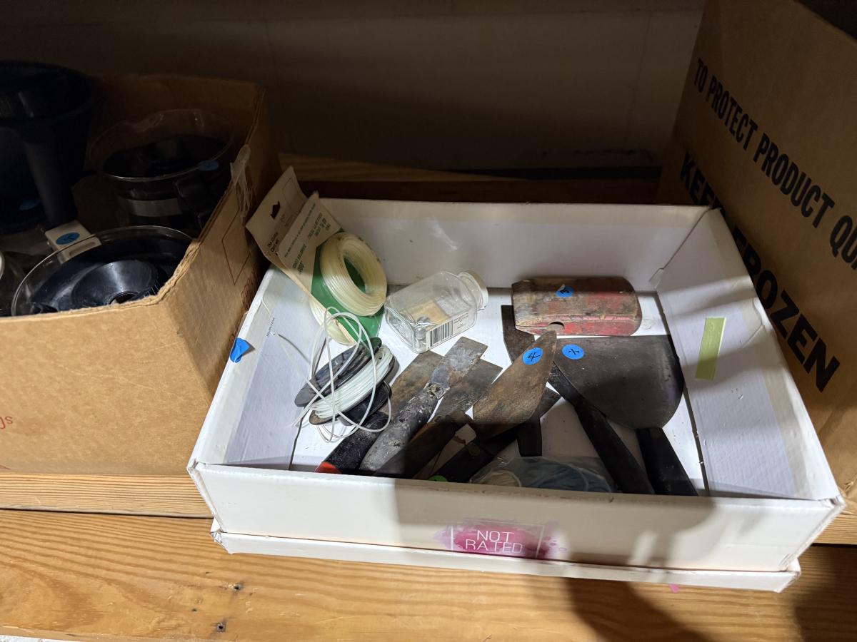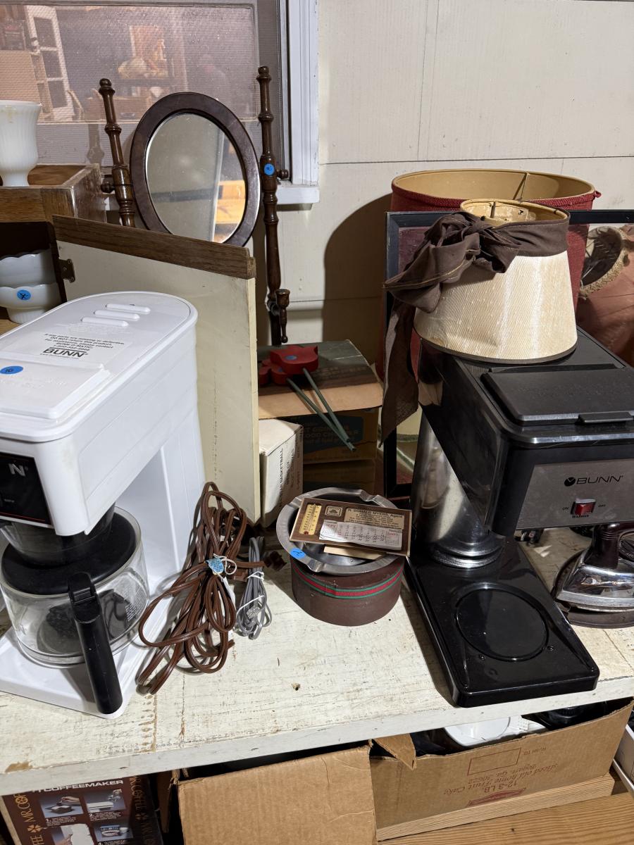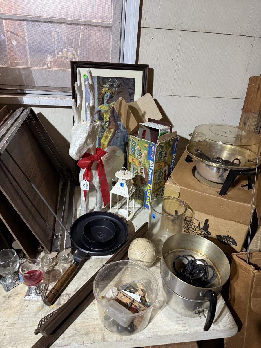 Middle garage: saw horses, long boards, misc kitchen items, fan, cabinet, chair, painting tools, coffee maker, toaster, toaster ovens, hanging lamp, scrap wood, & more