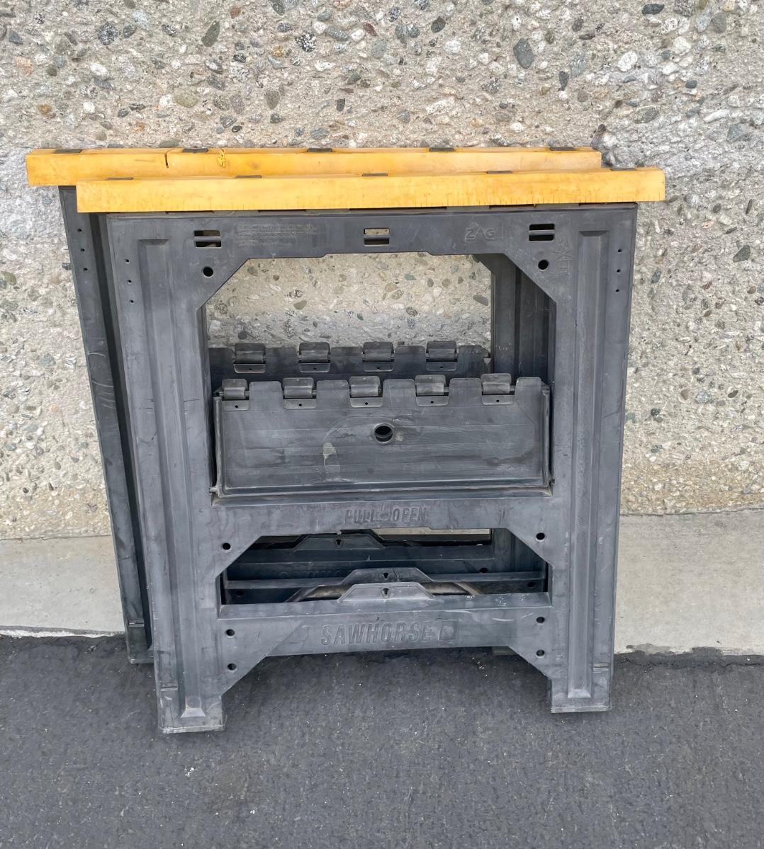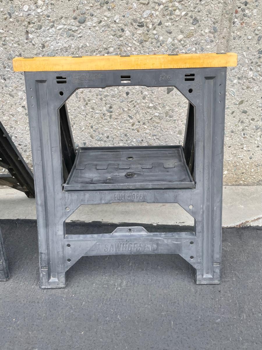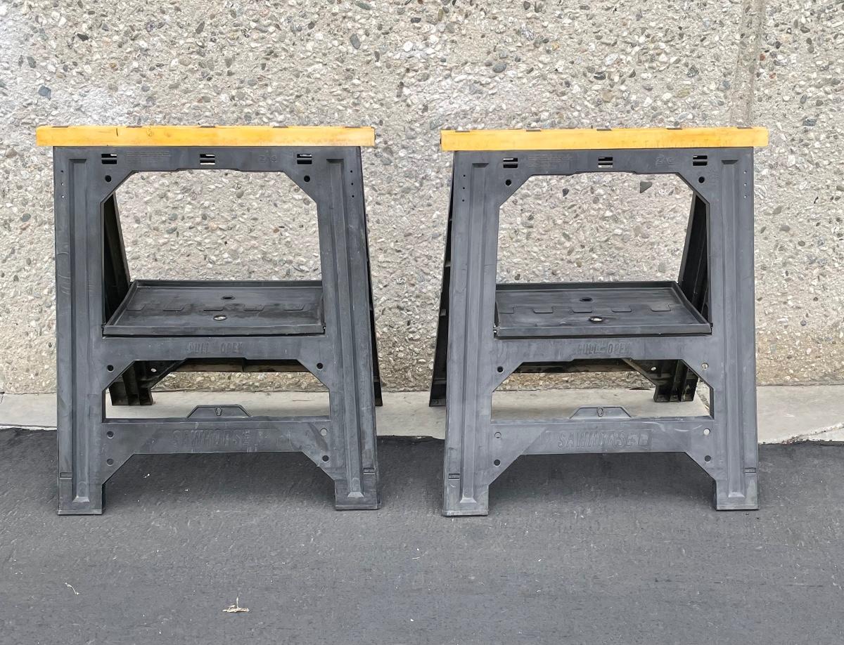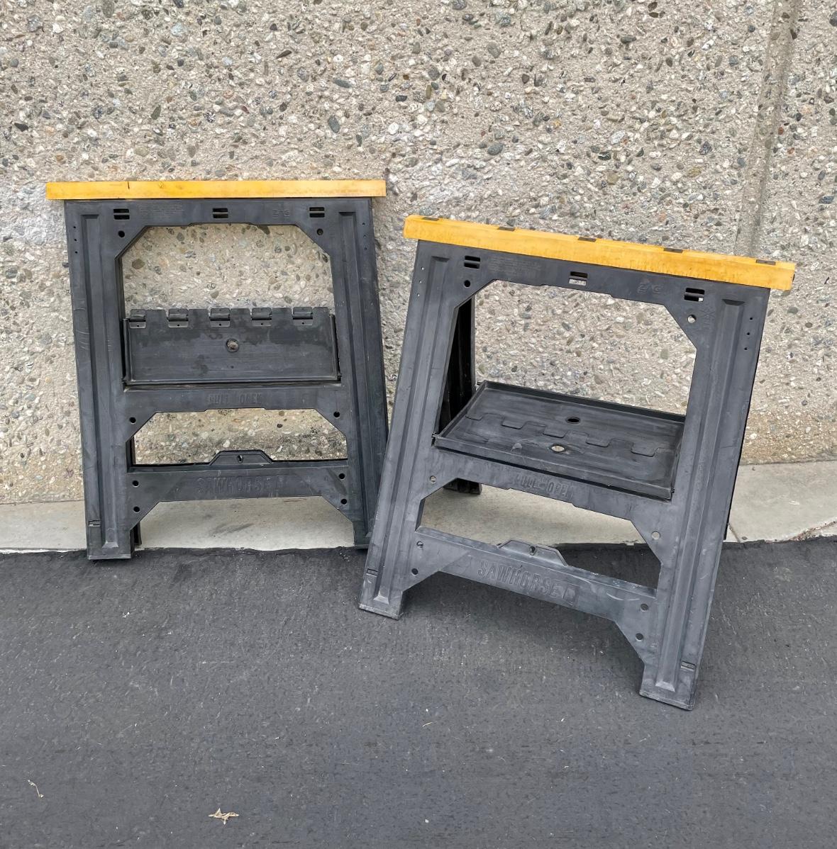 Pair of weatherproof sawhorses by ZAG. Measures approx. 27" across the top fail. Rated to support 1000 pounds per pair. Folds flat for easy storage. Great addition to any home workshop.