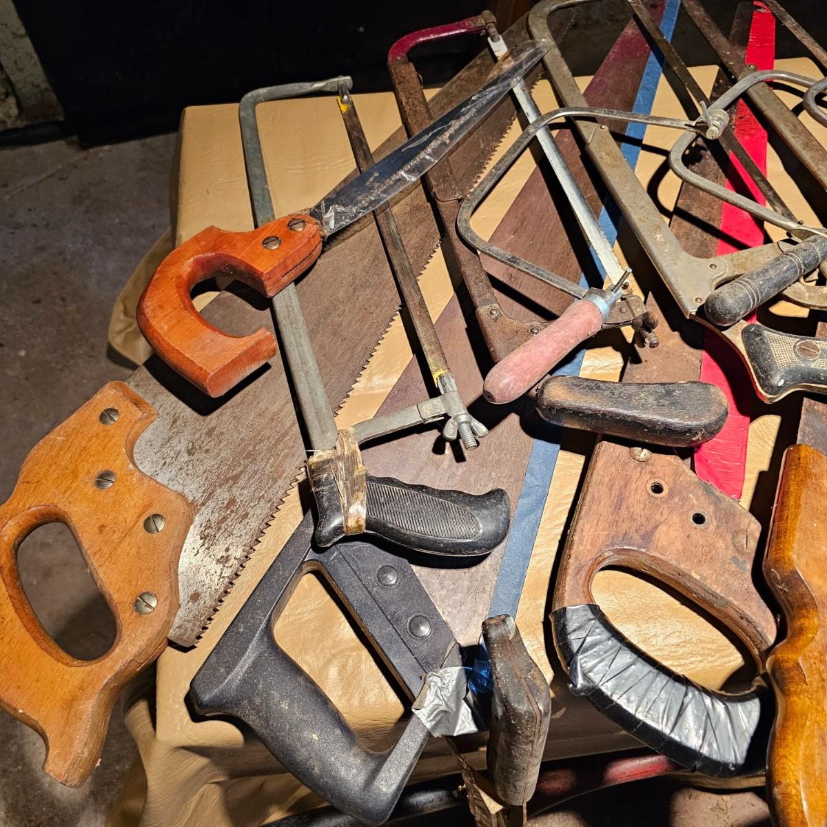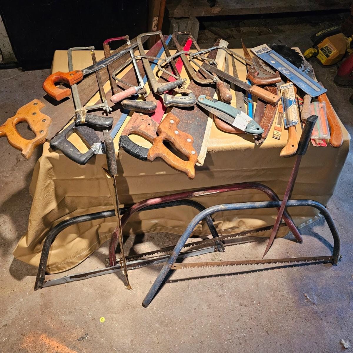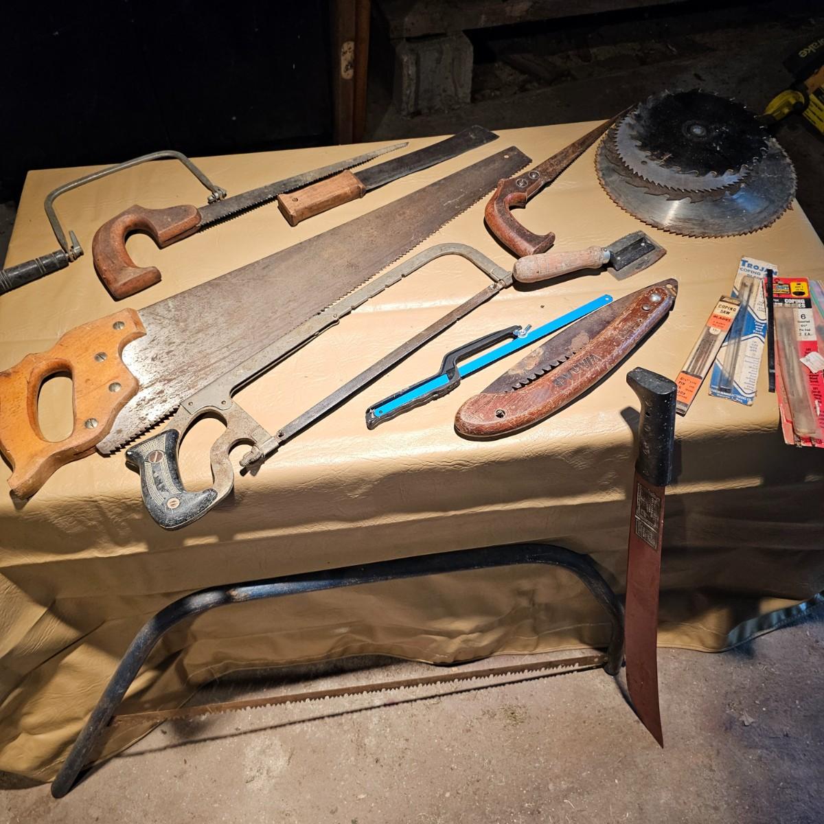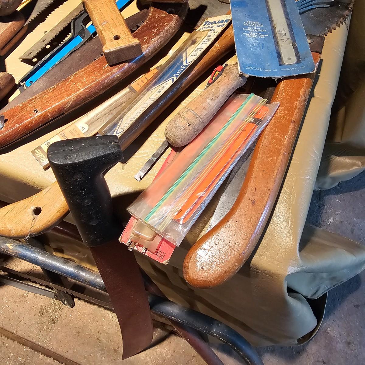 Large assortment of hand saws, coping saws, hacksaws, tree bow saws, drywall saws, machetes, others. Cross cut, machete and hand saws all average 28" long. See photos for details. Local pickup only.