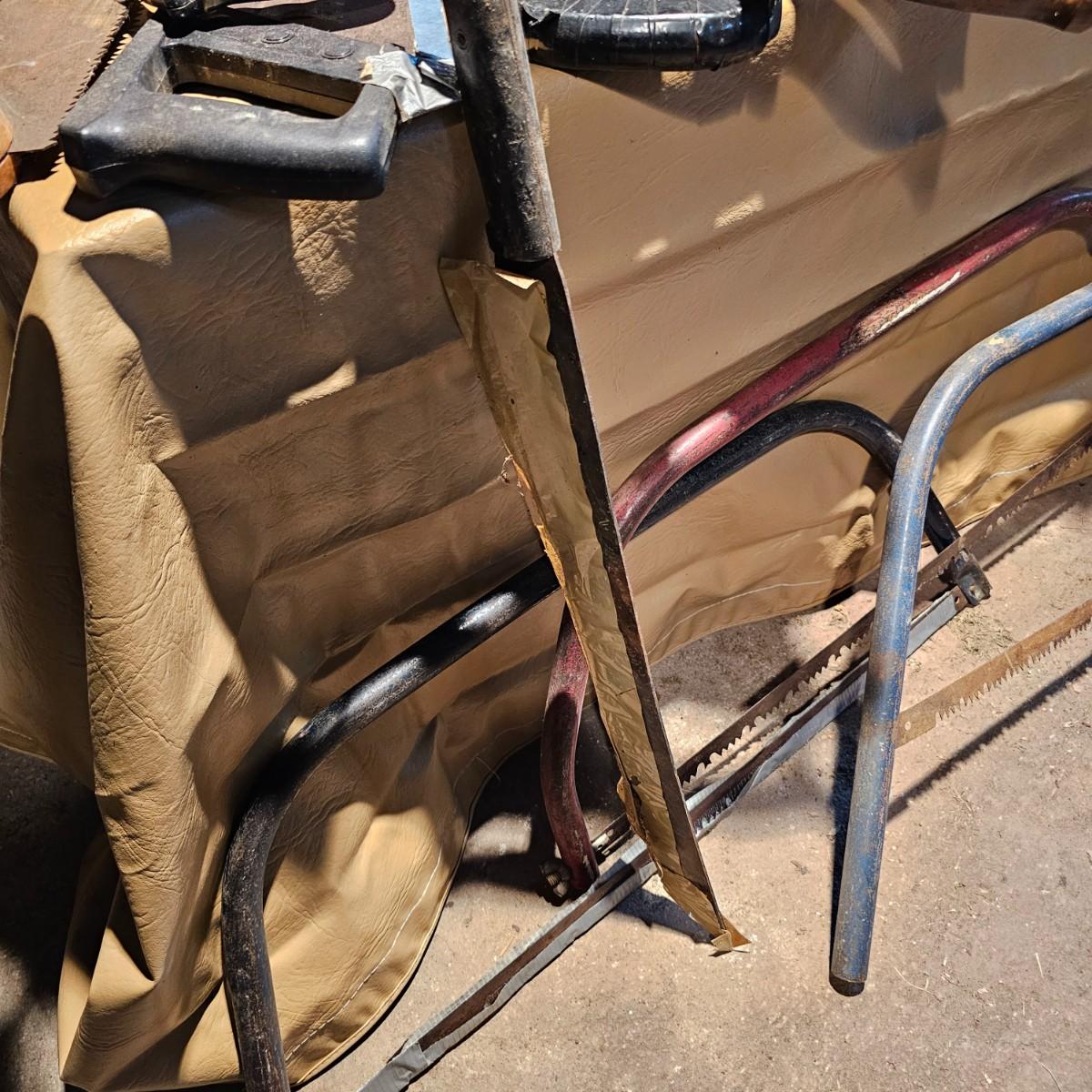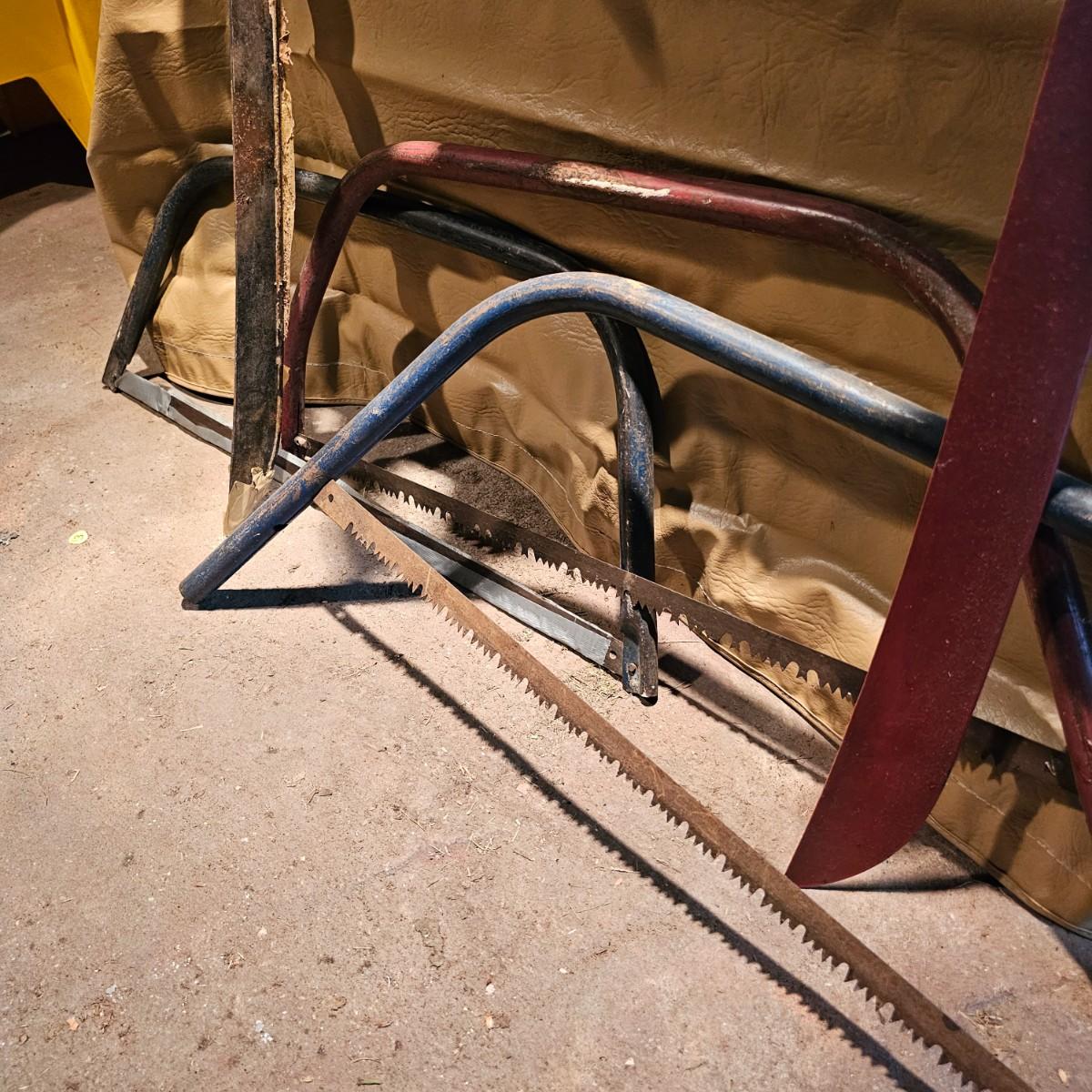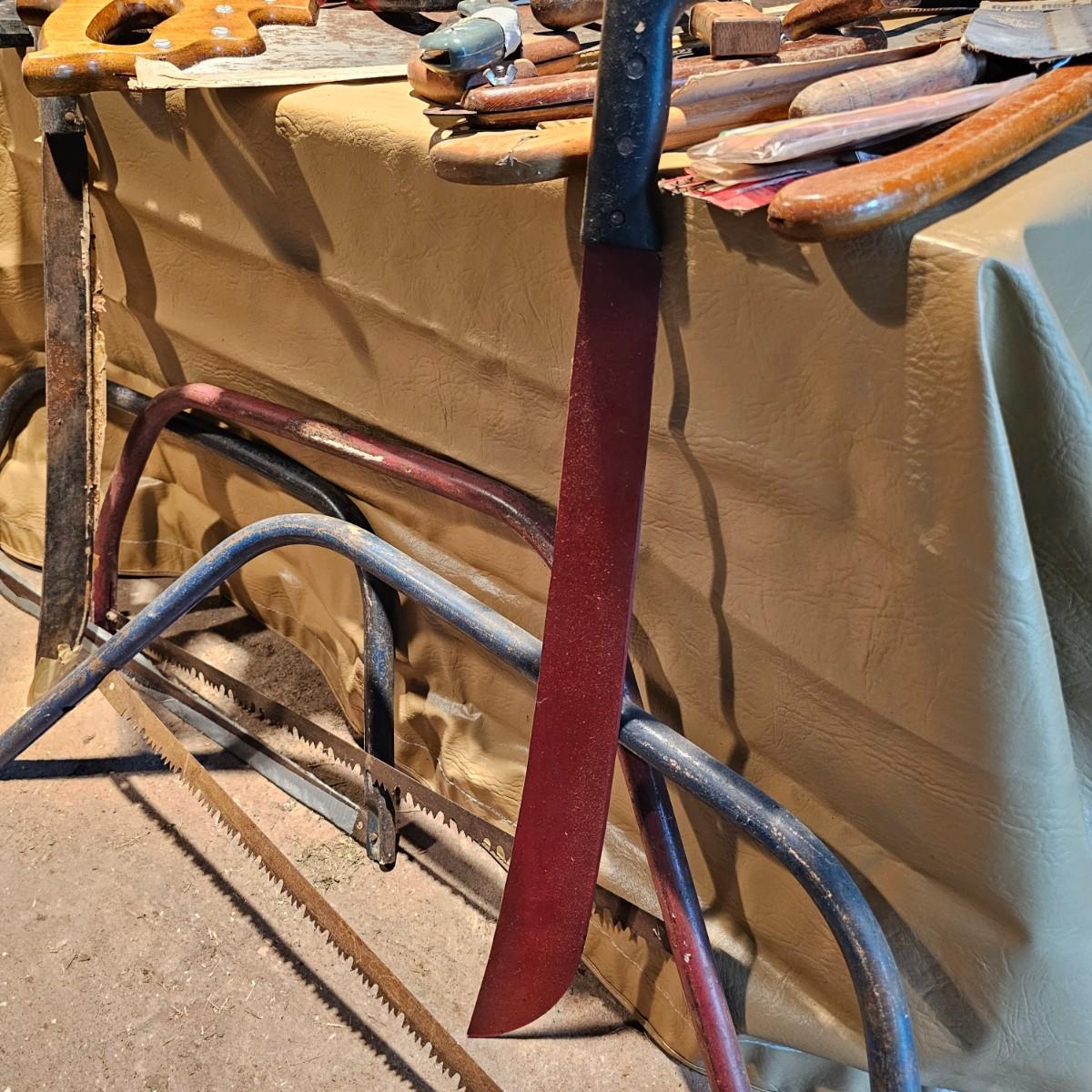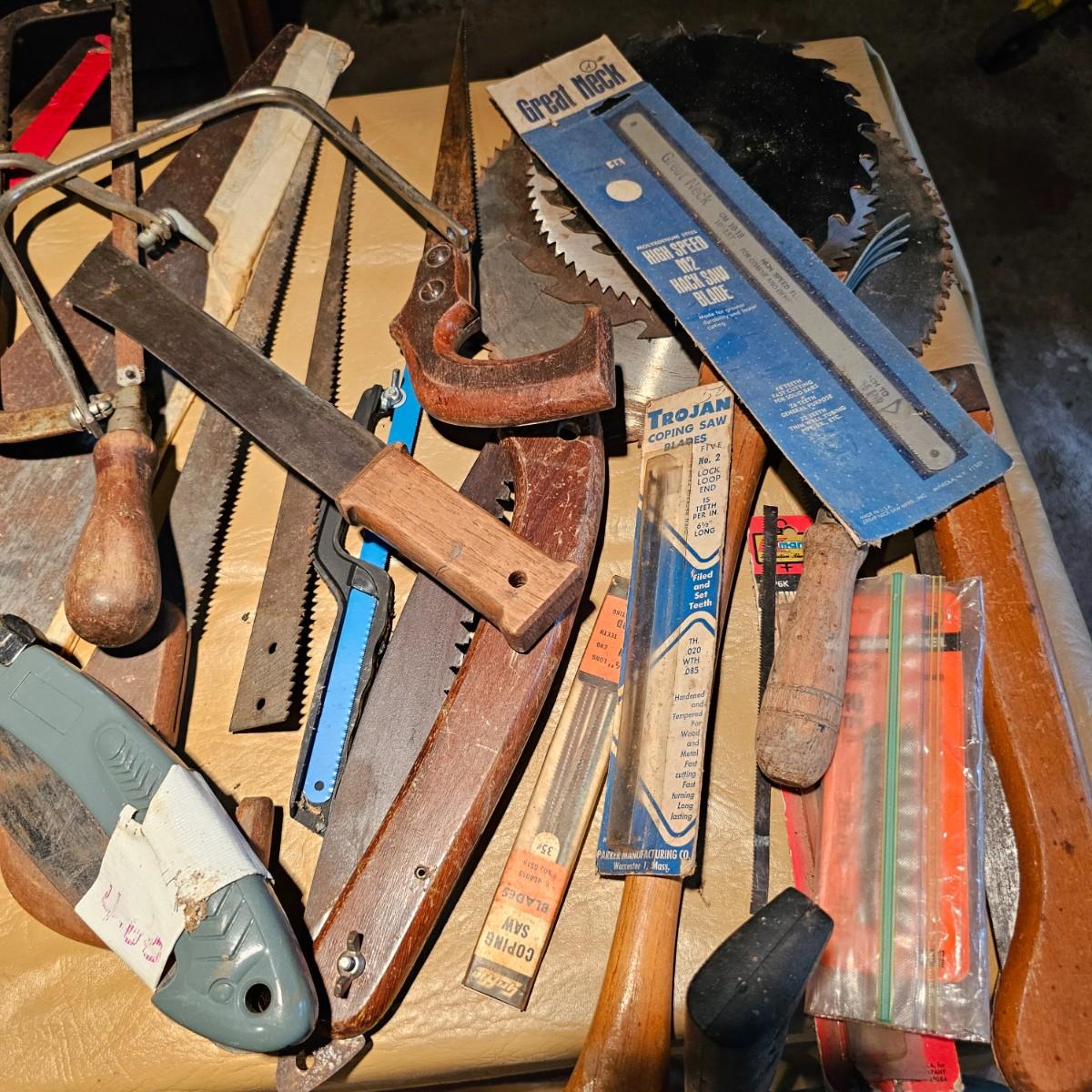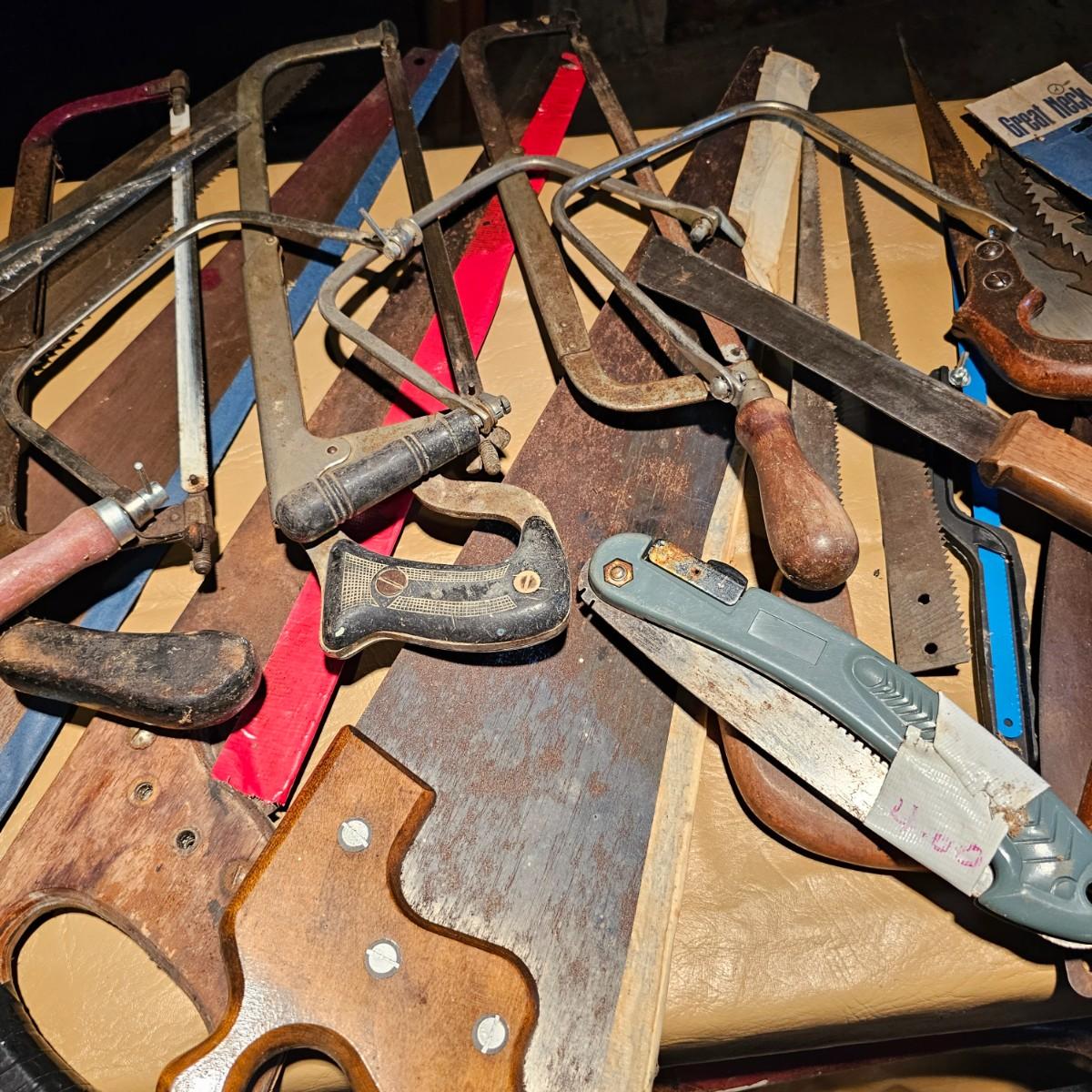 Large assortment of hand saws, coping saws, hacksaws, tree bow saws, drywall saws, machetes, others. Cross cut, machete and hand saws all average 28" long. See photos for details. Local pickup only.