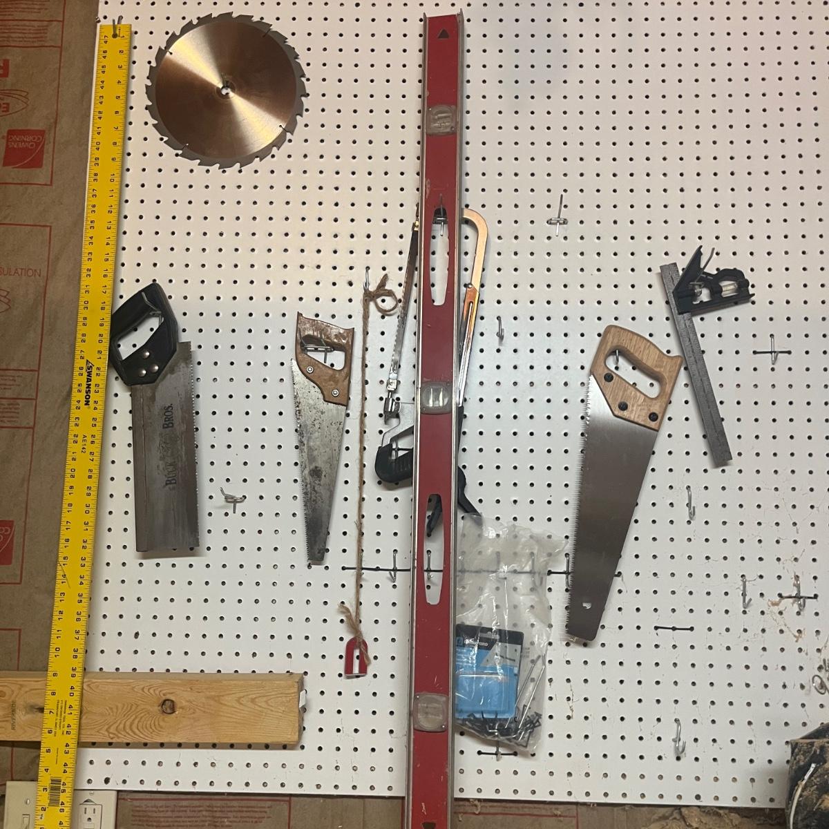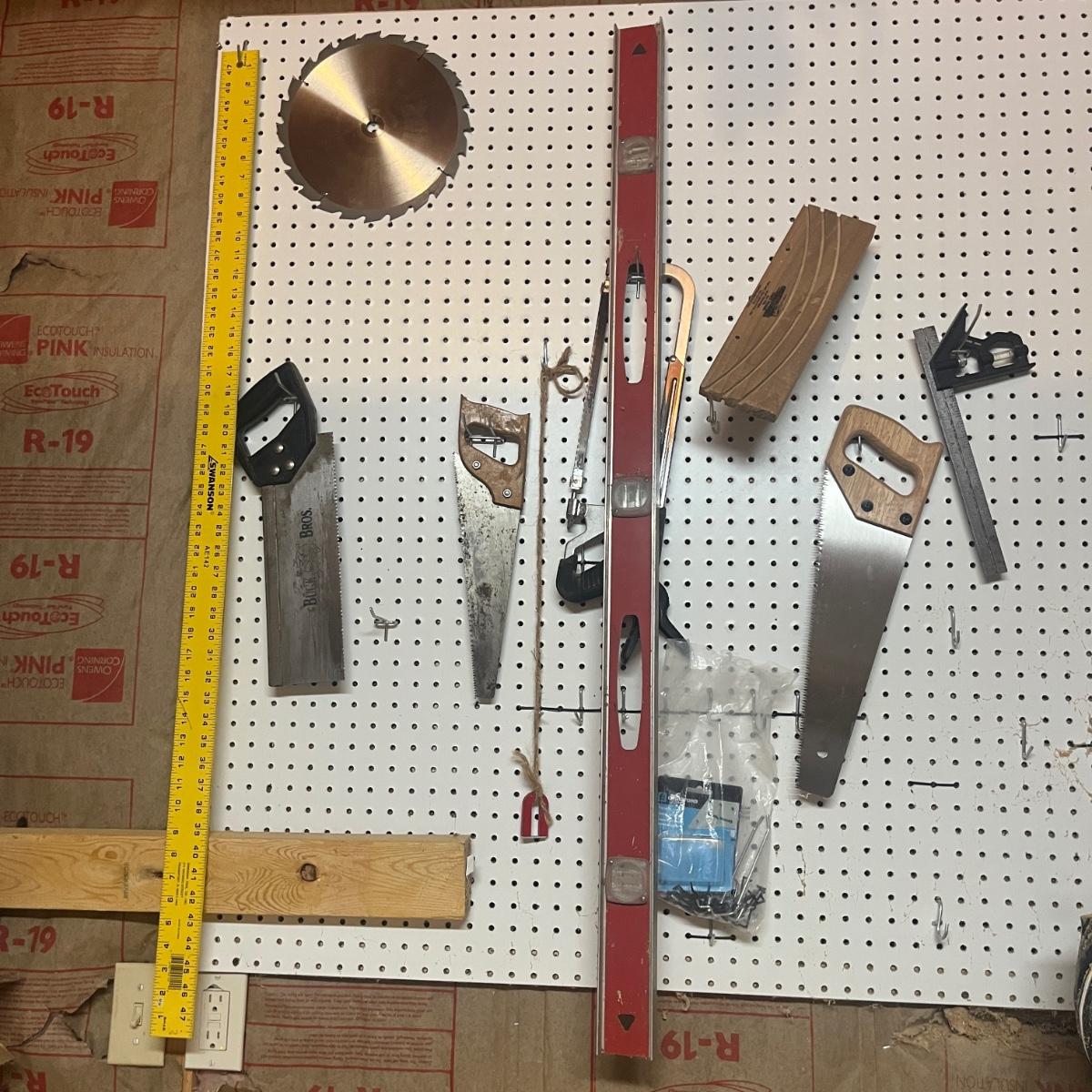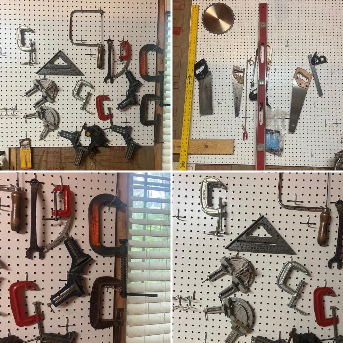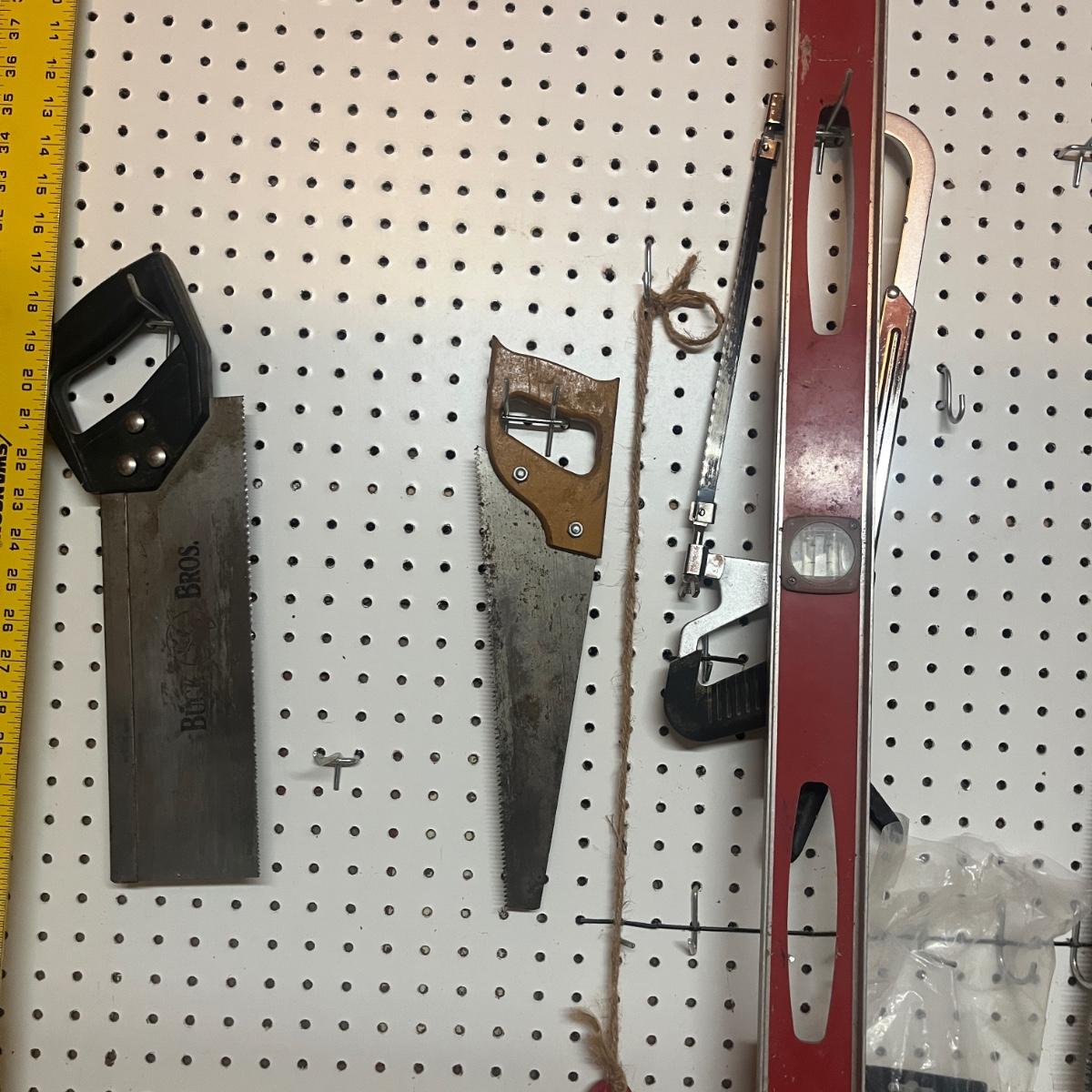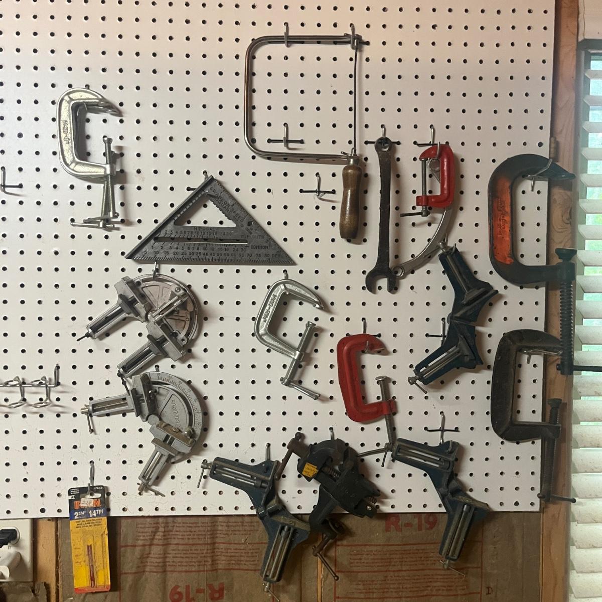 Lot includes hacksaw, coping saw, rough cut saws, C clamps, corner clamps, 4’ level, triangle, miter box and more. Peg board is not included.