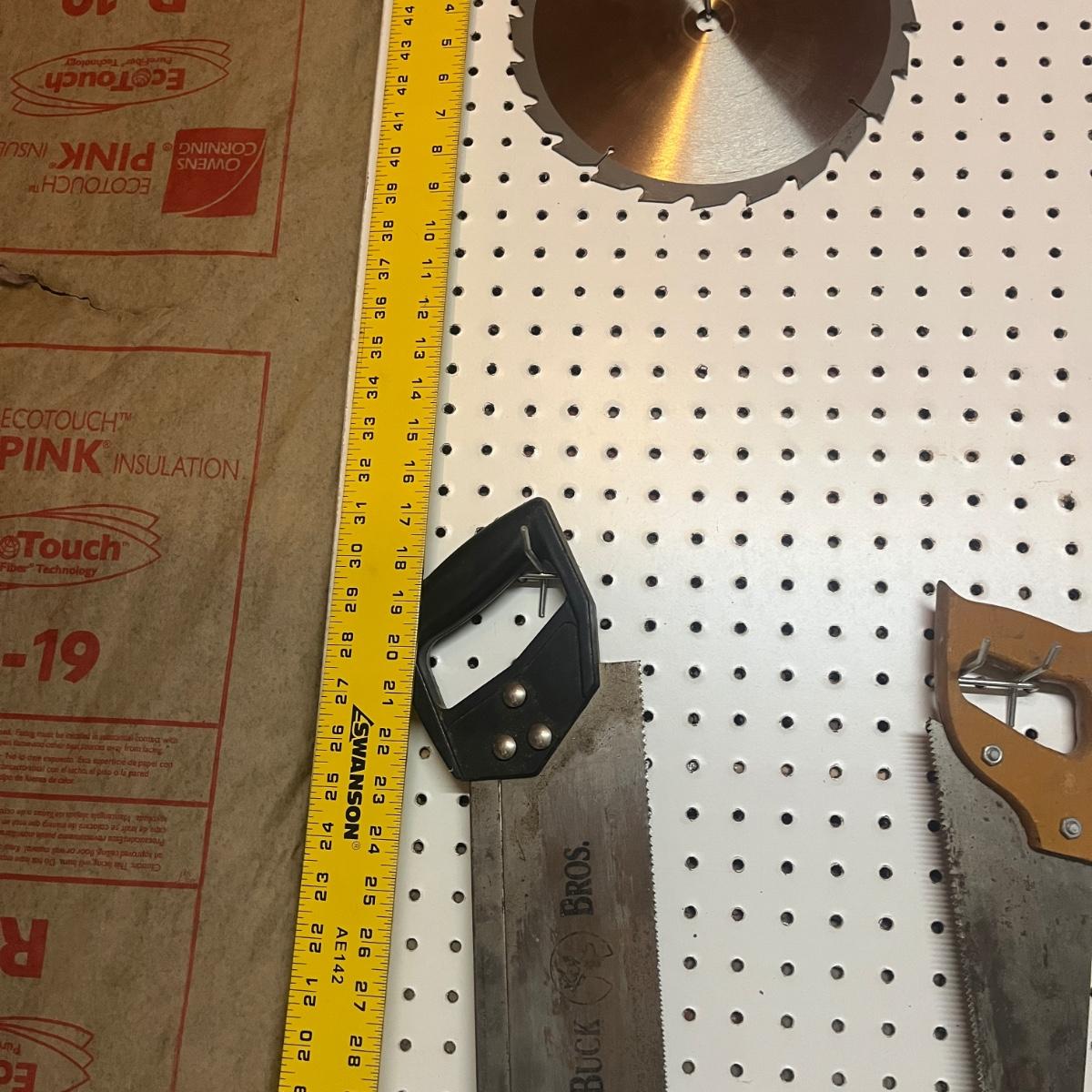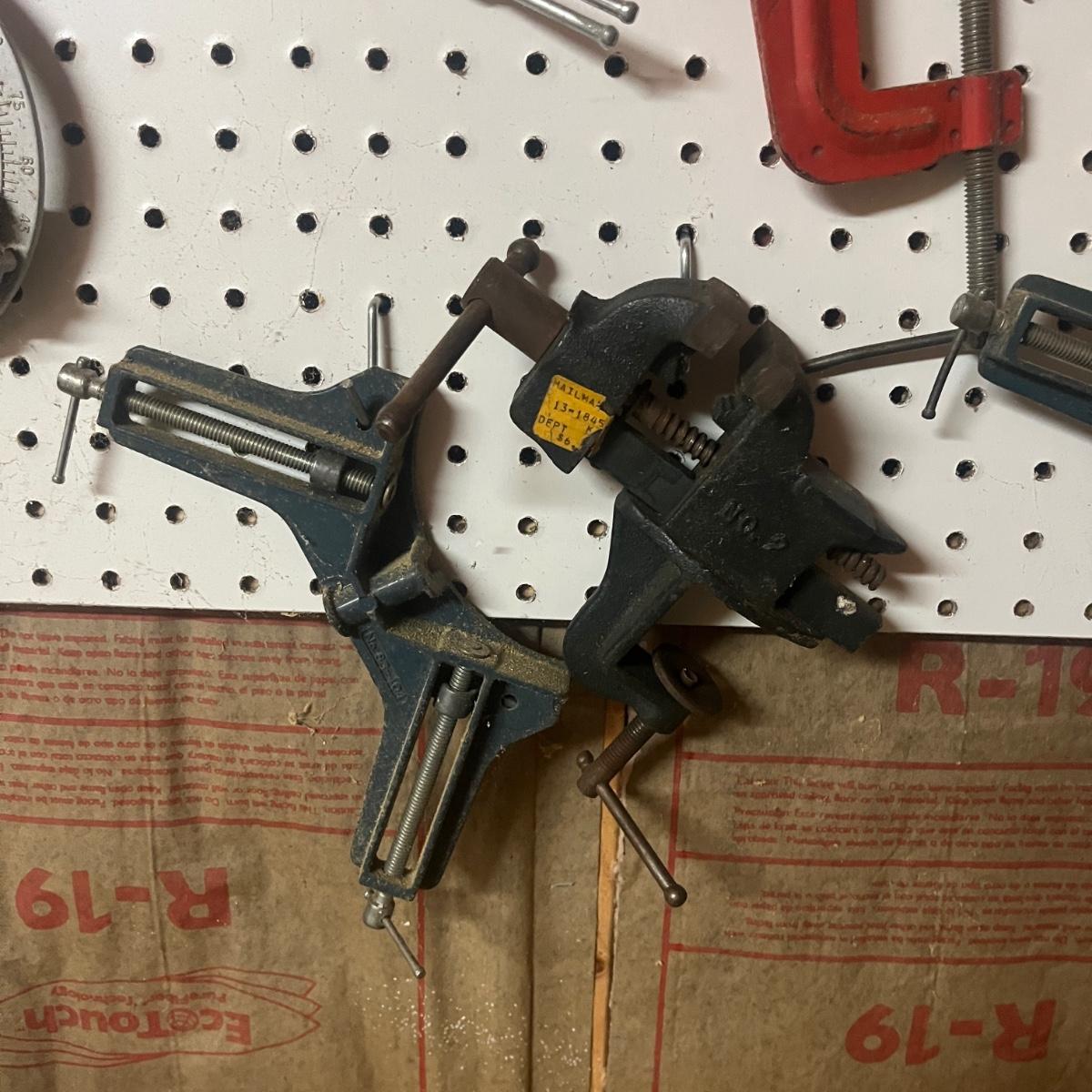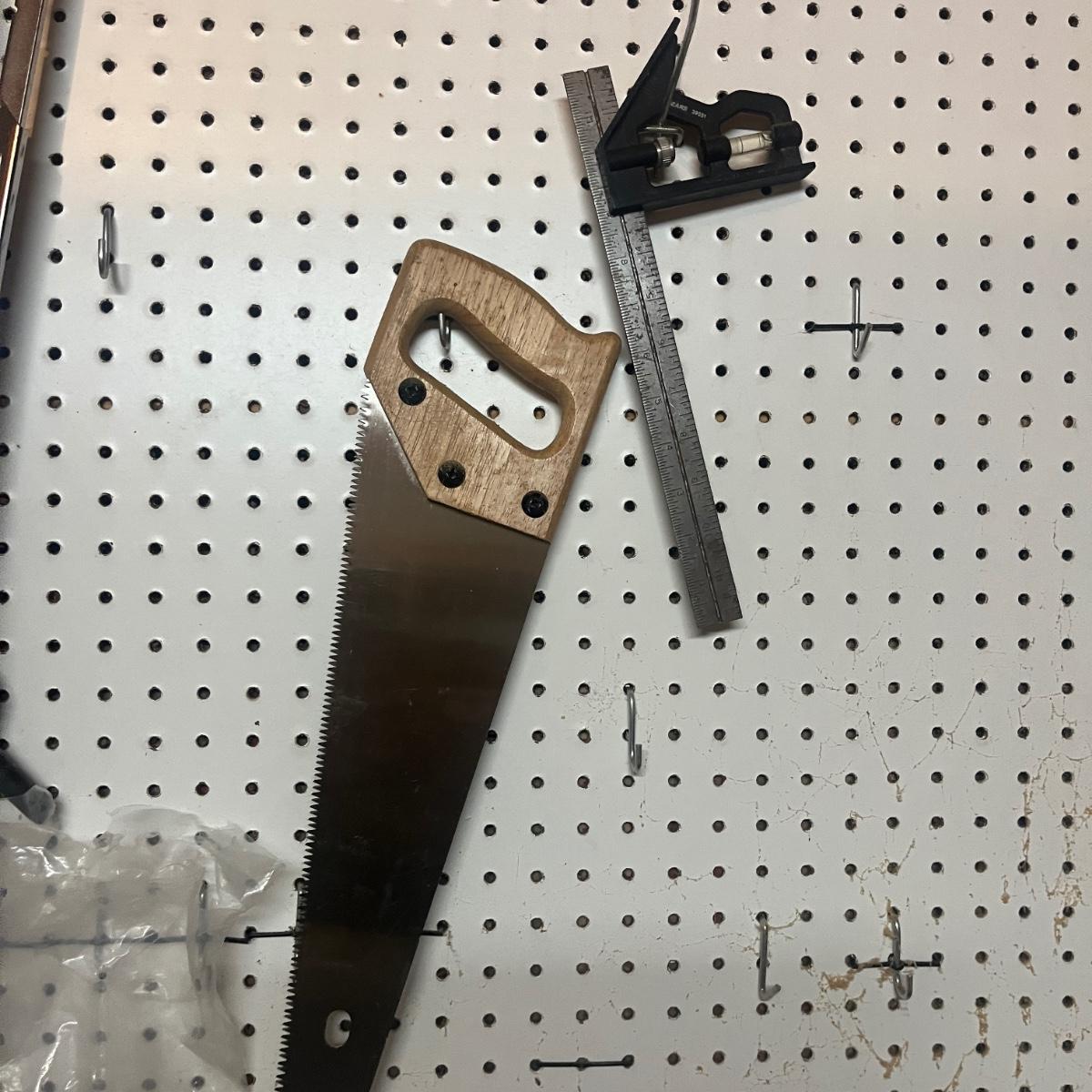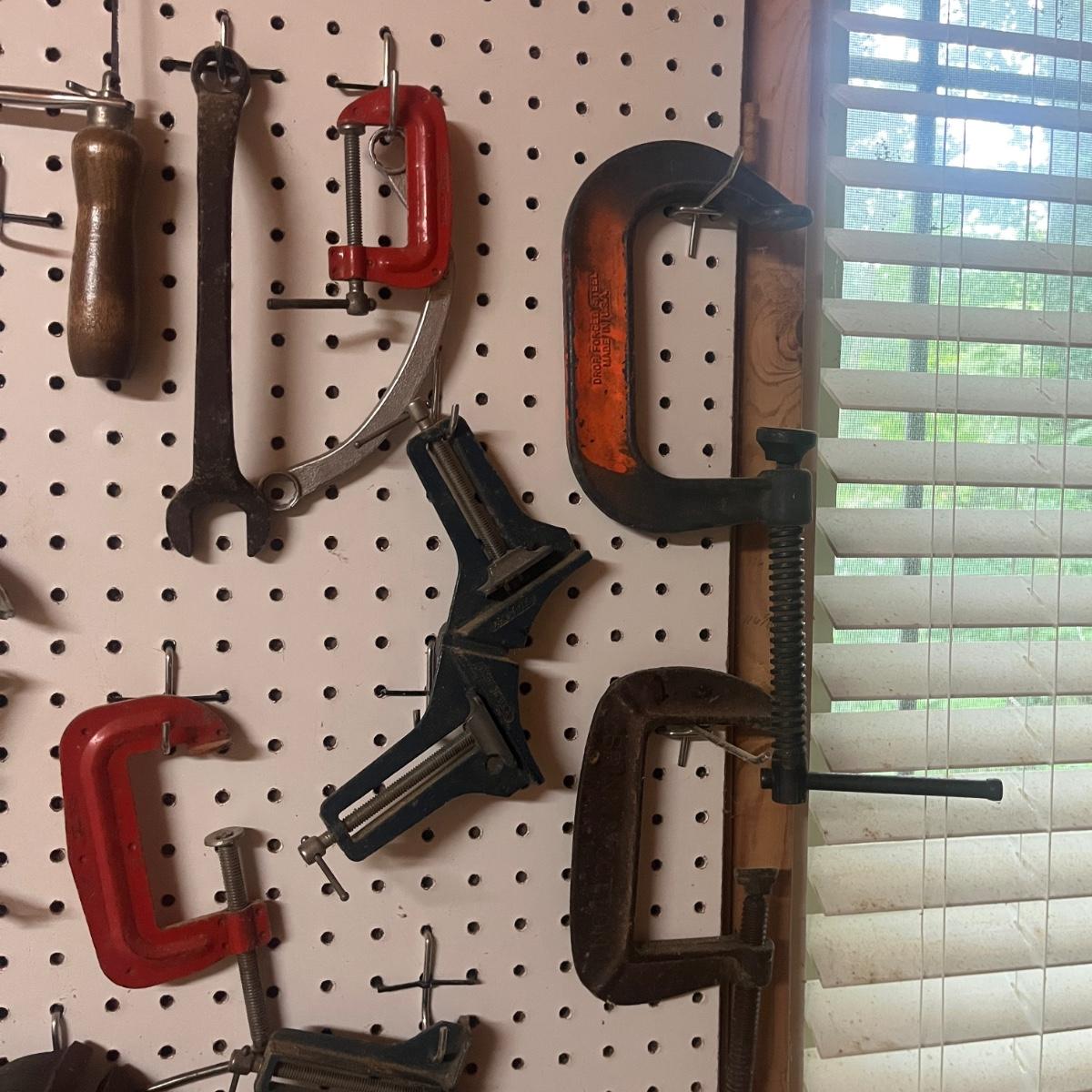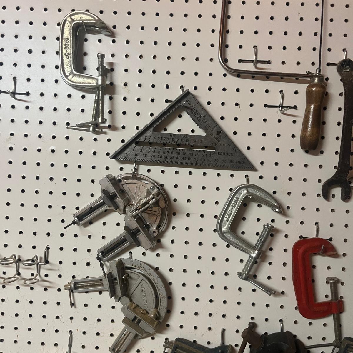 Lot includes hacksaw, coping saw, rough cut saws, C clamps, corner clamps, 4’ level, triangle, miter box and more. Peg board is not included.