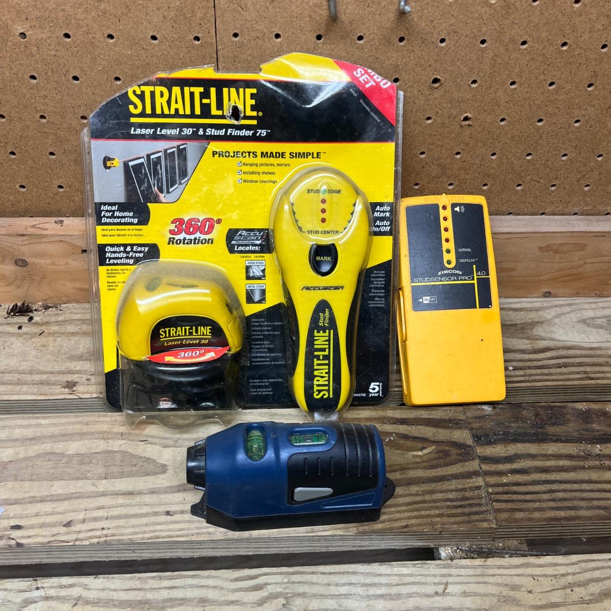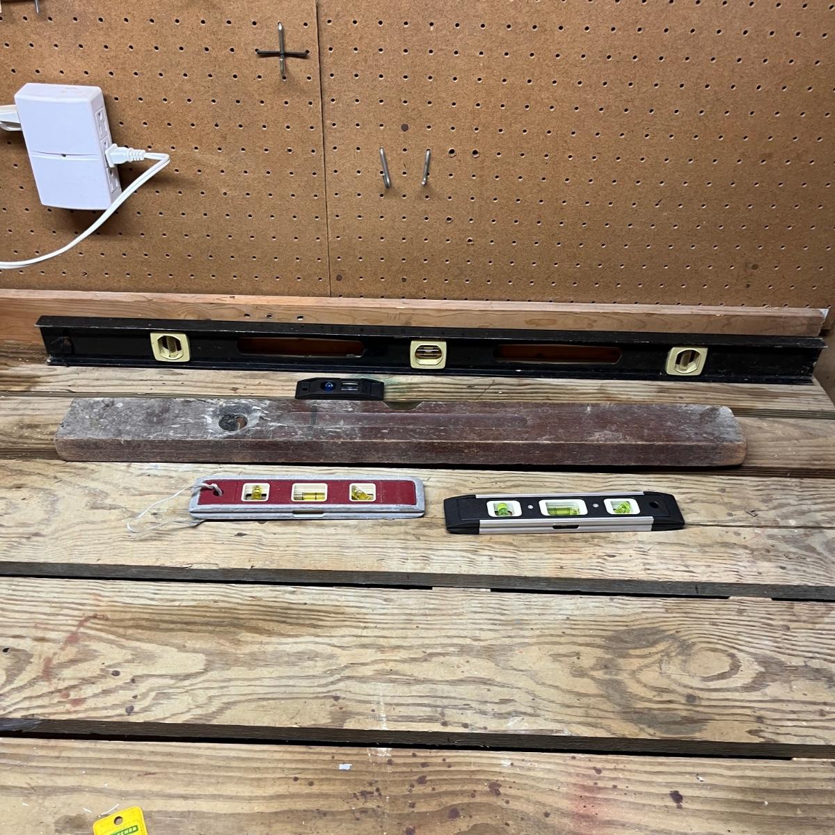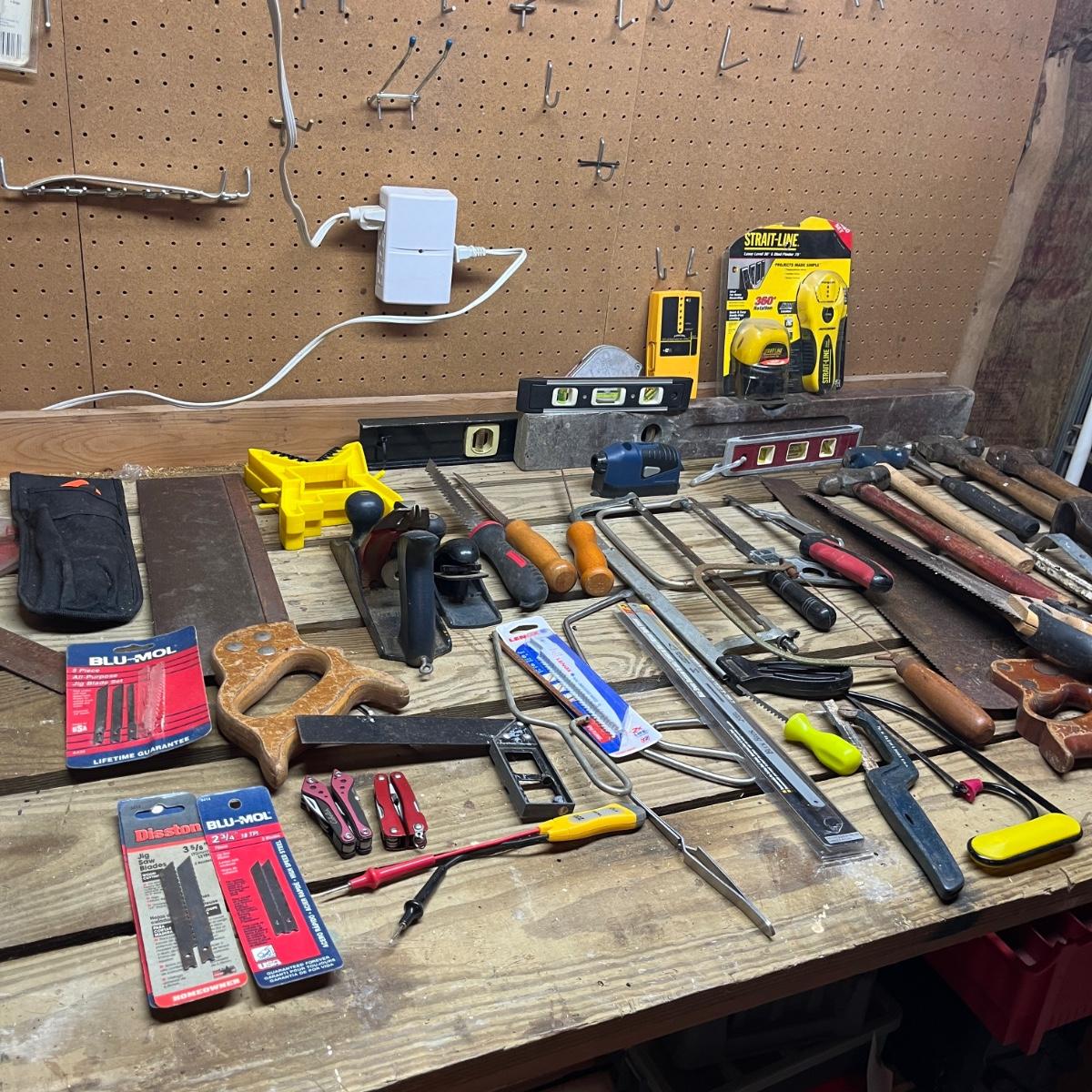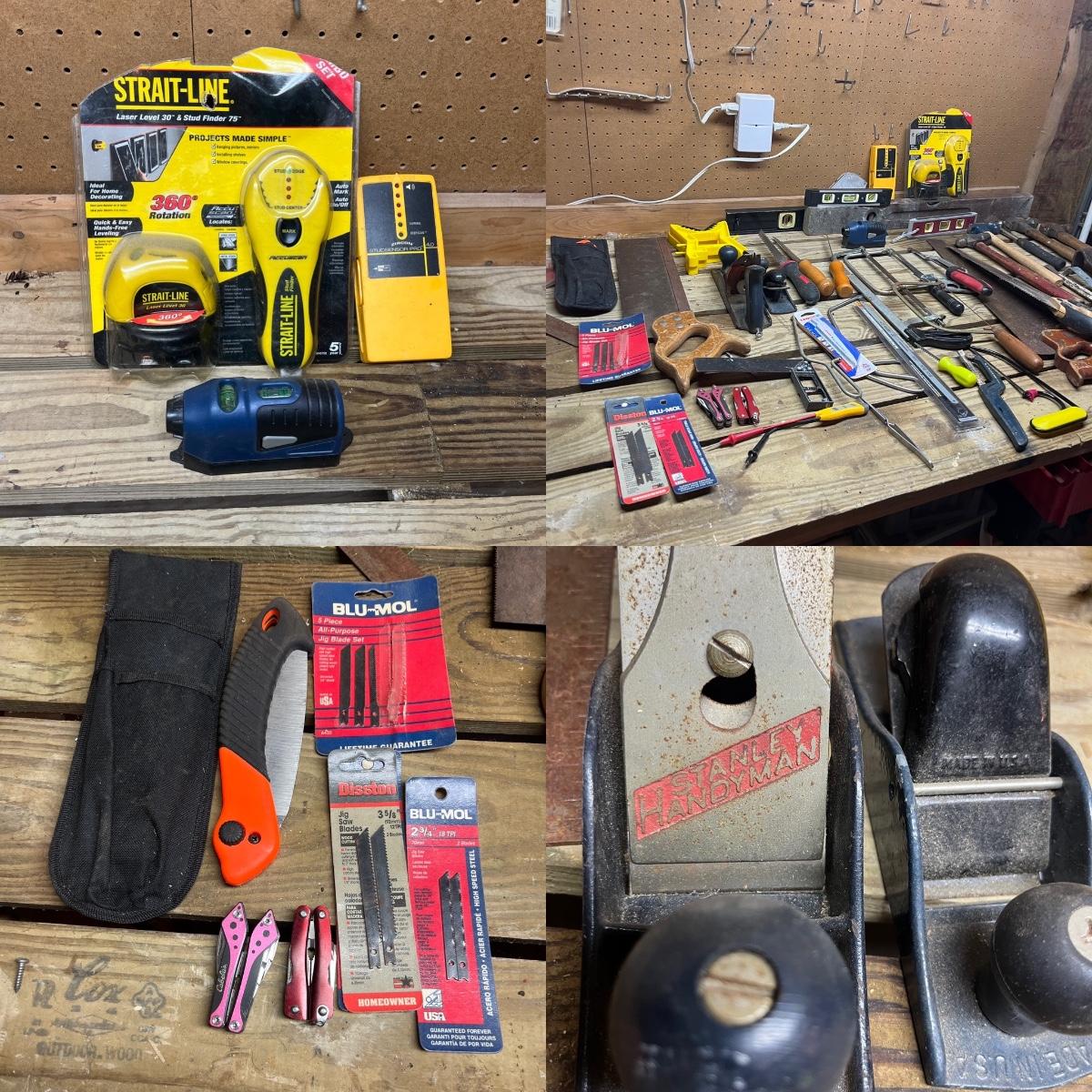 This large lot includes hacksaws, toolbox saw, coping saws, ball peen hammer, claw hammers, levels, Stanley wood plane, stud finders and more. Largest level measures 36” long.