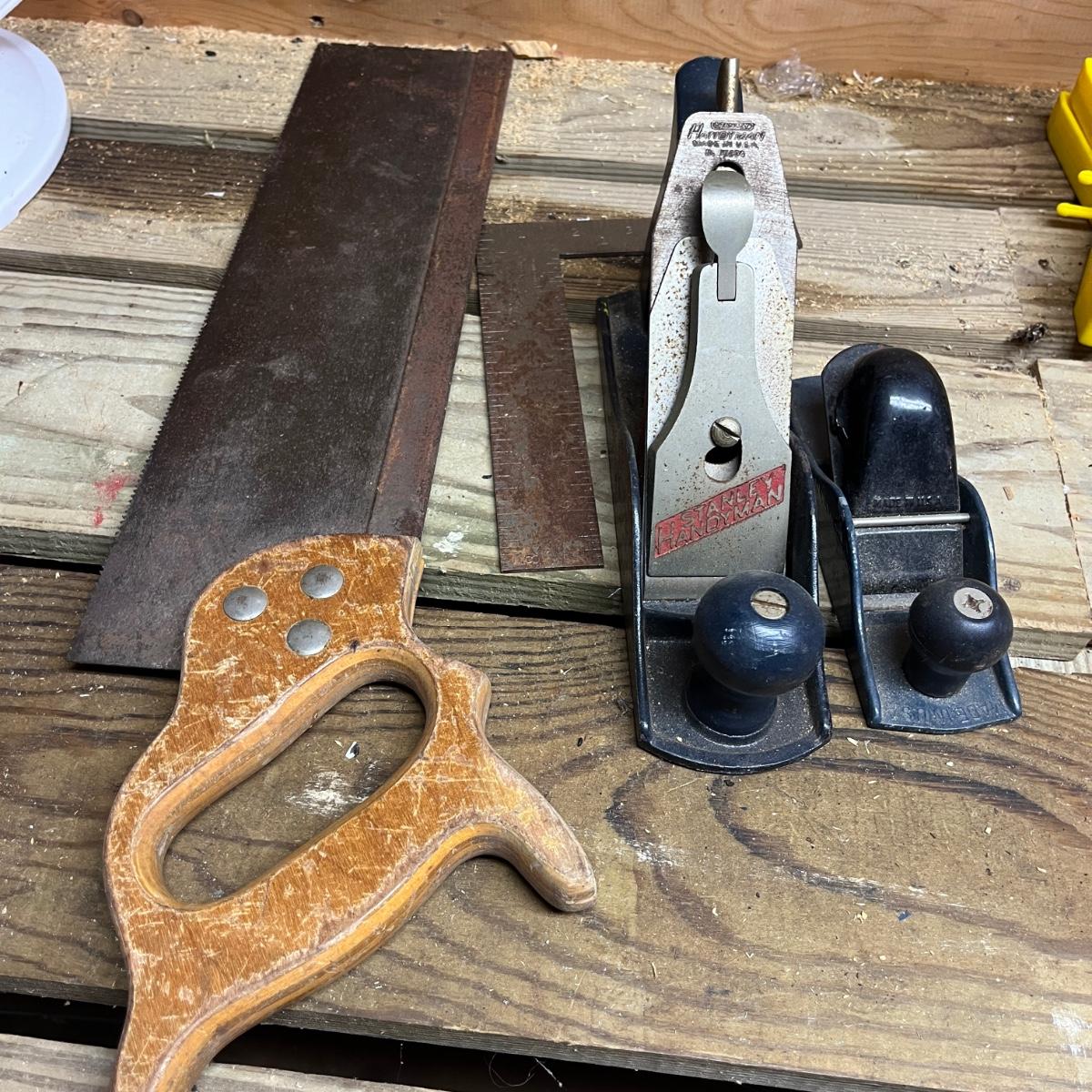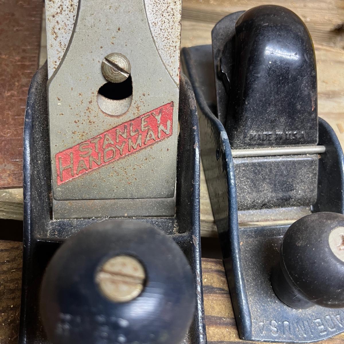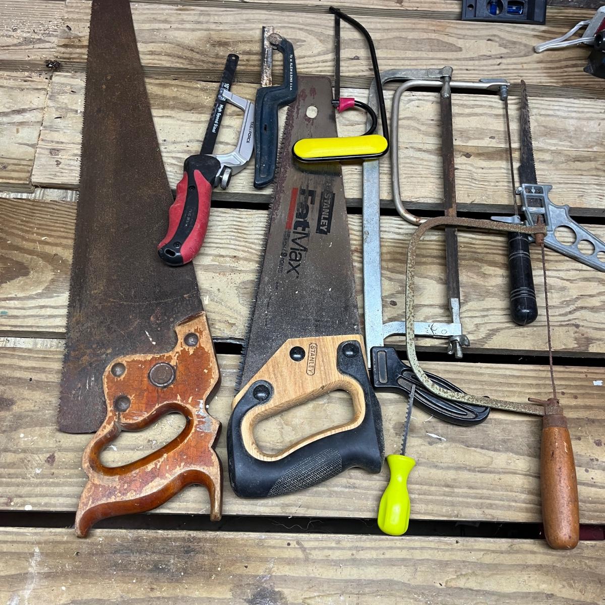 This large lot includes hacksaws, toolbox saw, coping saws, ball peen hammer, claw hammers, levels, Stanley wood plane, stud finders and more. Largest level measures 36” long.