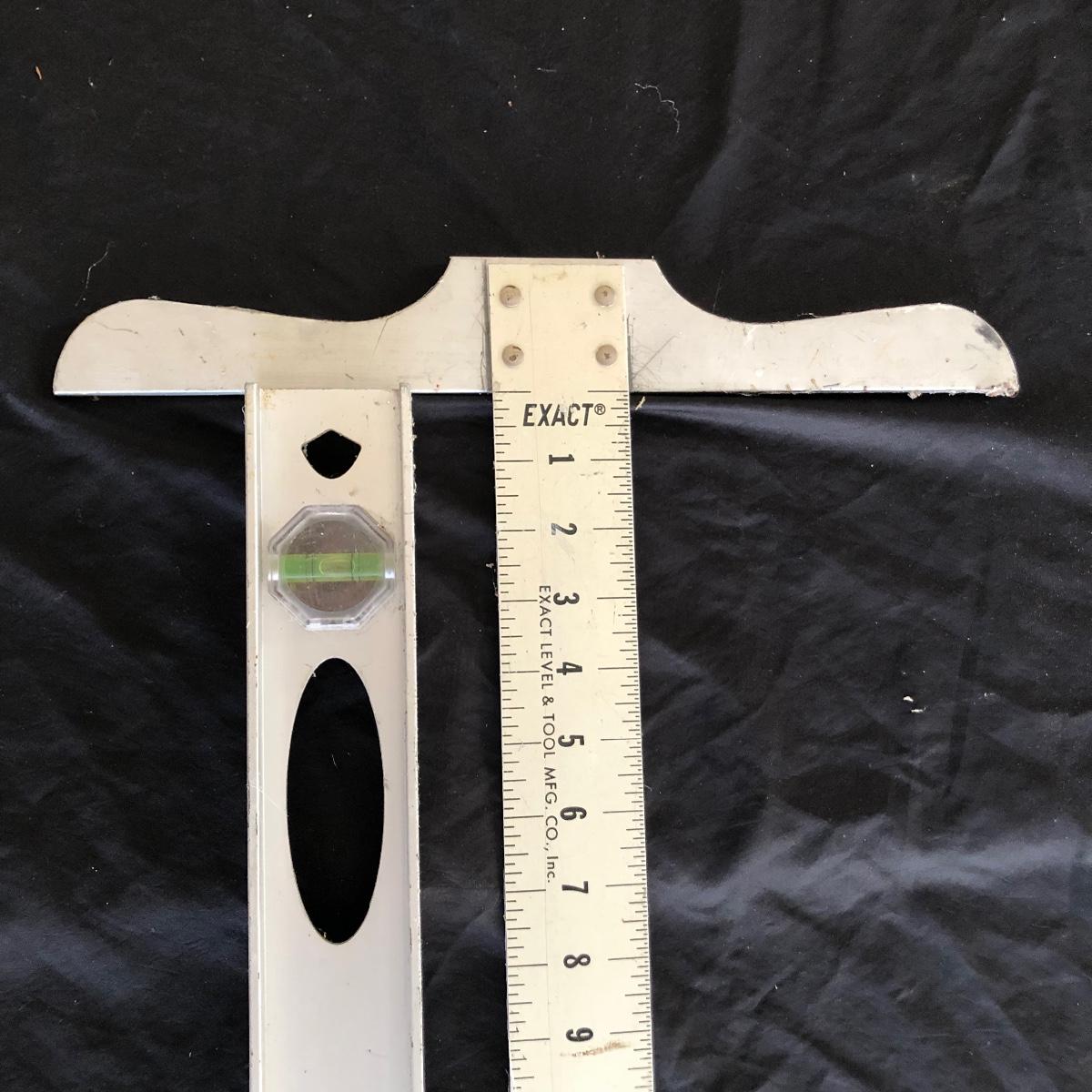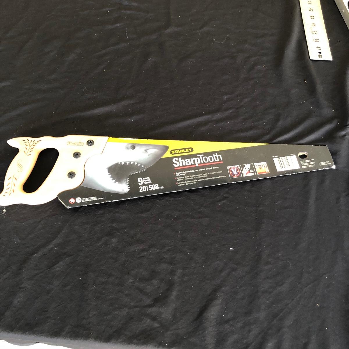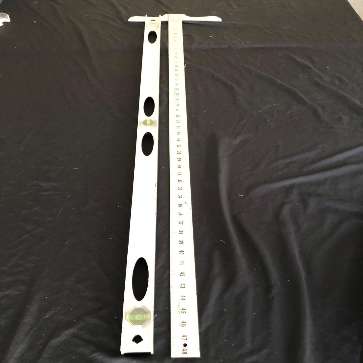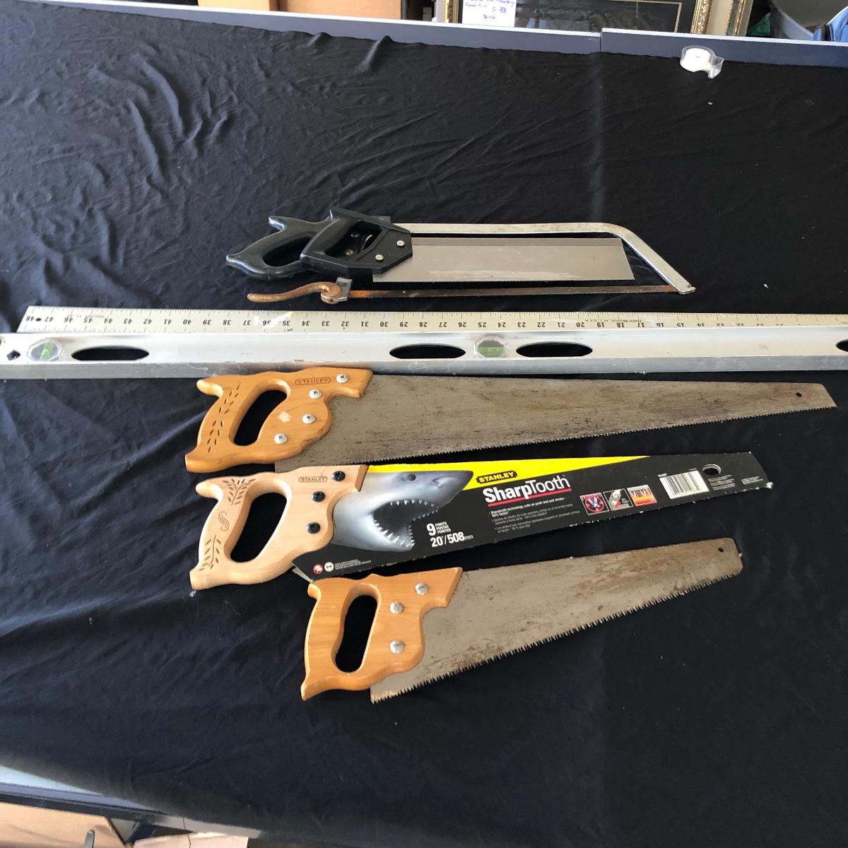 Lot includes 48” aluminum level and t square, two Stanley saws, Great Neck saw, large hacksaw and a mitre saw.