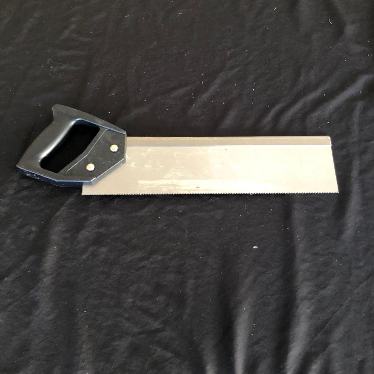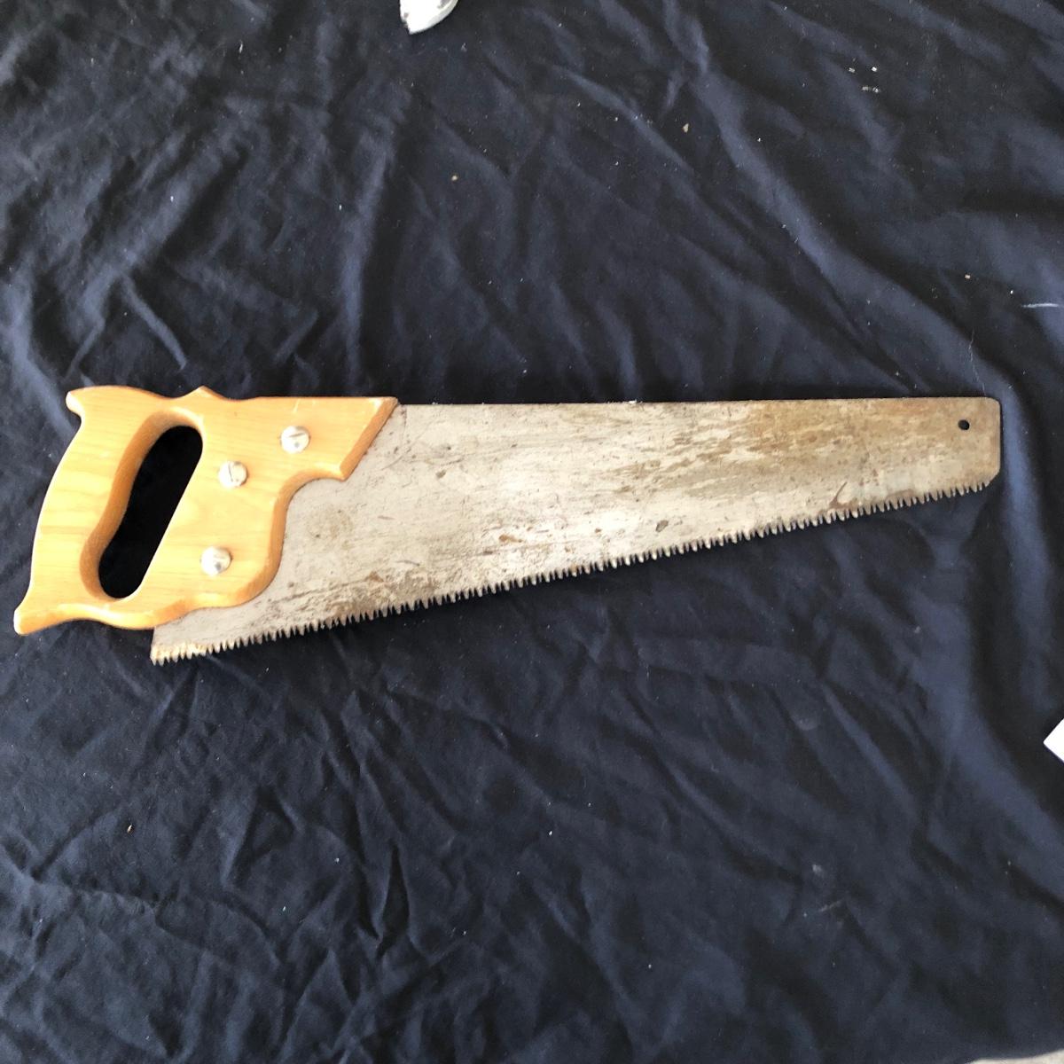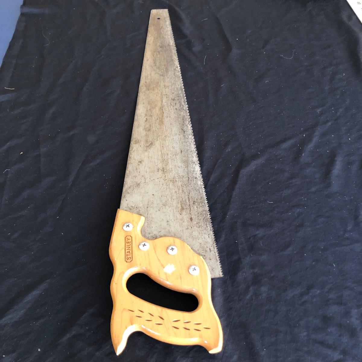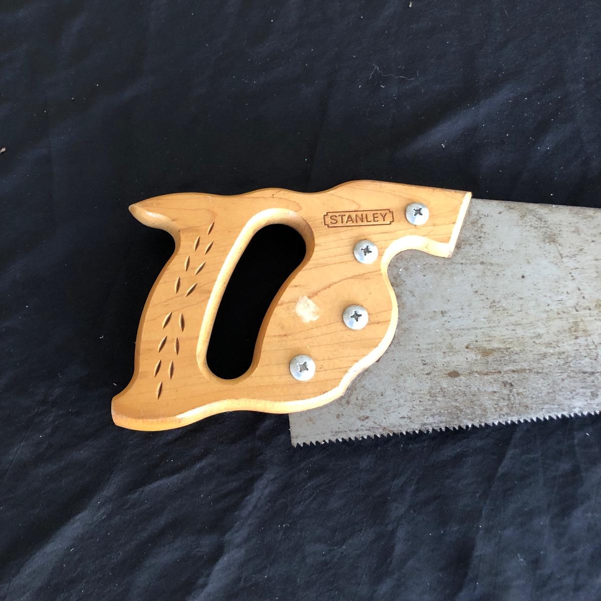 Lot includes 48” aluminum level and t square, two Stanley saws, Great Neck saw, large hacksaw and a mitre saw.