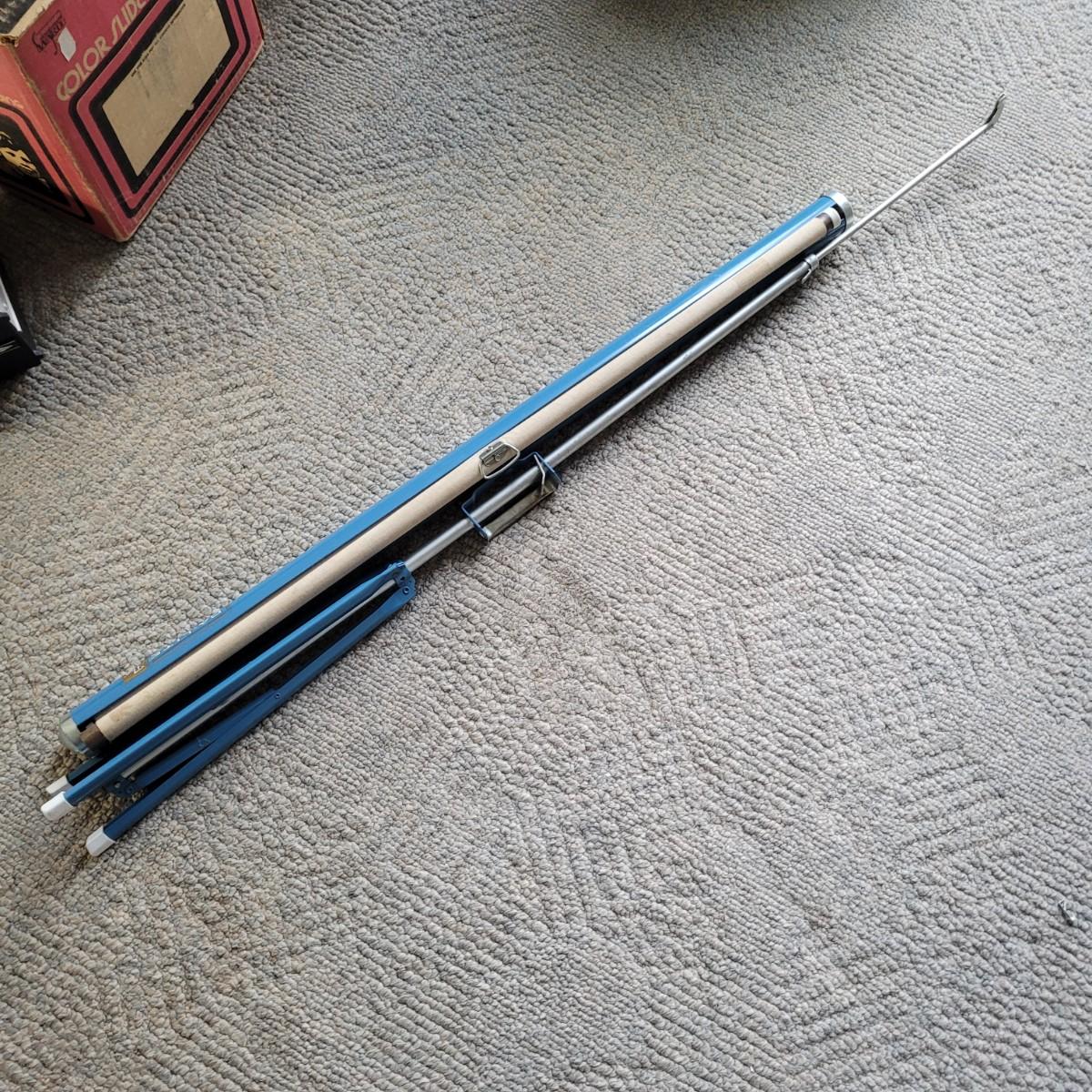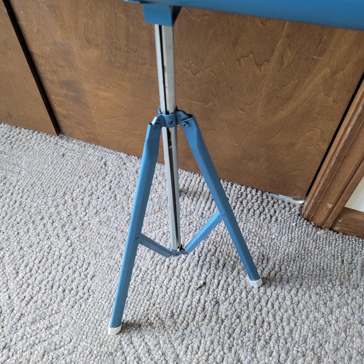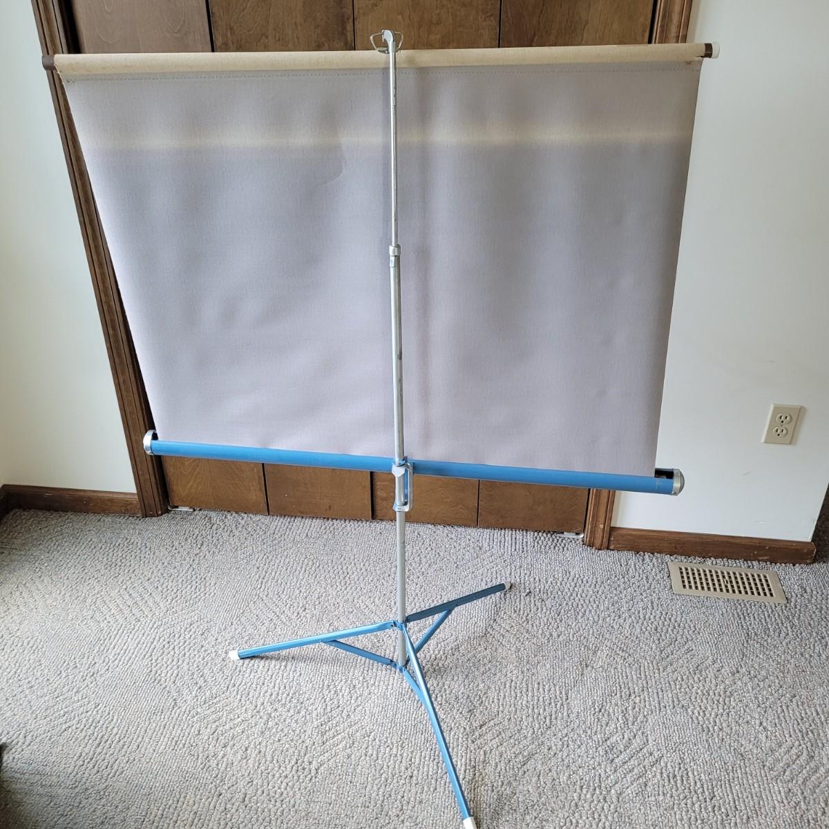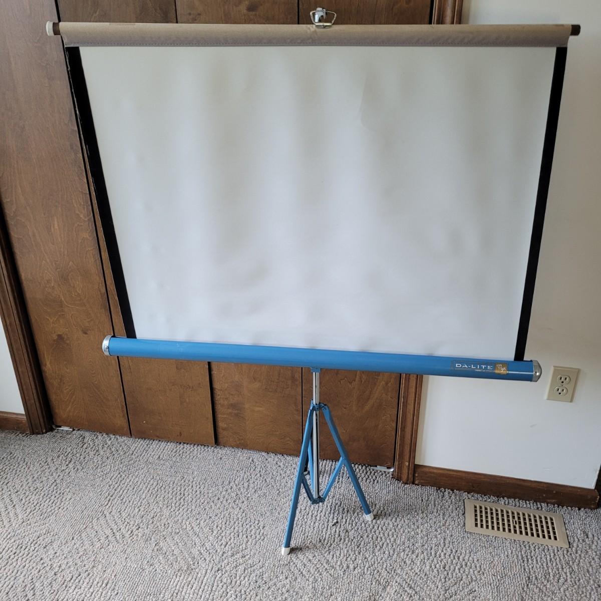 This lot includes one Sawyer's brand Rotomatic 737AQ slide projector and DaLite brand projector screen. This model is a vintage slide projector designed for projecting 2x2 slides. The projector powered on when plugged in. It features a retractable power cord and carrying handle. The projector measures 11" x 10.5" x 6.5"H and still has its original box. The screen is a DaLite brand Flyer model in blue metal. It features retractable parts for adjustment and easy breakdown.